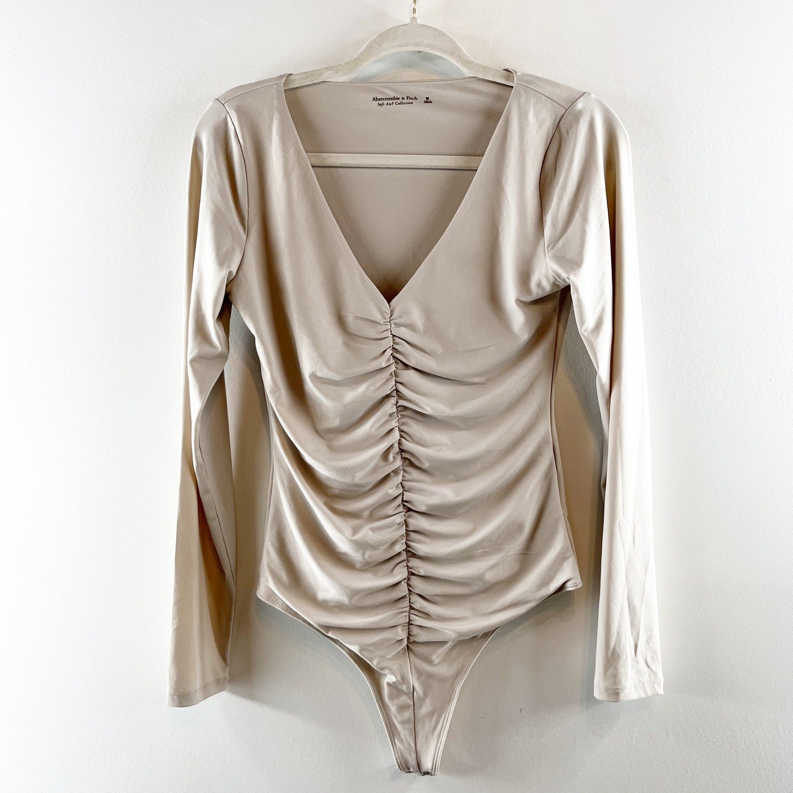 Abercrombie & Fitch Long-Sleeve Ruched V-Neck Bodysuit Cream Medium