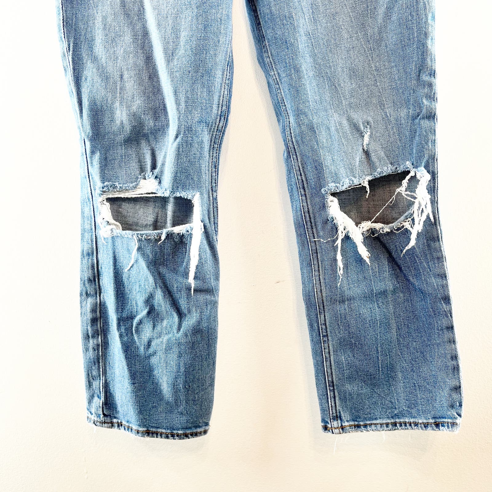 busted knees, high waisted, cotton, straight leg, destoy, distressed, medium wash, denim