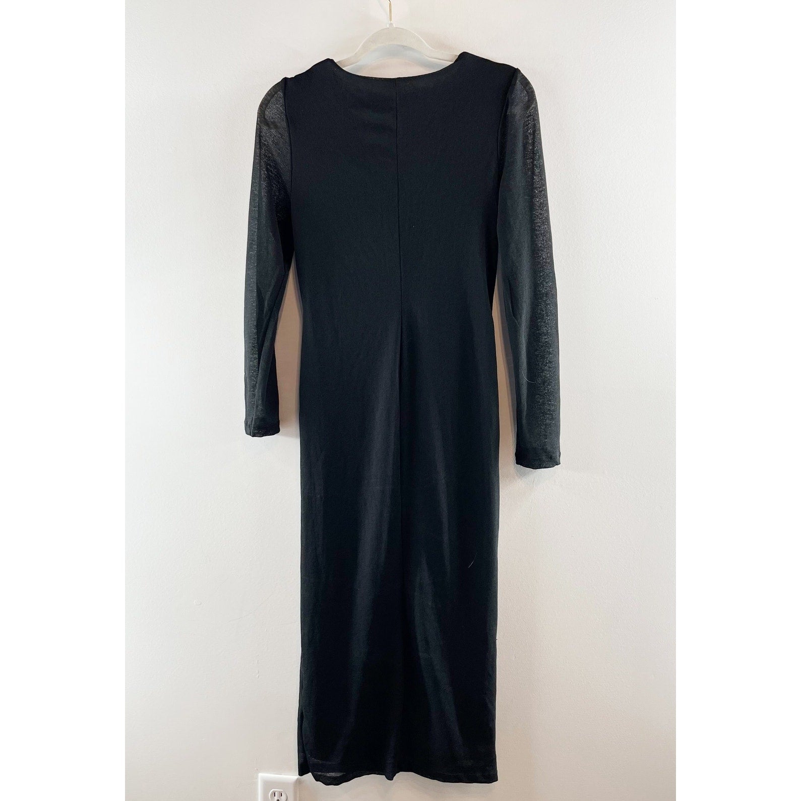 ruched center, lined, sheer long sleeves, front cutout, twist, bodycon, formal, date, event, midi, dress, black