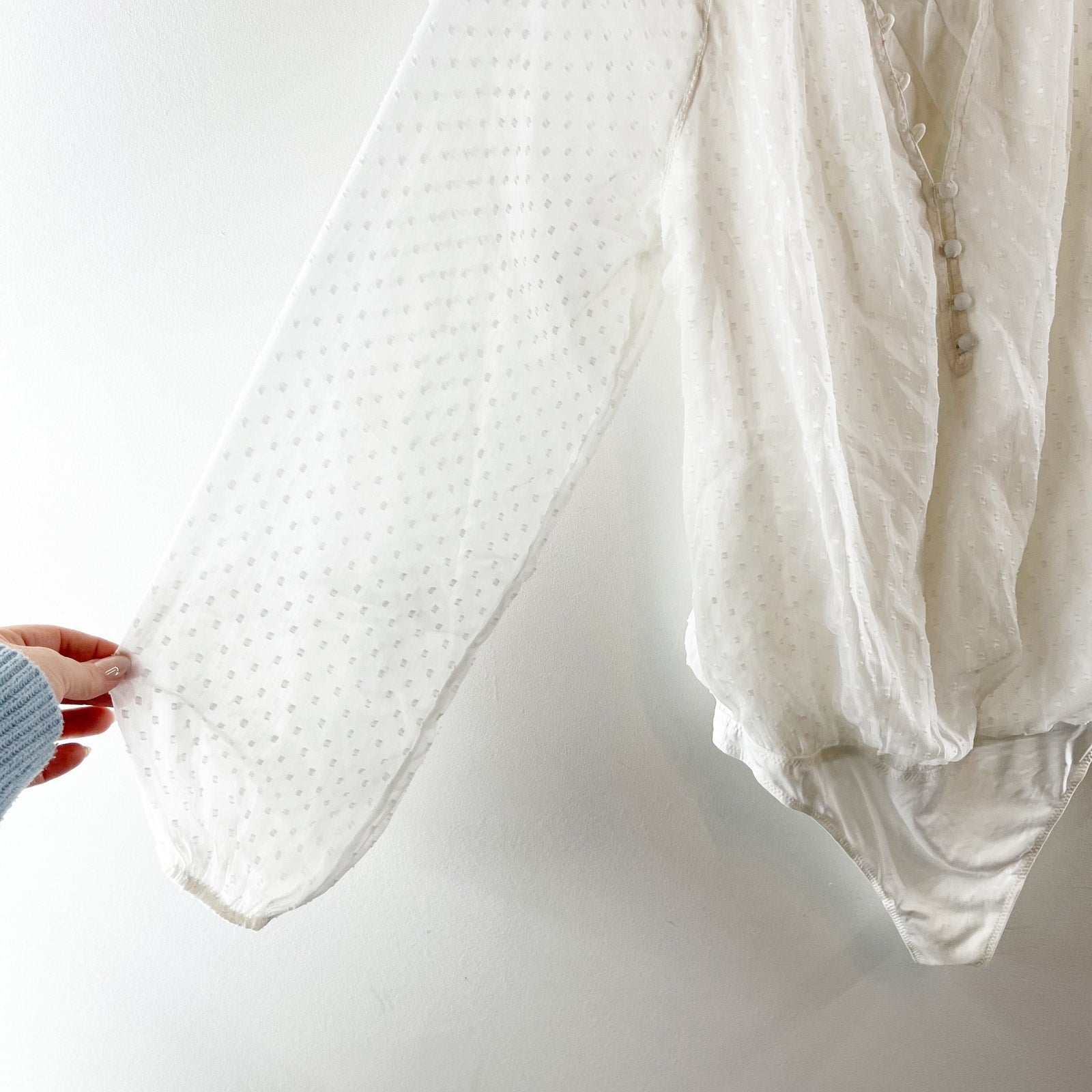 snap button closure, thong, bodysuit, long sheer sleeves, balloon sleeves, swiss dot, white, blouse, top, shirt