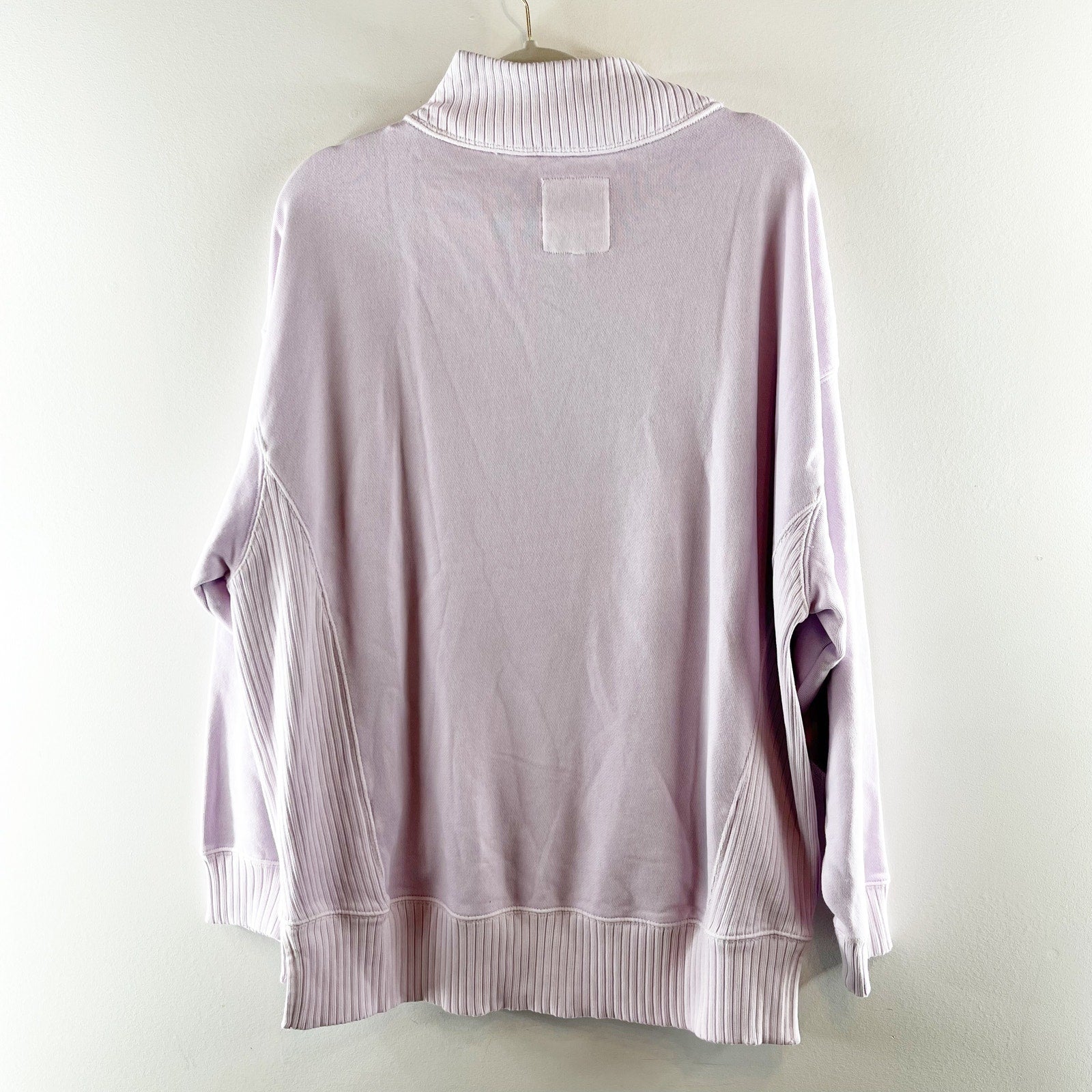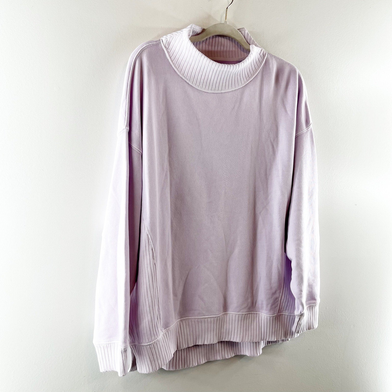 long sleeve, mockneck with side slit, pastel, purple, lavender, lilac, ribbed trim, sweatshirt, pullover, oversized fit