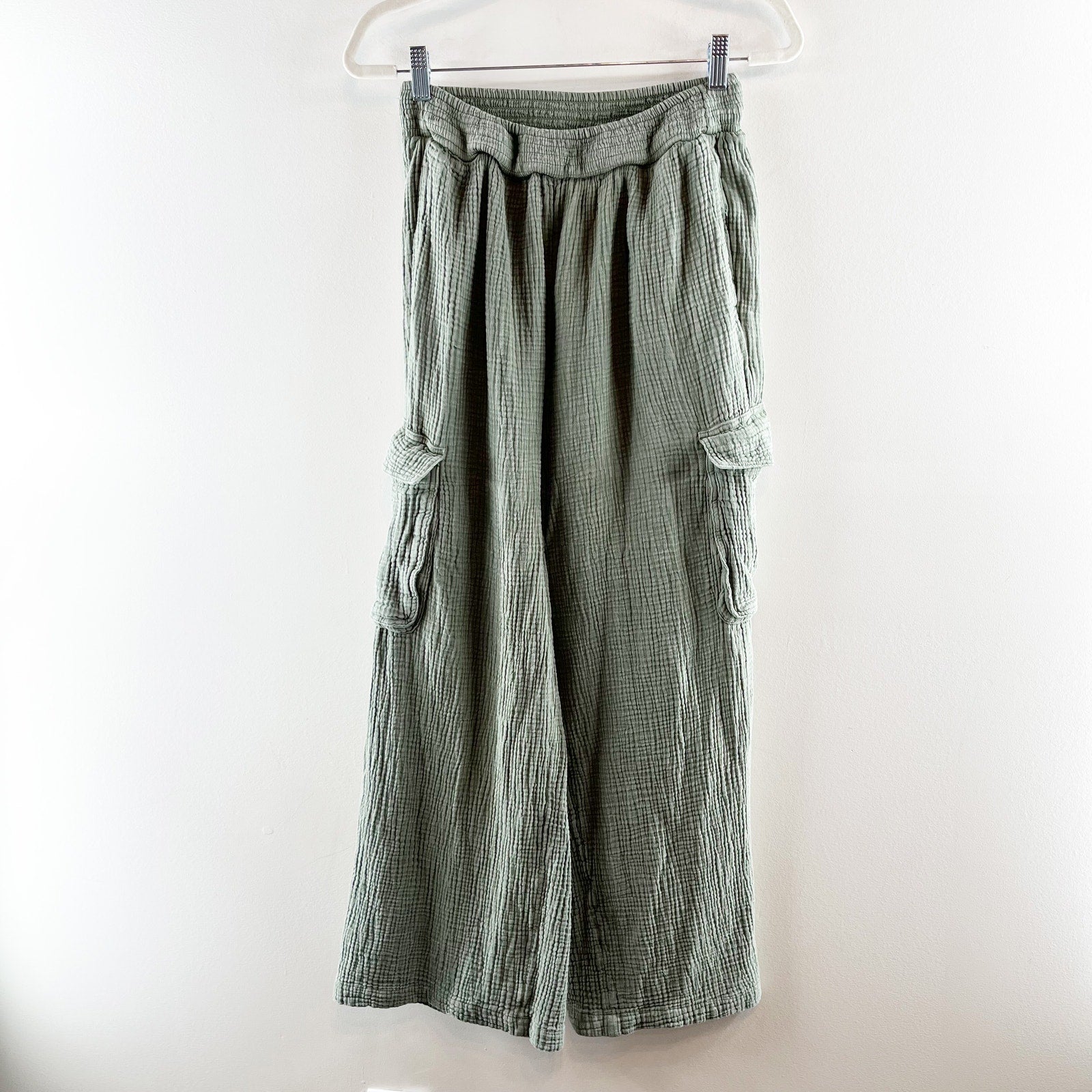 high waisted, smocked waist, cargo side pockets, gauzy cotton, wide leg, beachy, boho, casual, relaxed fit, pockets, green, pants