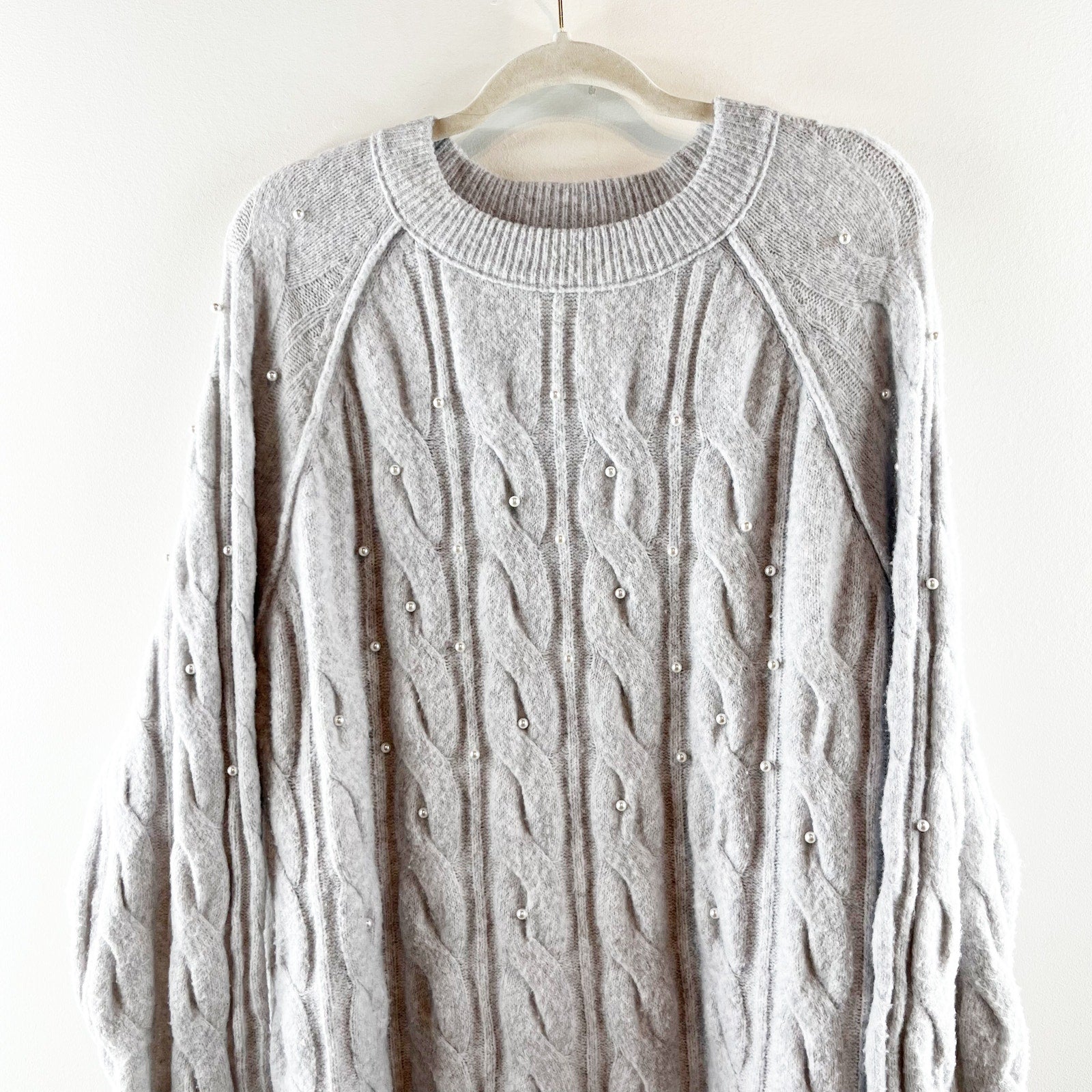 crewneck, cable knit, pearl detail, oversized, soft, warm, cozy, gray
