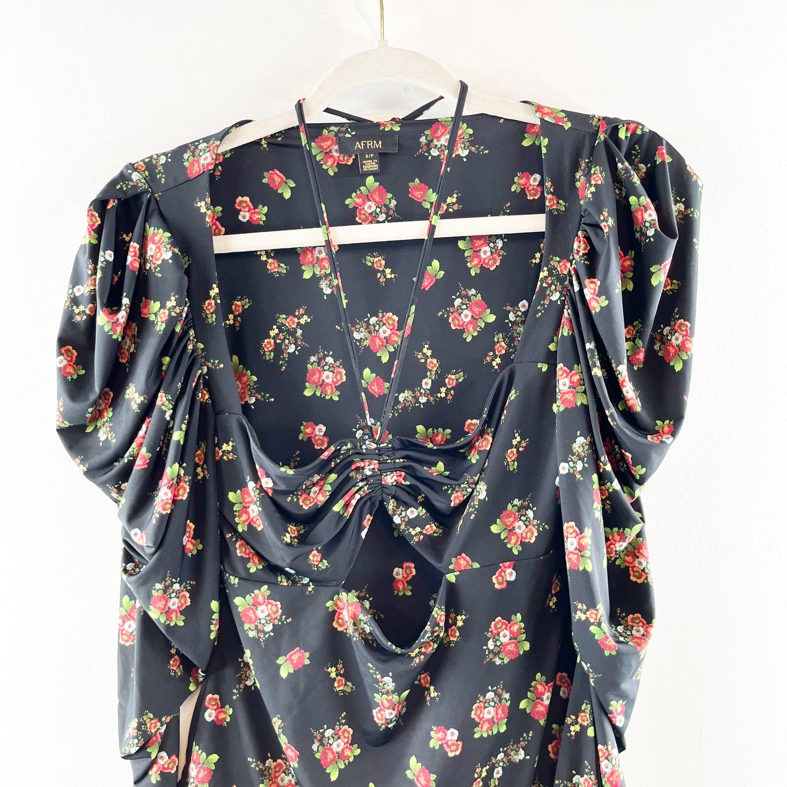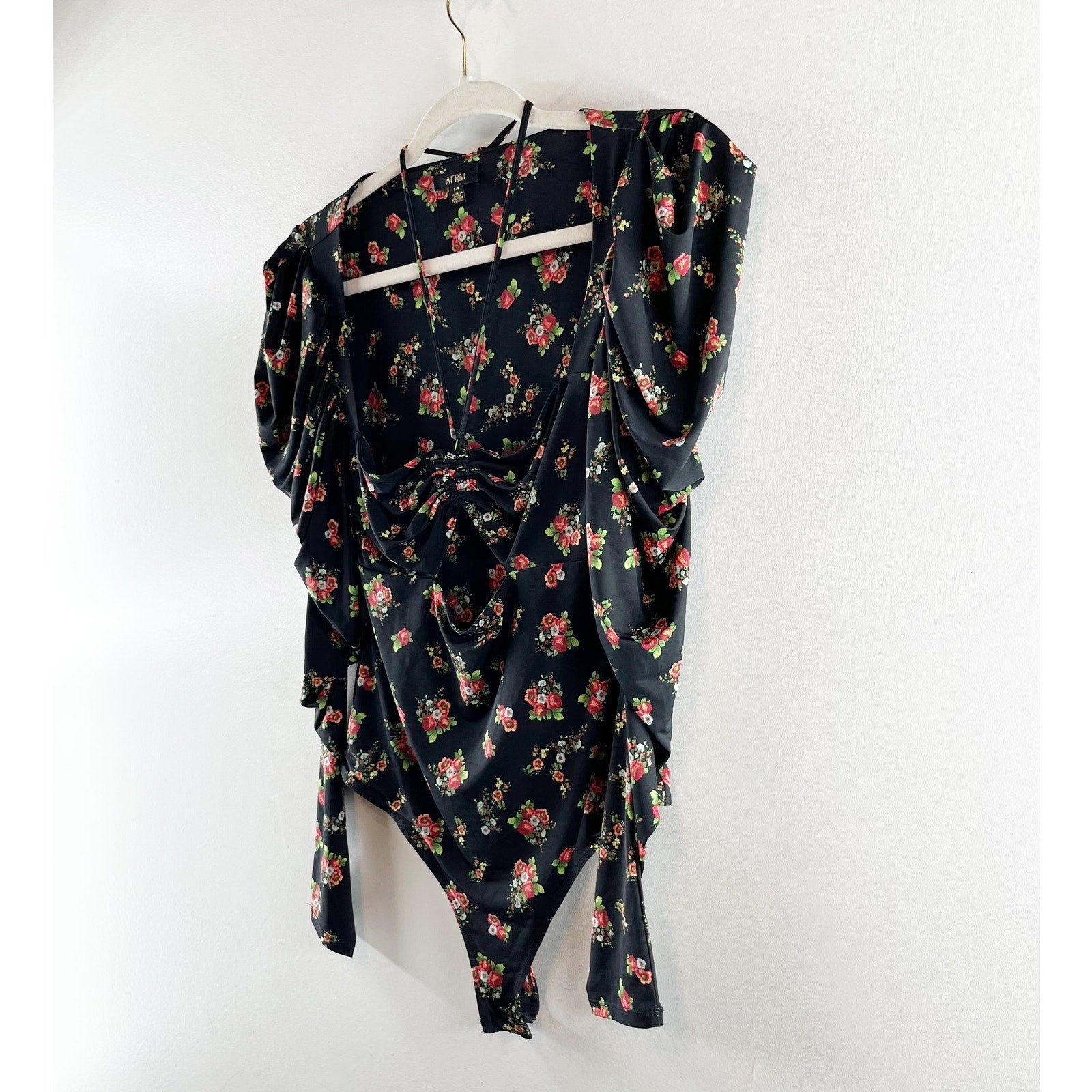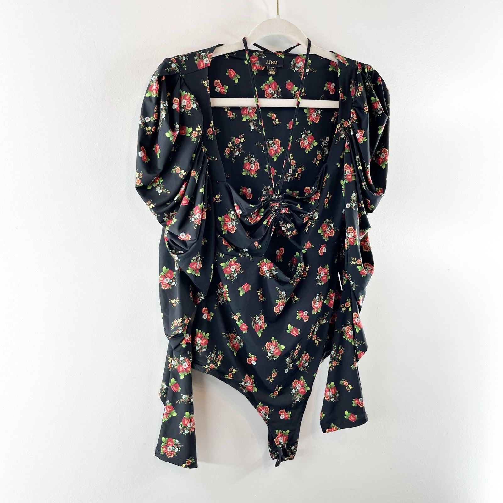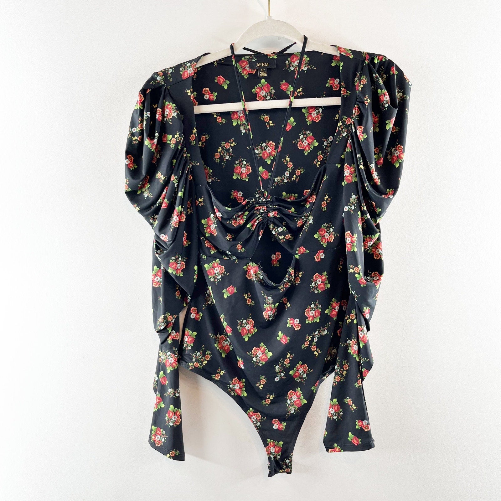 AFRM Coppelia Halter Neck Thong Bodysuit Noir Rose Garden Small