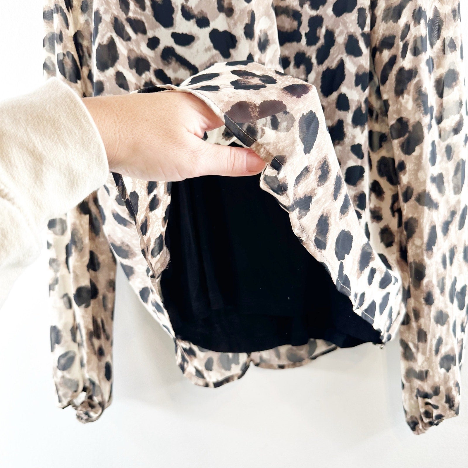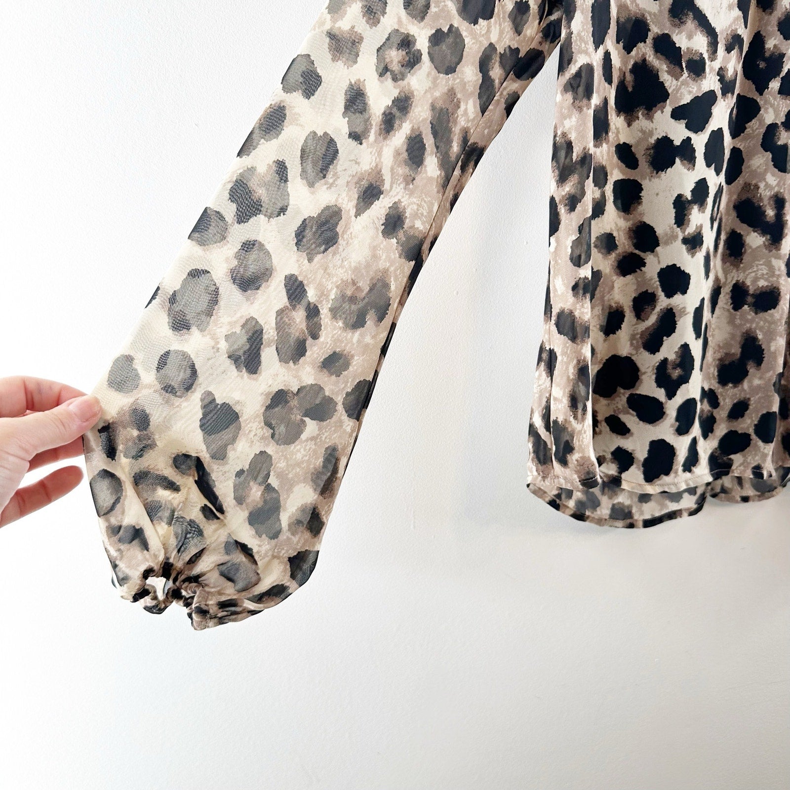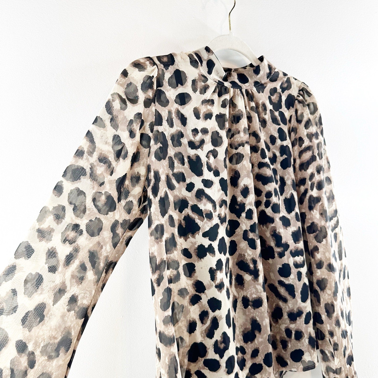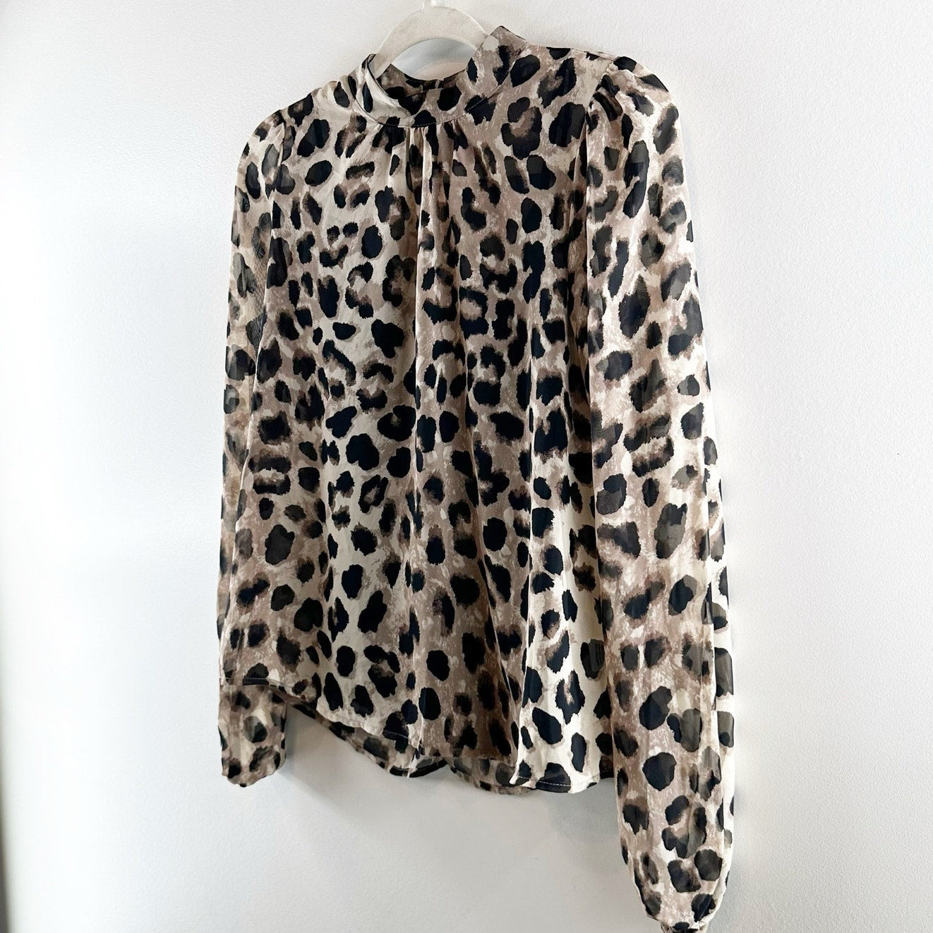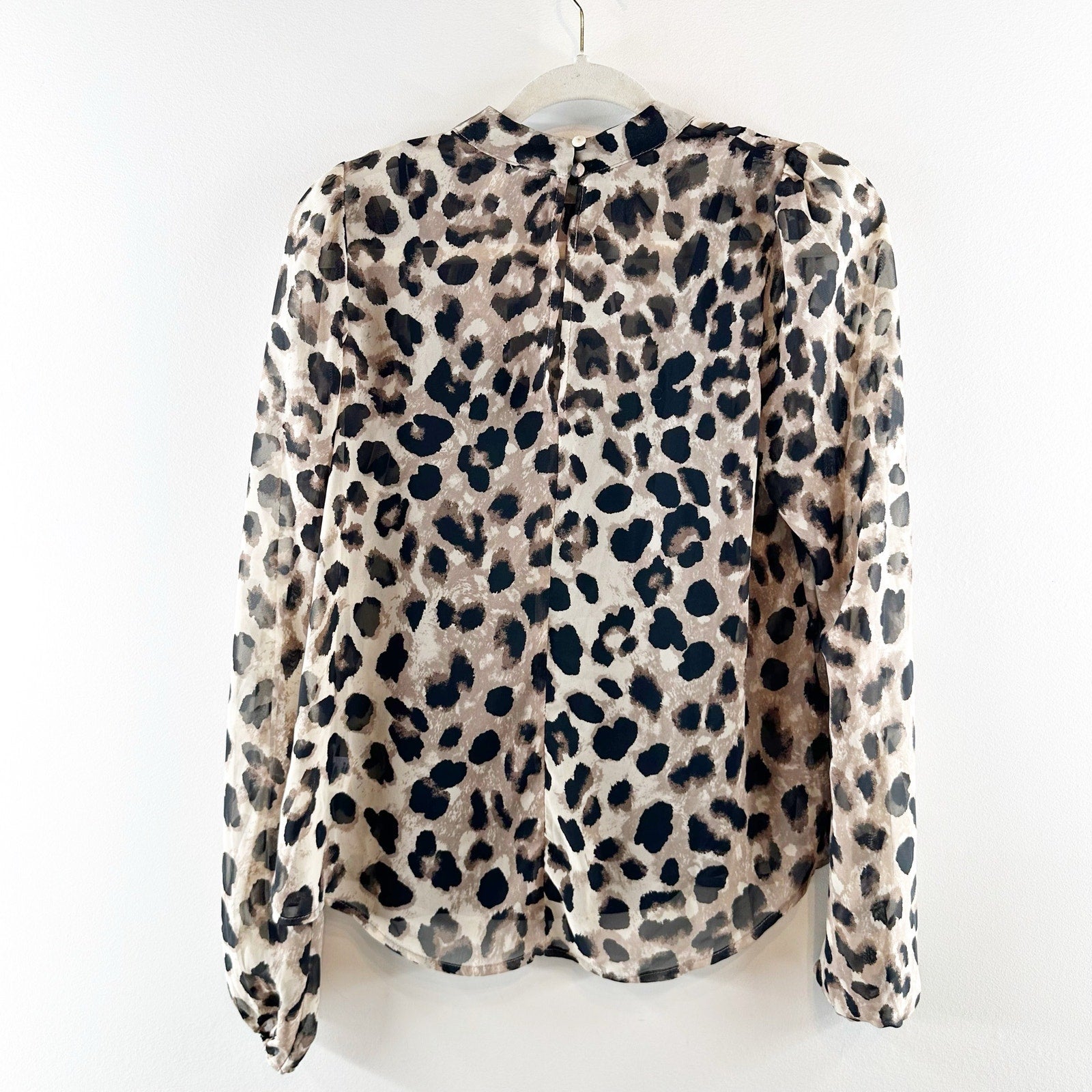 long sleeve, leopard print, mock neck, button closure, bishop sleeves, back keyhole closure, built-in cami, work, business, career, blouse, top, puff sleeves