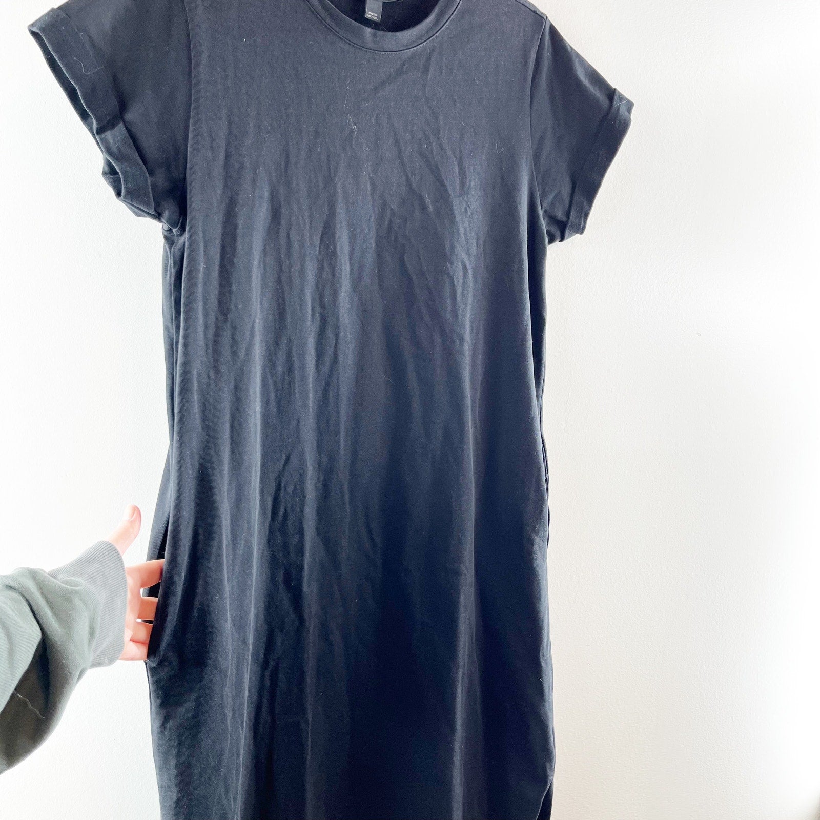 short cuffed sleeves, organic cotton, crewneck, side slits, maxi, dress, black, basic, pockets