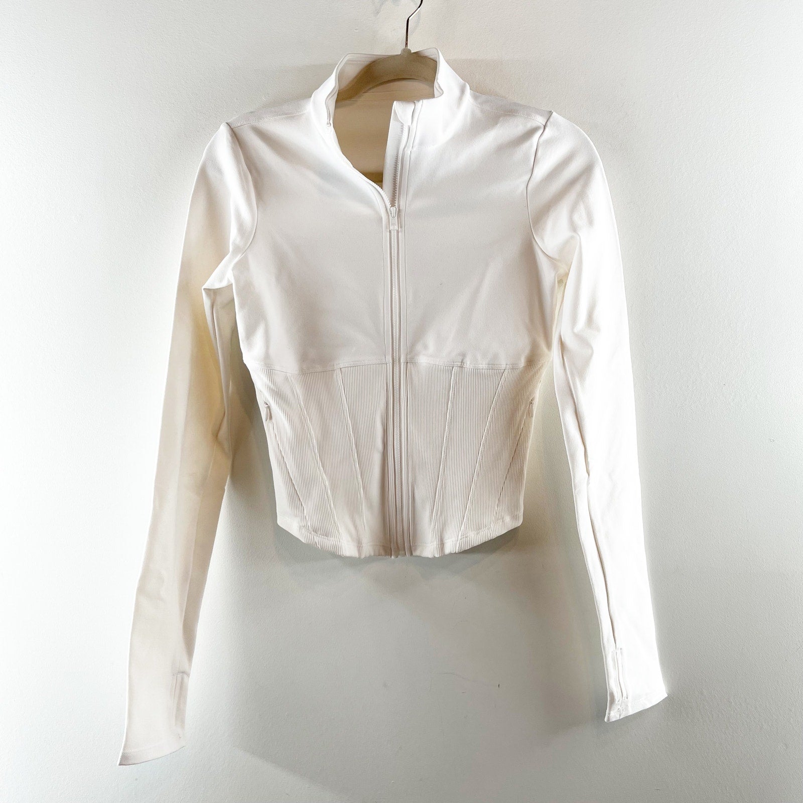 long sleeve, thumb holes, full zip, cinch waist, corset style, jacket, white, workout, lounge, athleisure, cropped fitted jacket