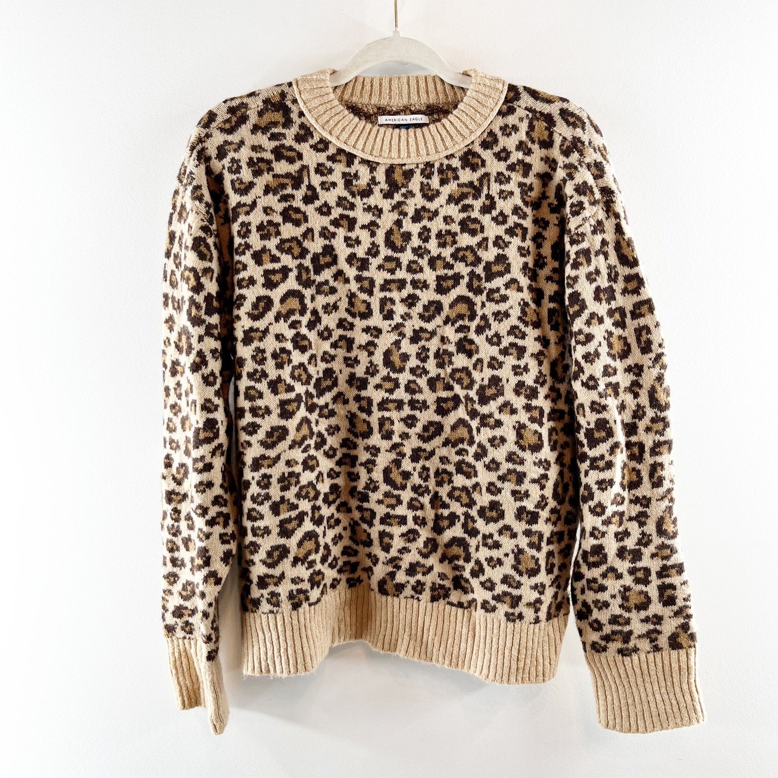 American Eagle Oh So Soft Crewneck Pullover Sweater LEopard Tan Small