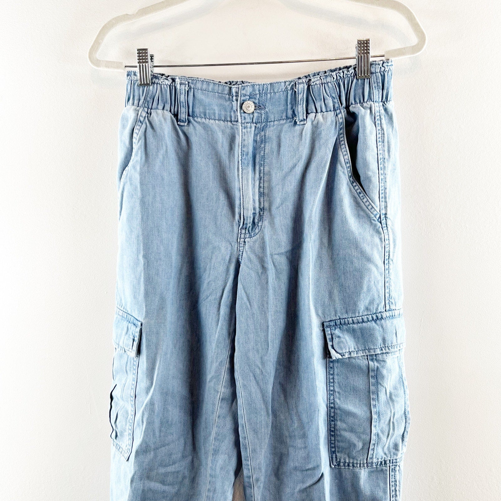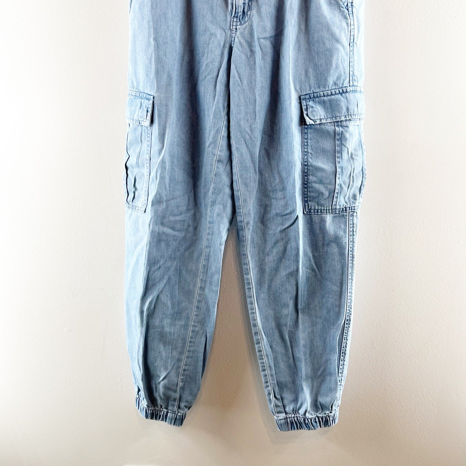 pull on, elastic waist, stretch, light wash, cargo pocket, jogger, denim, casual, streetwear, chic, jeans, pants