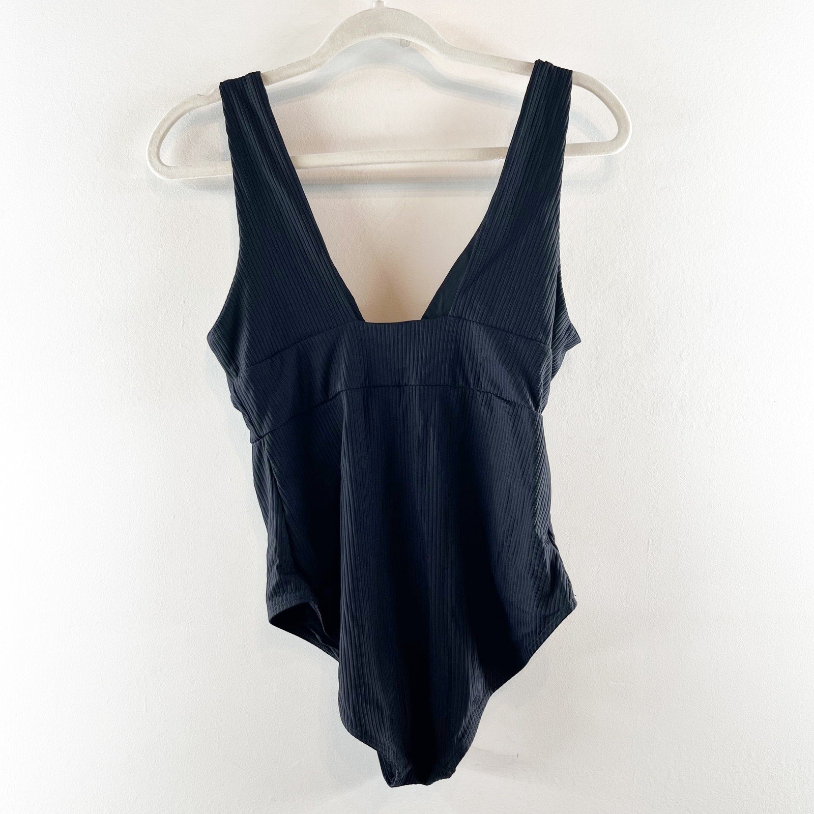 ribbed, plunge front, one piece, solid, black, bathing suit, swimsuit
