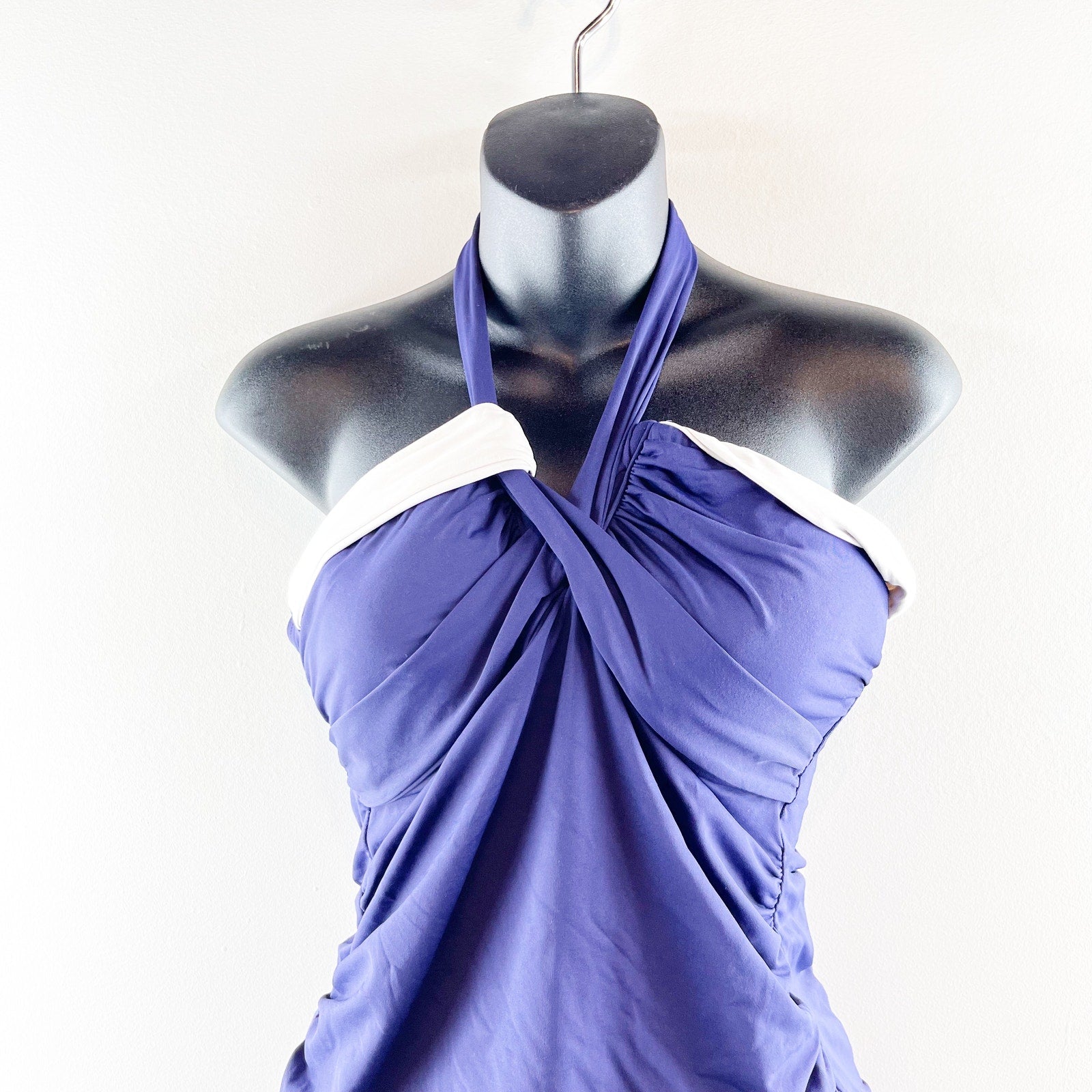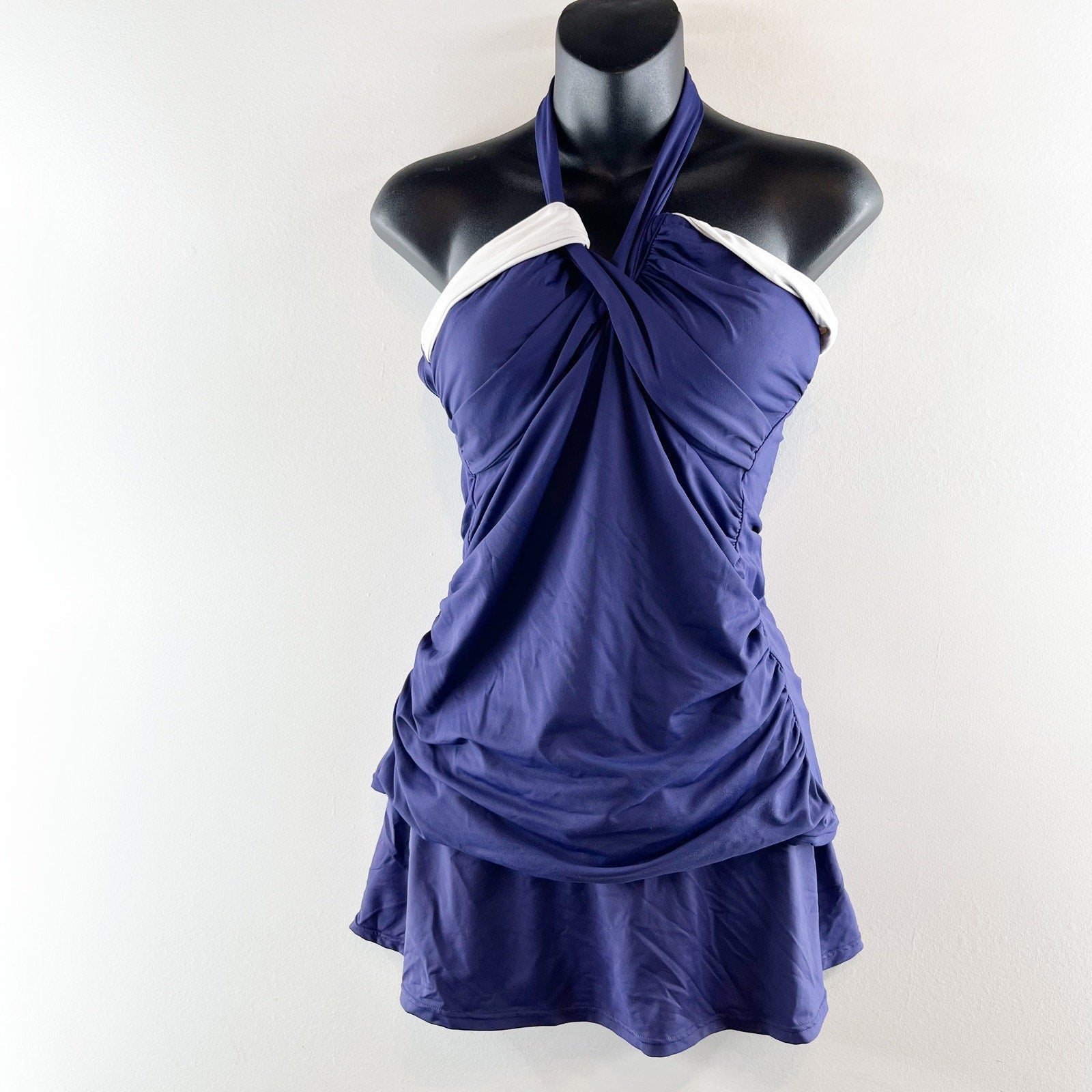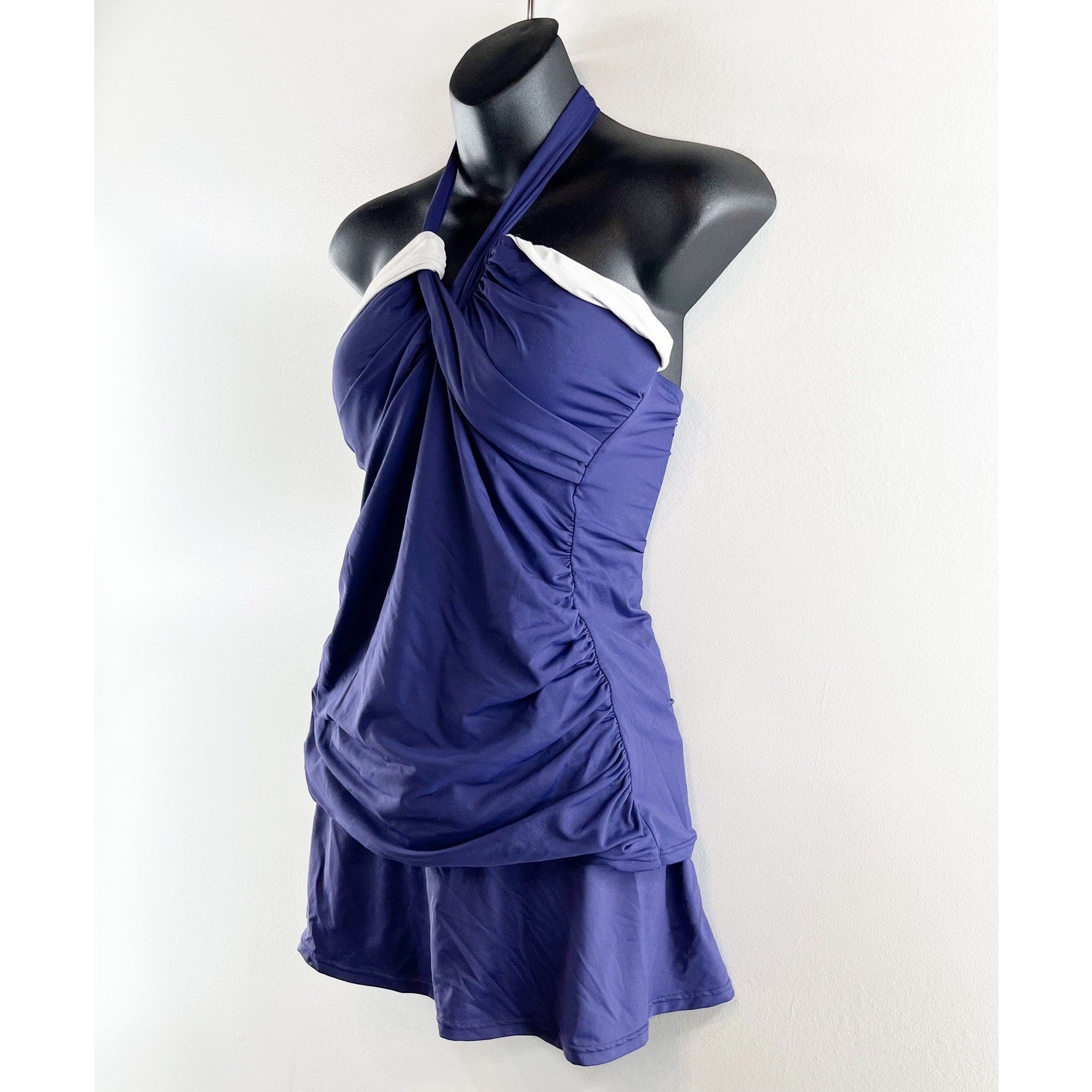 two piece, skirt, bikini, tankini, royal blue, white trim, twist front, halter tie neck, swimsuit, bathing suit