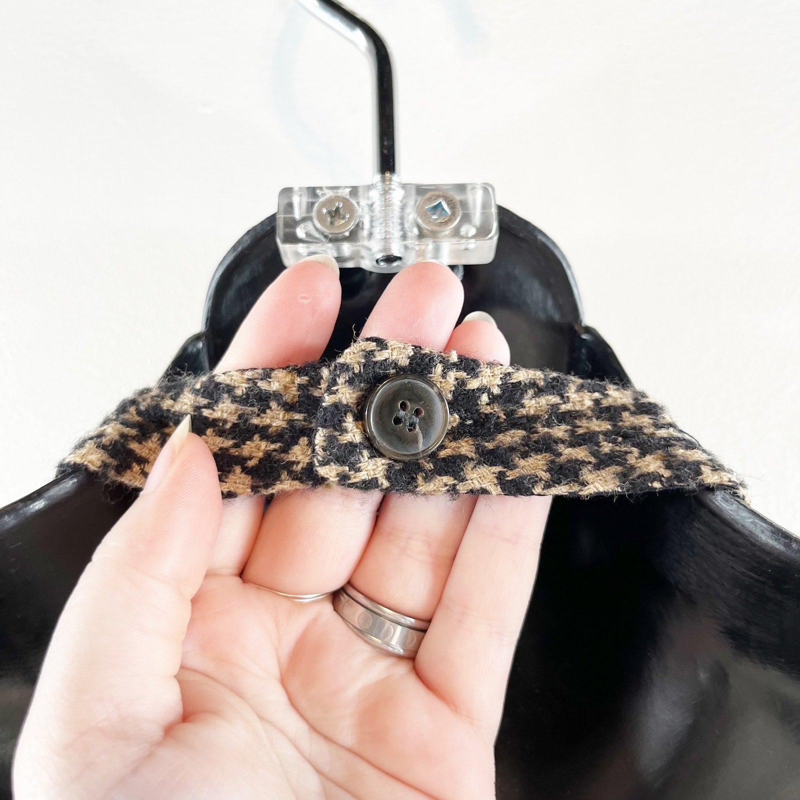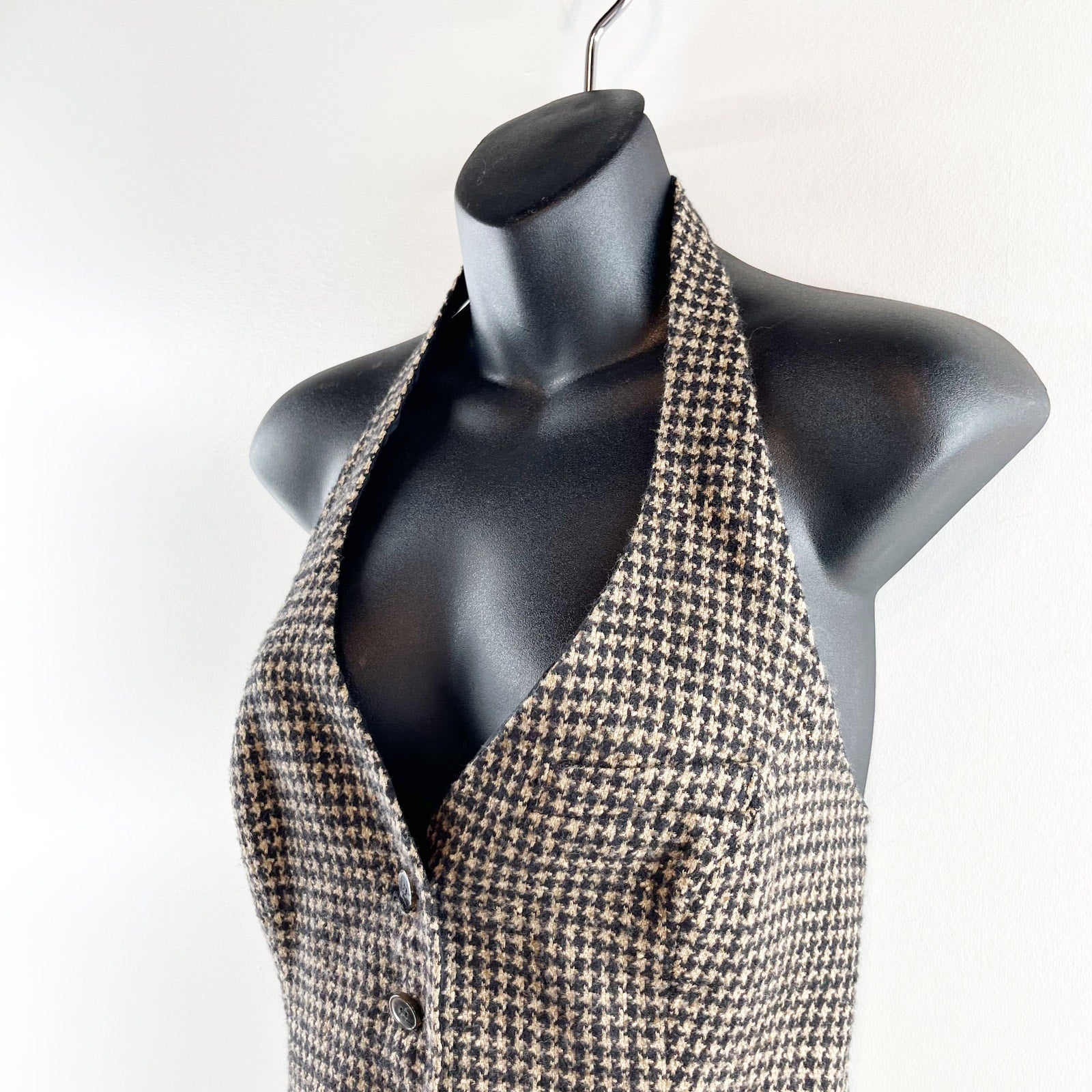 sleeveless, houndstooth, halter neck, v-neck, front pocket, button front, open back, career, work, business, waistcoat, vest, beige, black
