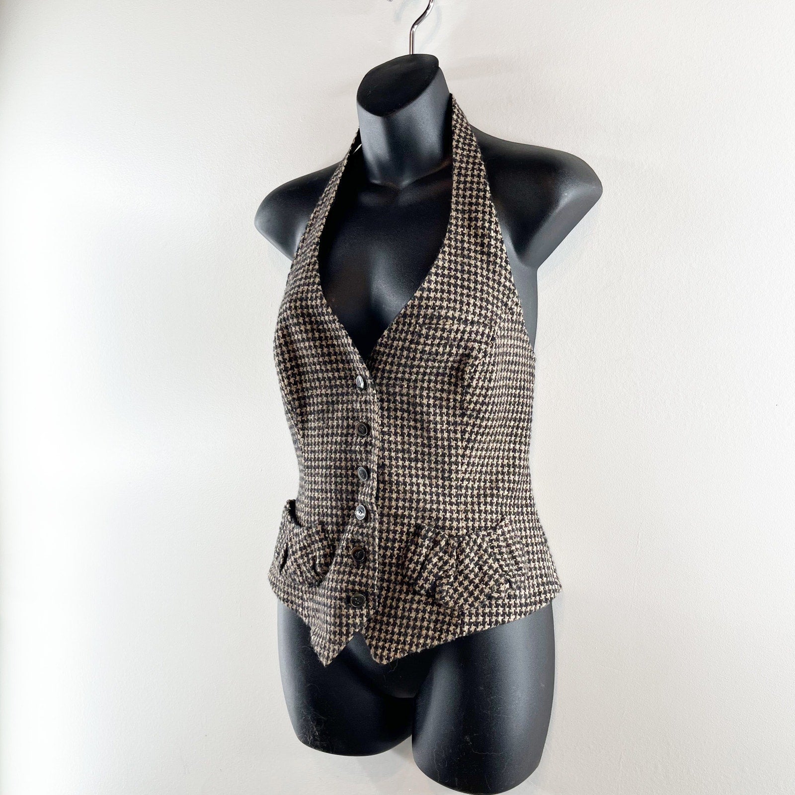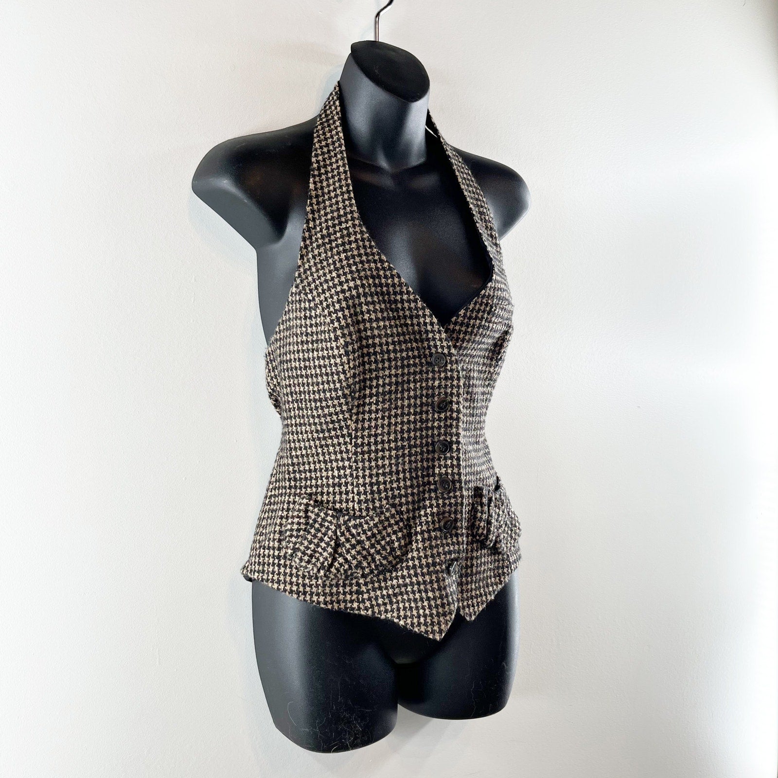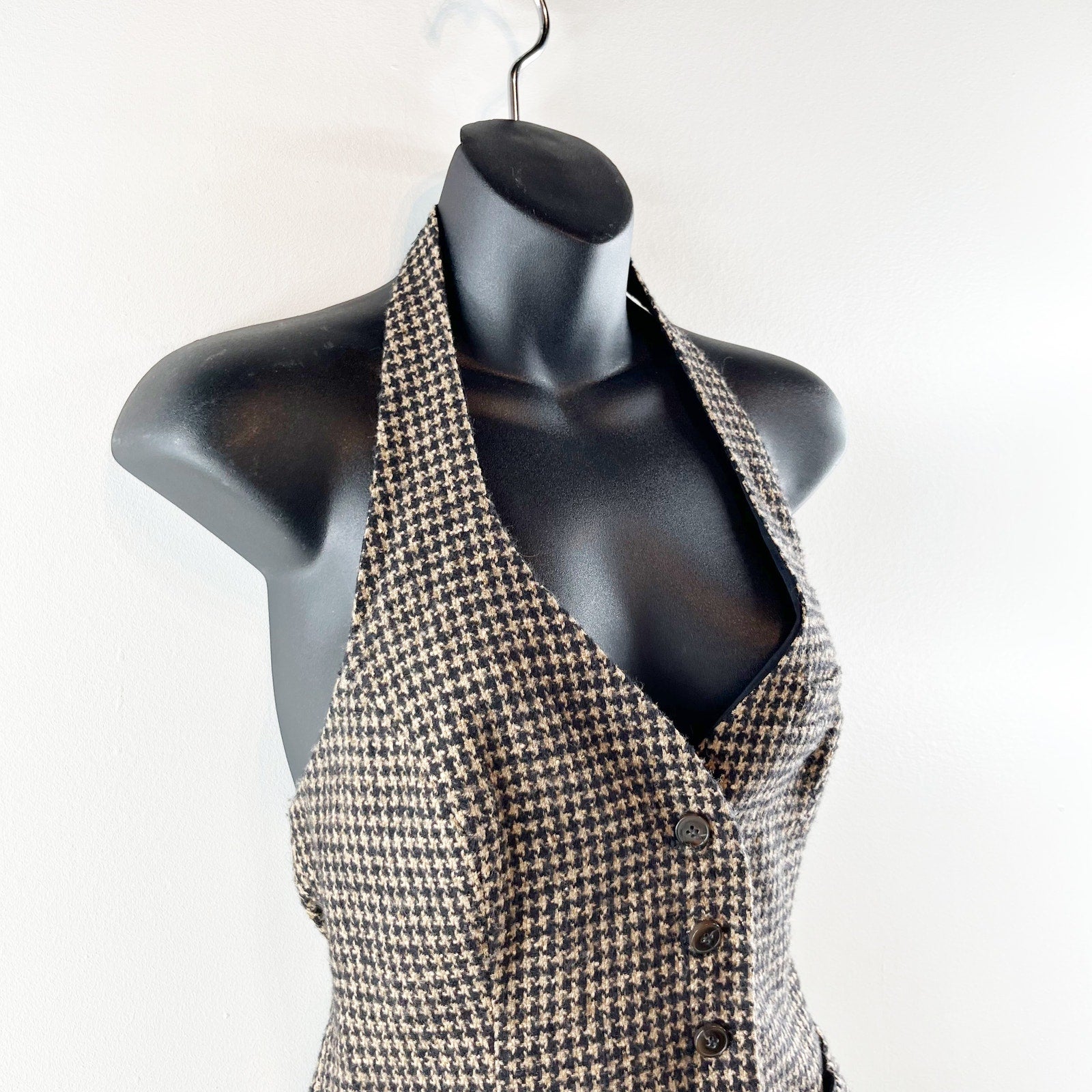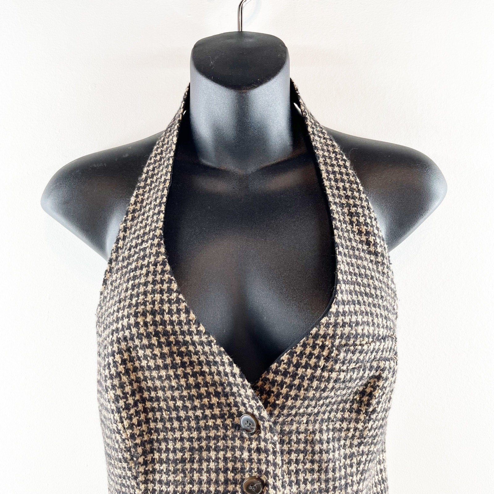 Anne Fontaine Paris Houndstooth Sleeveless Halter Waistcoat Vest Tan Black 40