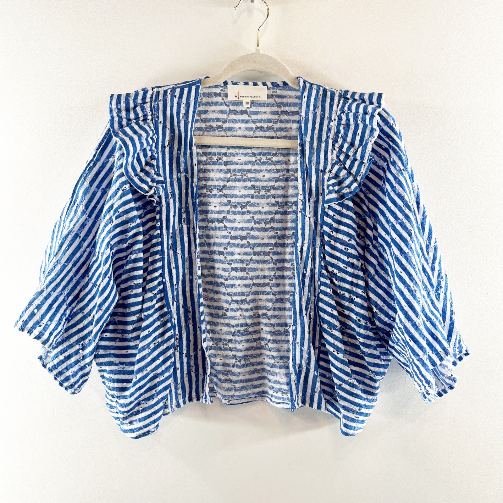 ruffle detail on shoulders, striped, blue, white, open, 3/4 sleeves, cropped boxy fit, cardigan, top