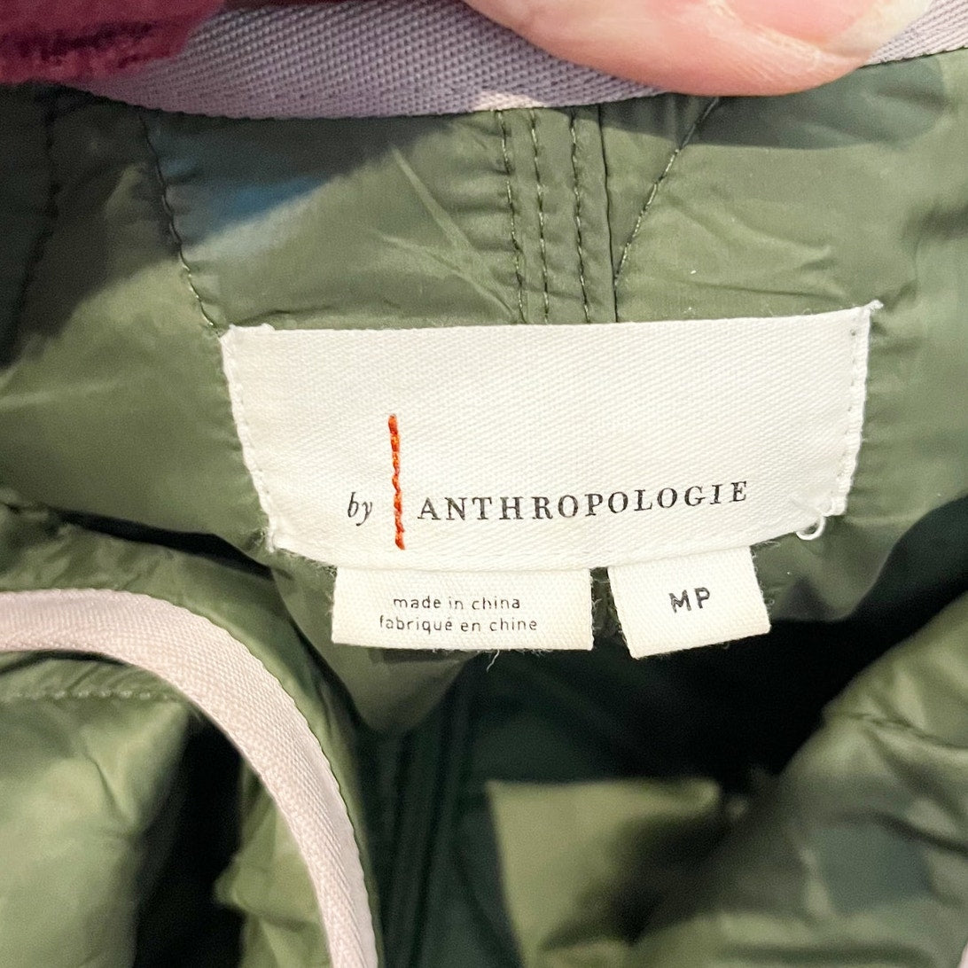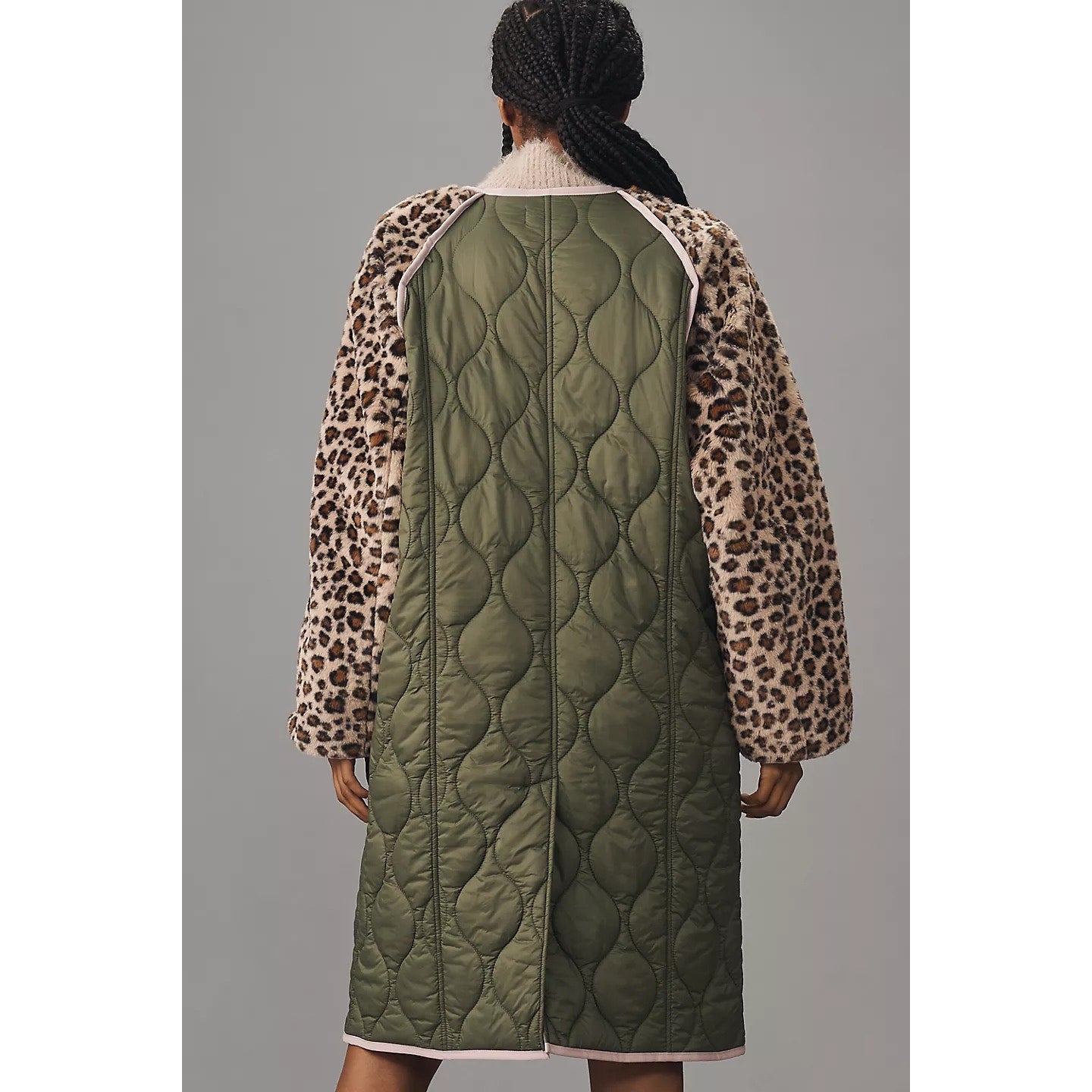 Anthropologie Colorblock Long Liner Quilted Button Up Coat Jacket Leopard Green