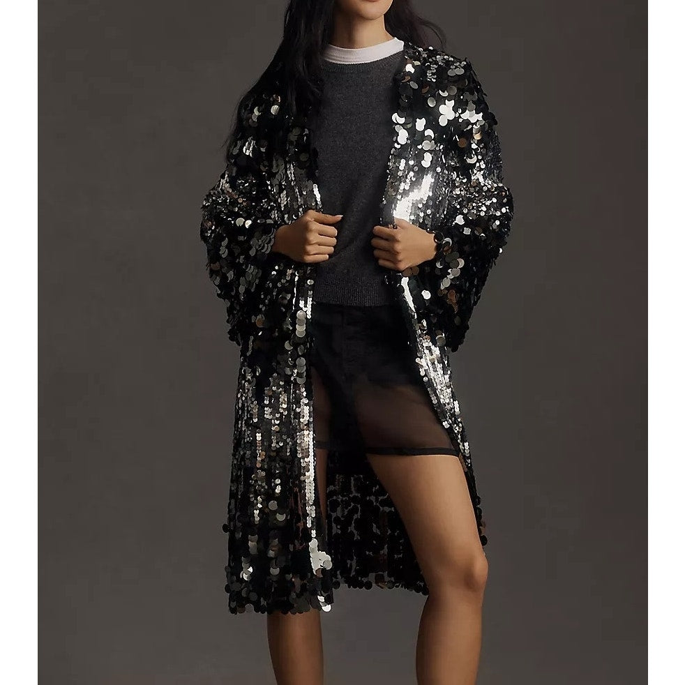 Anthropologie Long Sequin Duster Kimono Cardigan Coat Silver Black One Size