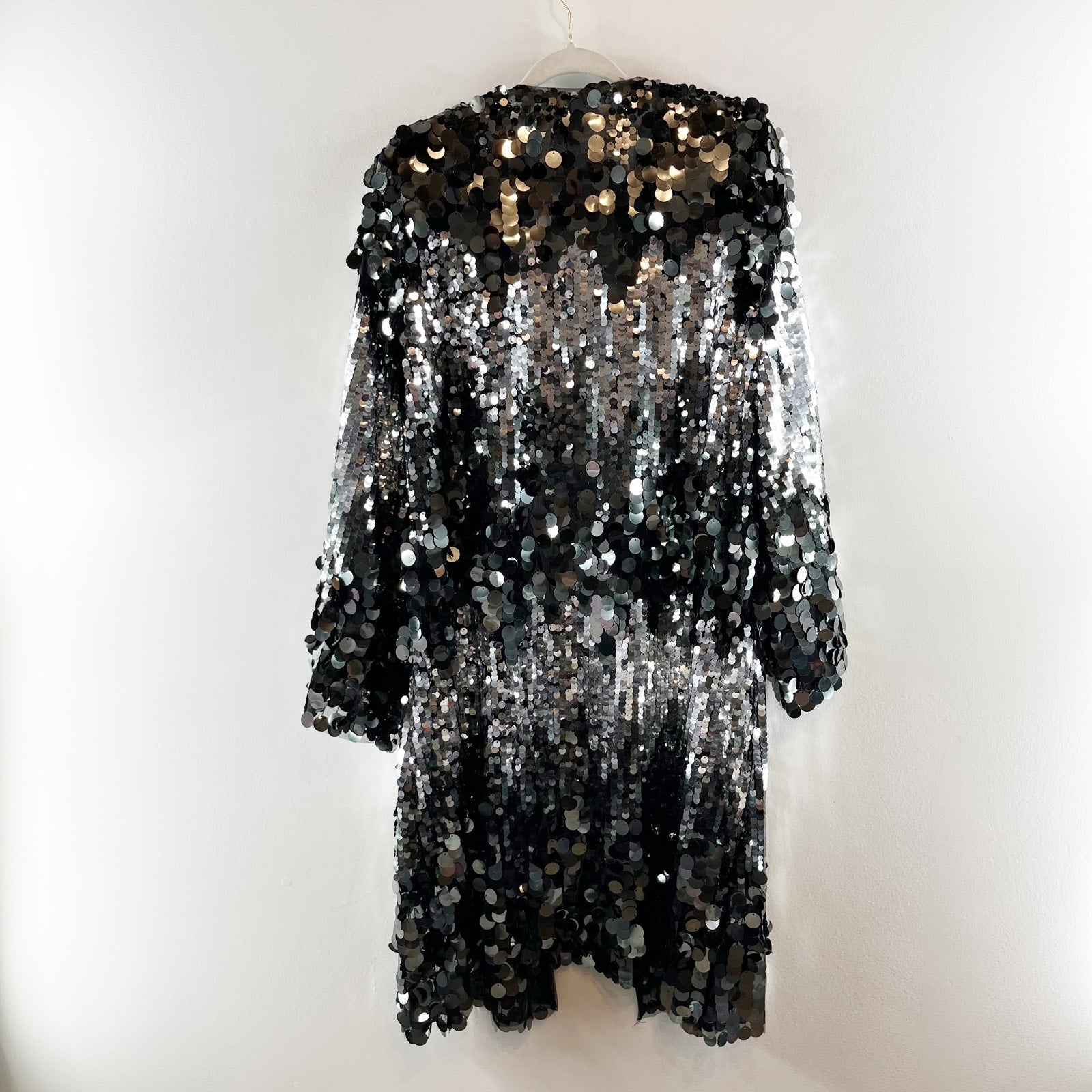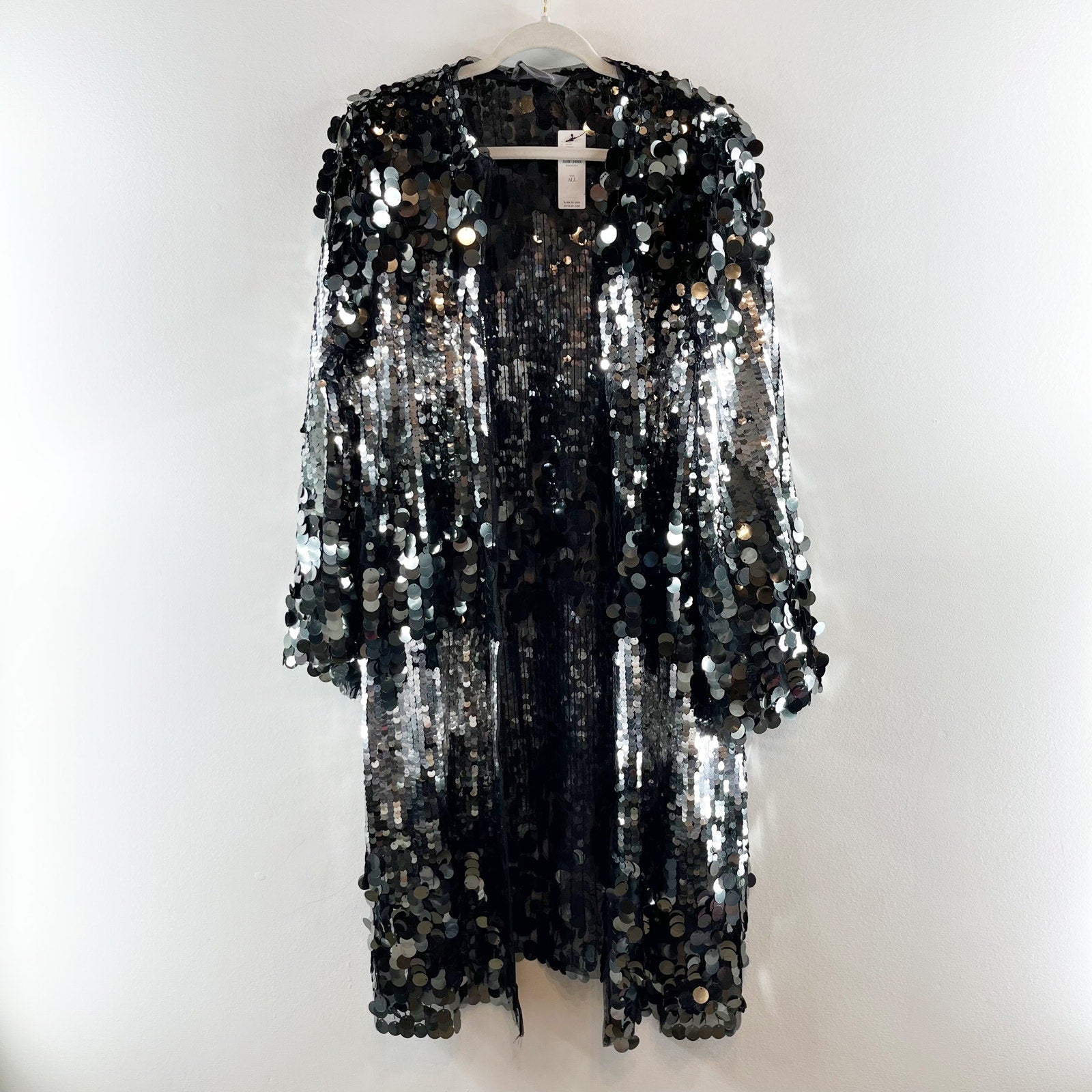 open, duster, cardigan, coat, kimono, knee length, silver, sequin, disco, holiday, party, long sleeve, new years, festival, concert