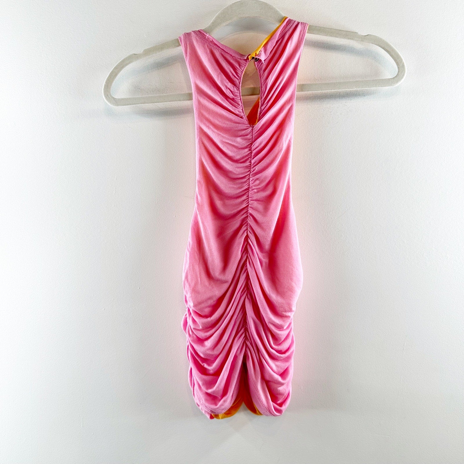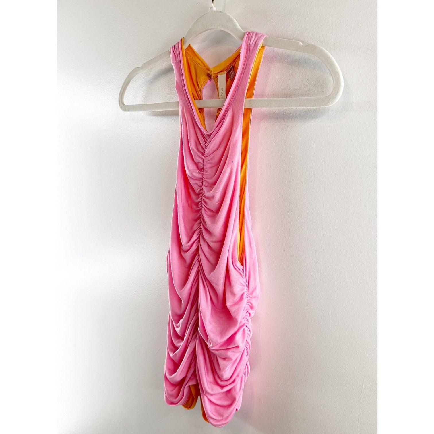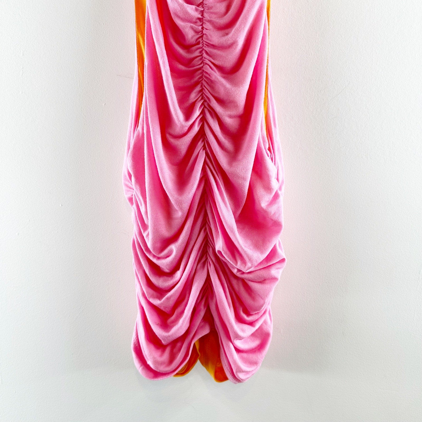ruched center, double lined, high neck, sleeveless, pink and orange, reversible, stretch