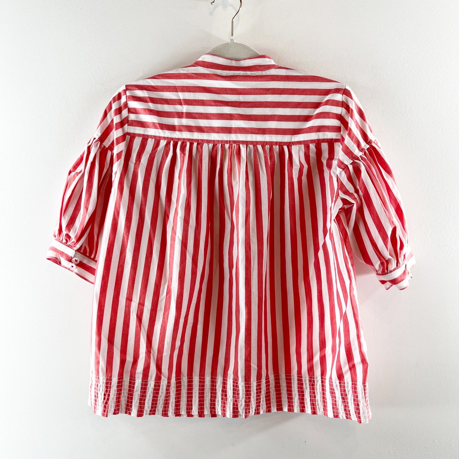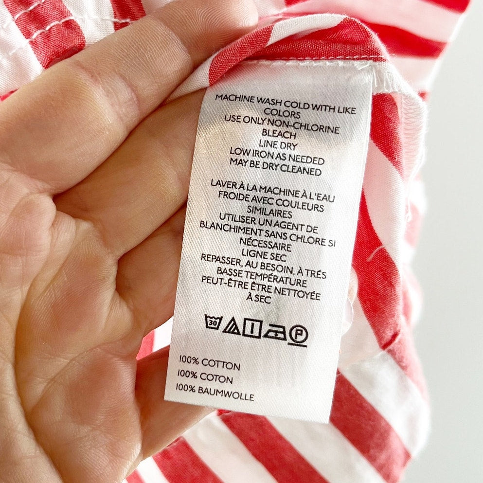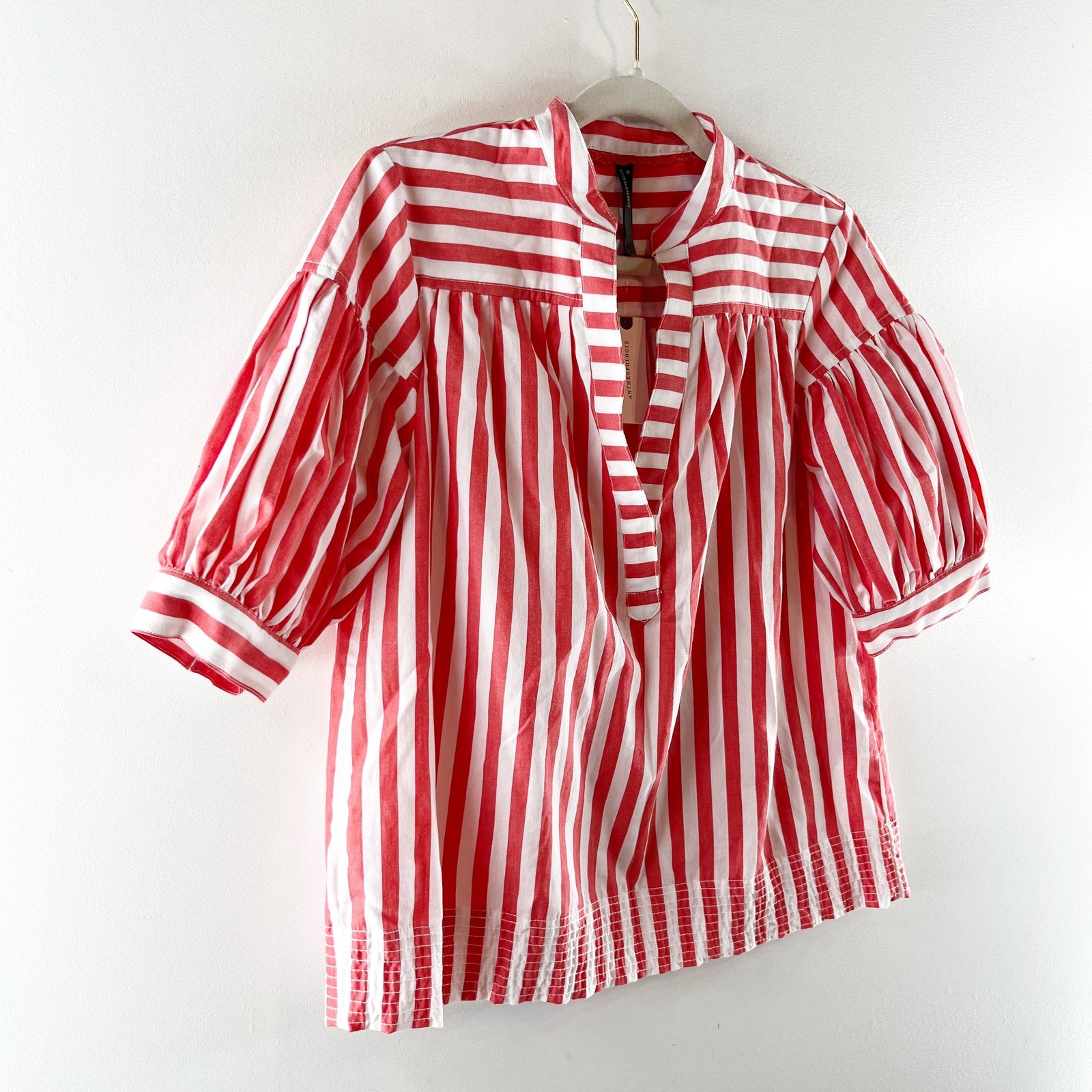 cotton poplin, v neckline, short puff sleeves, striped, red, white, boxy fit, darcey