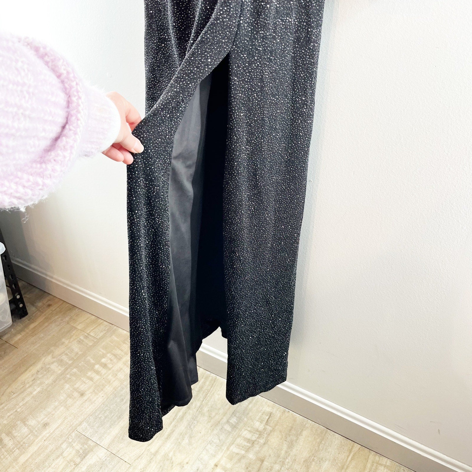 stretch, lined, black, notch neckline, fitted, sparkle, shimmer, glitter, formal, gown, floor length, slit, event, black tie, wedding, party, cocktail