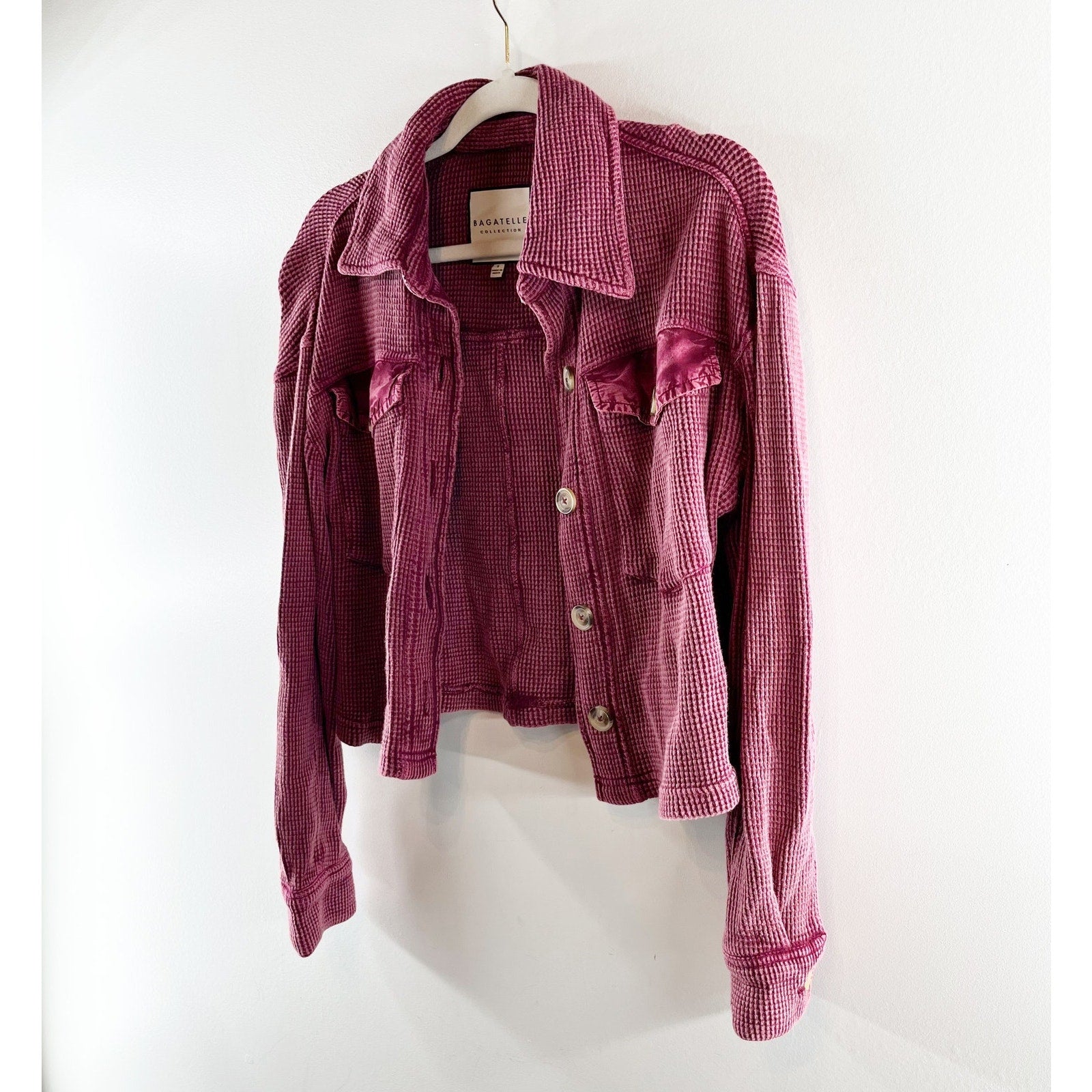 button up, long sleeve, thermal, waffle, cranberry, maroon, burgundy, fall, red, pockets, boho, raw hem