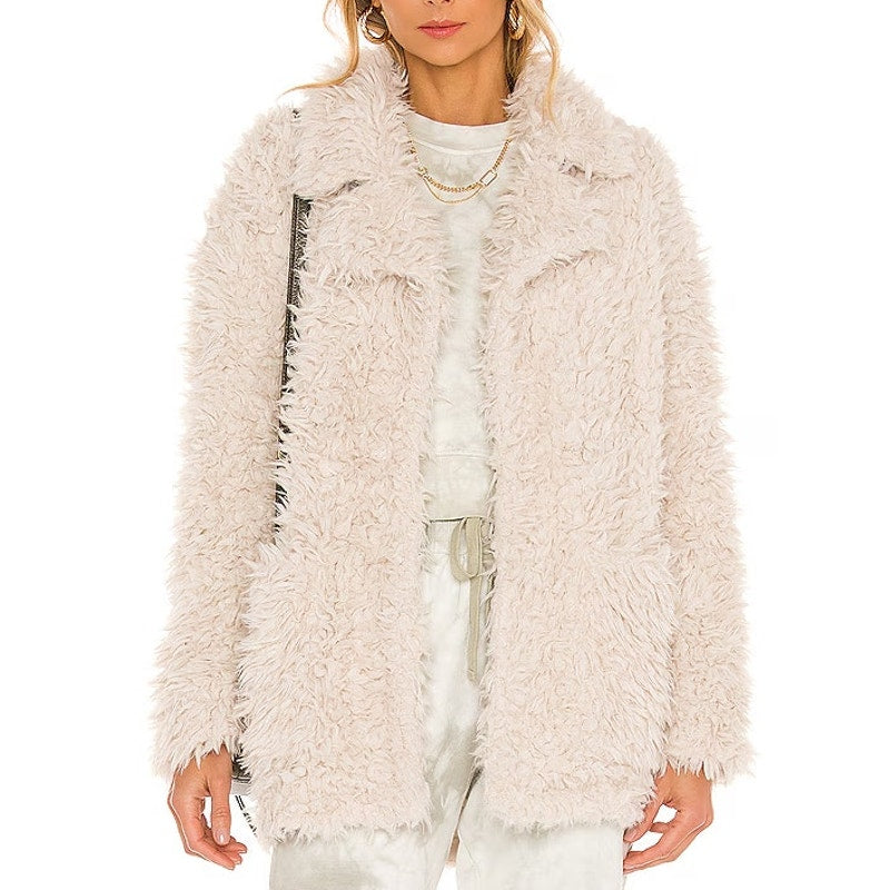 long sleeve, collared neck, faux fur, snap buttons, lined, patch pockets, winter, outdoor, fashion, luxury, coat, fuzzy, sherpa