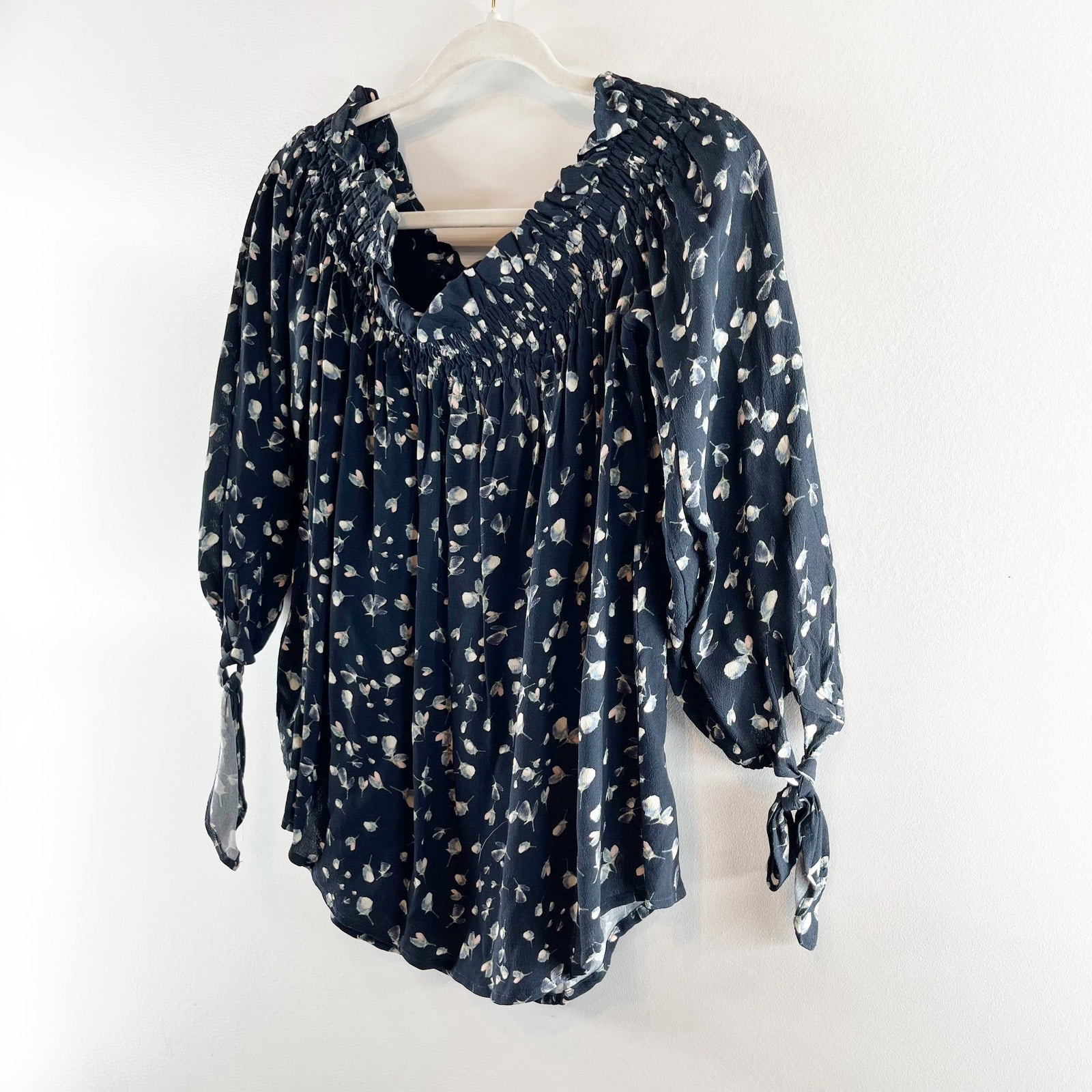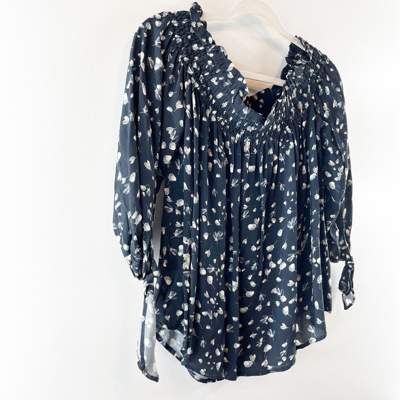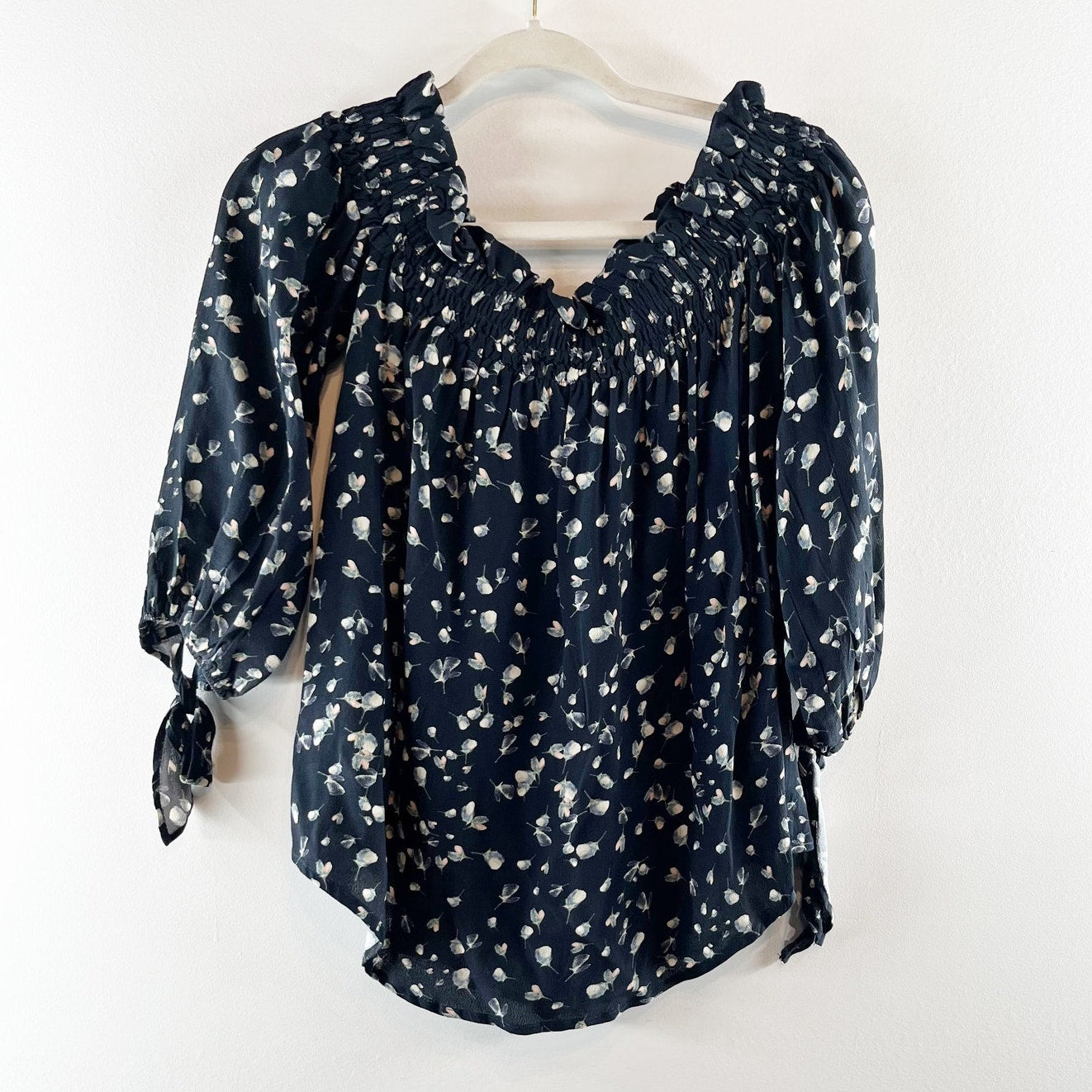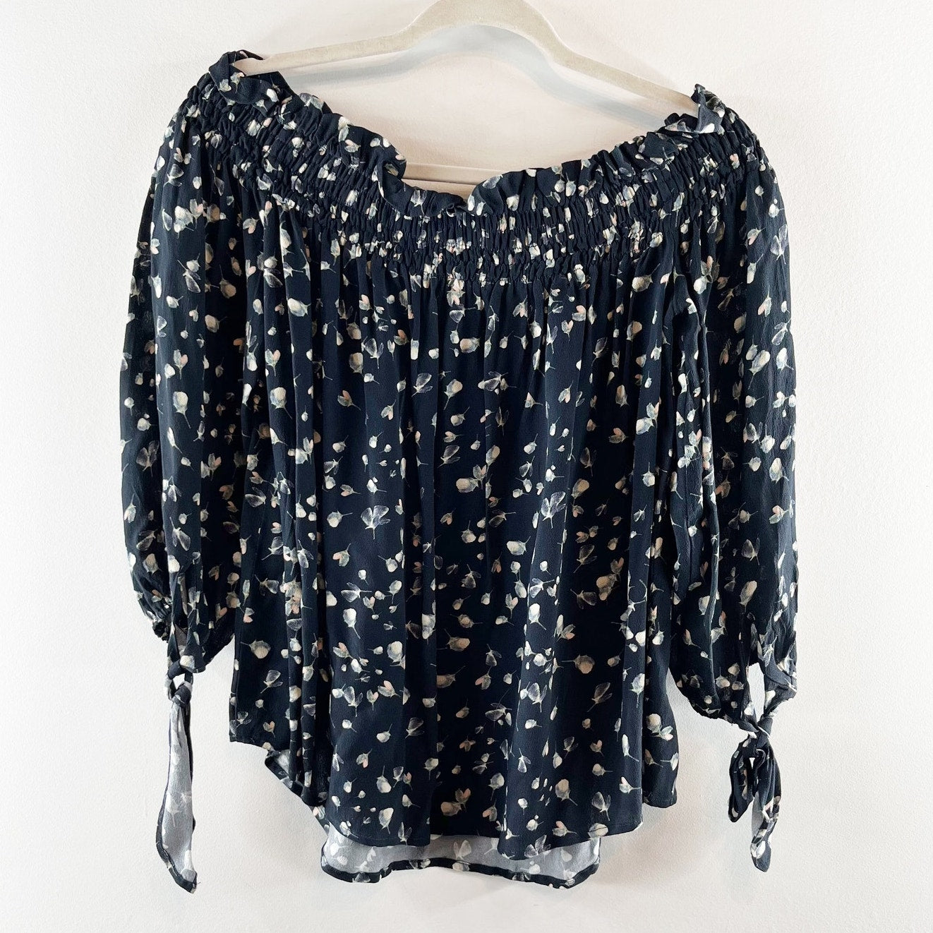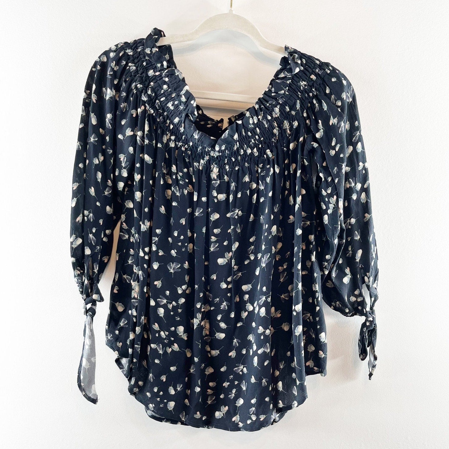 Beach Riot Floral 3/4 Sleeve Smocked Off The Shoulder Blouse Top Dark Blue Small