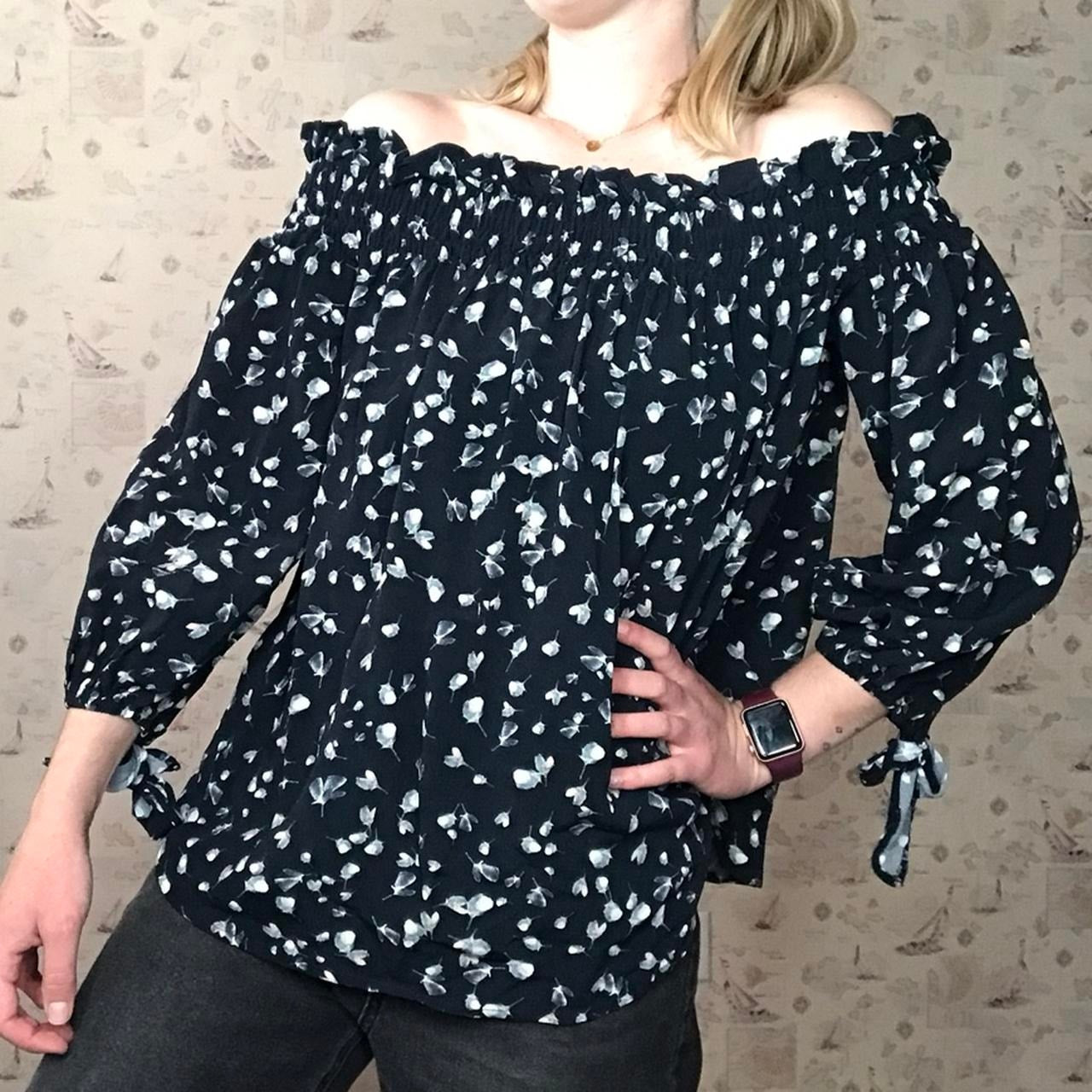 3/4 sleeve, floral print, smocked, off shoulder, curved hem, tie cuff detail, boho, bohemian, brunch, summer, casual, blouse, top, blue, dark blue, navy