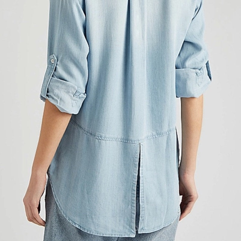 chambray, denim, long sleeve, button up, slit back, shirt, blouse, top