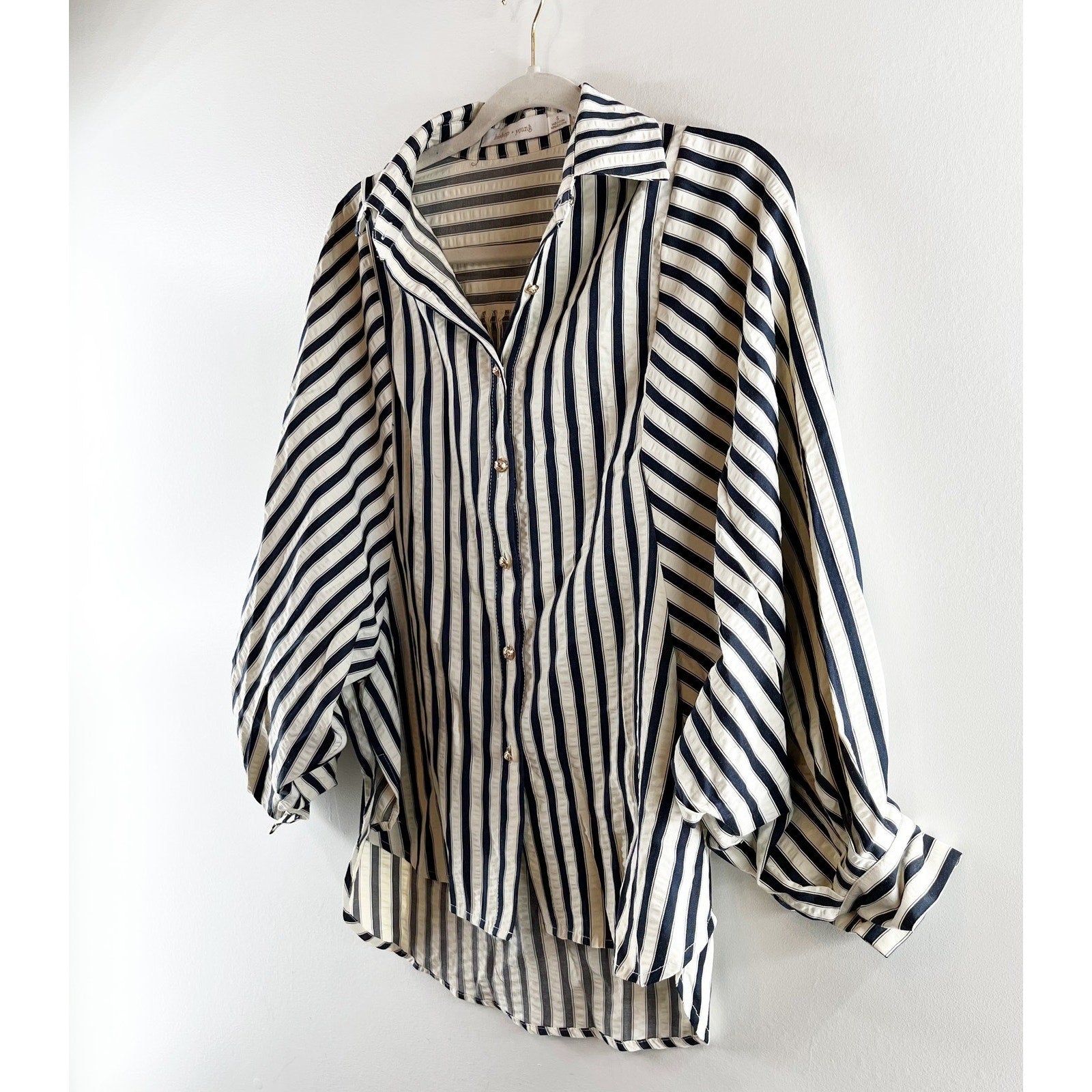 long sleeve, button closure. hi-low, striped, blouse, shirt, careerwear, business, formal, top, oversized balloon sleeves, gold buttons