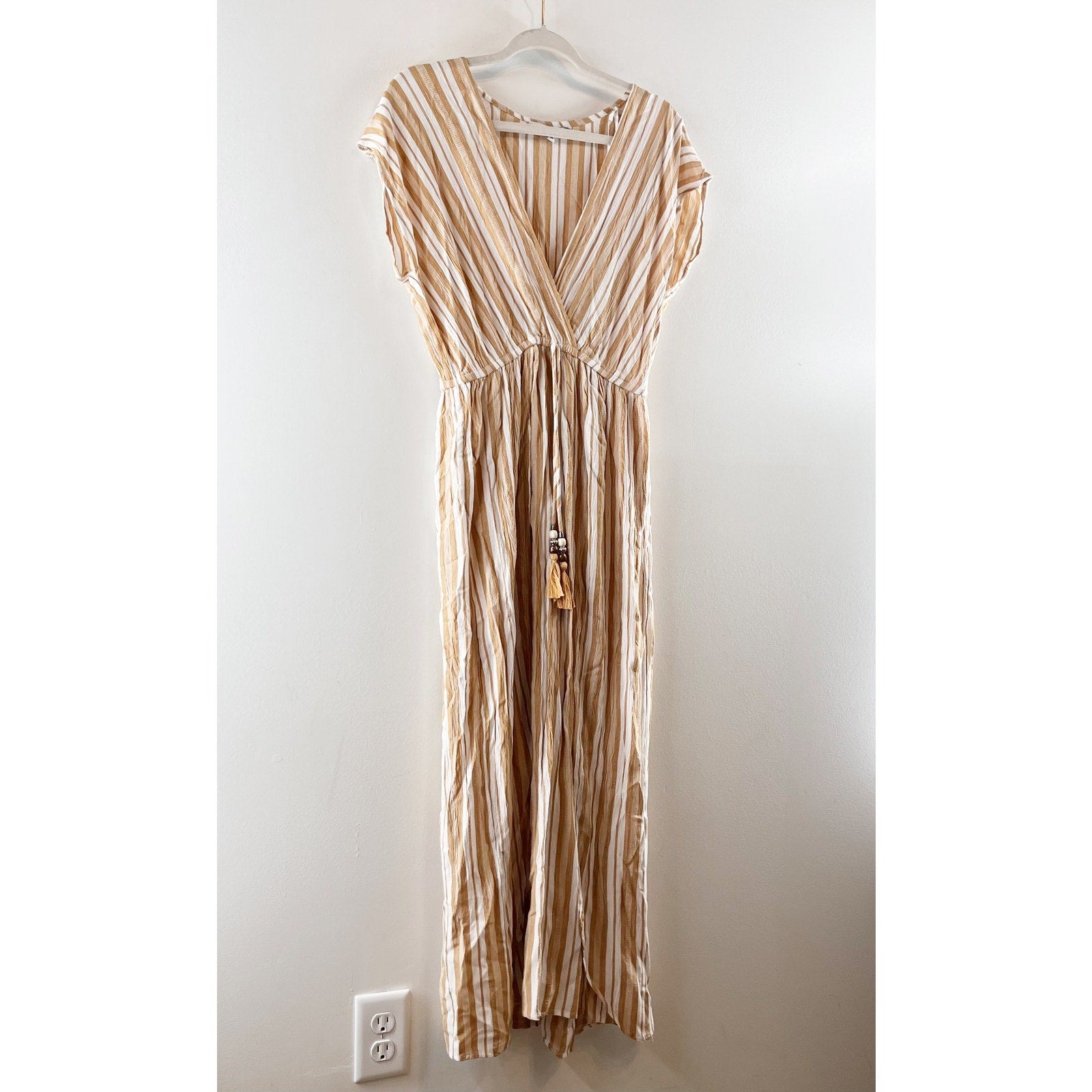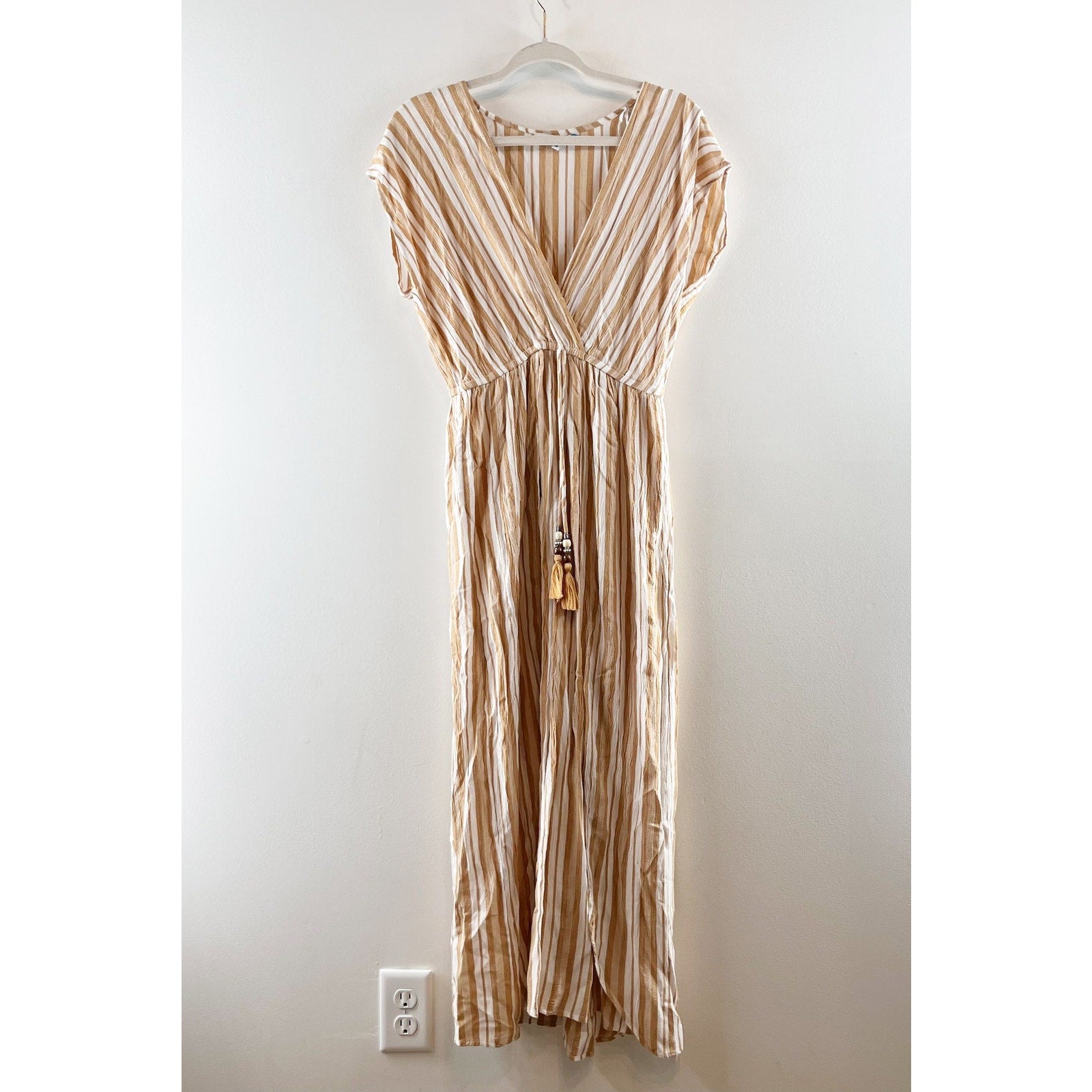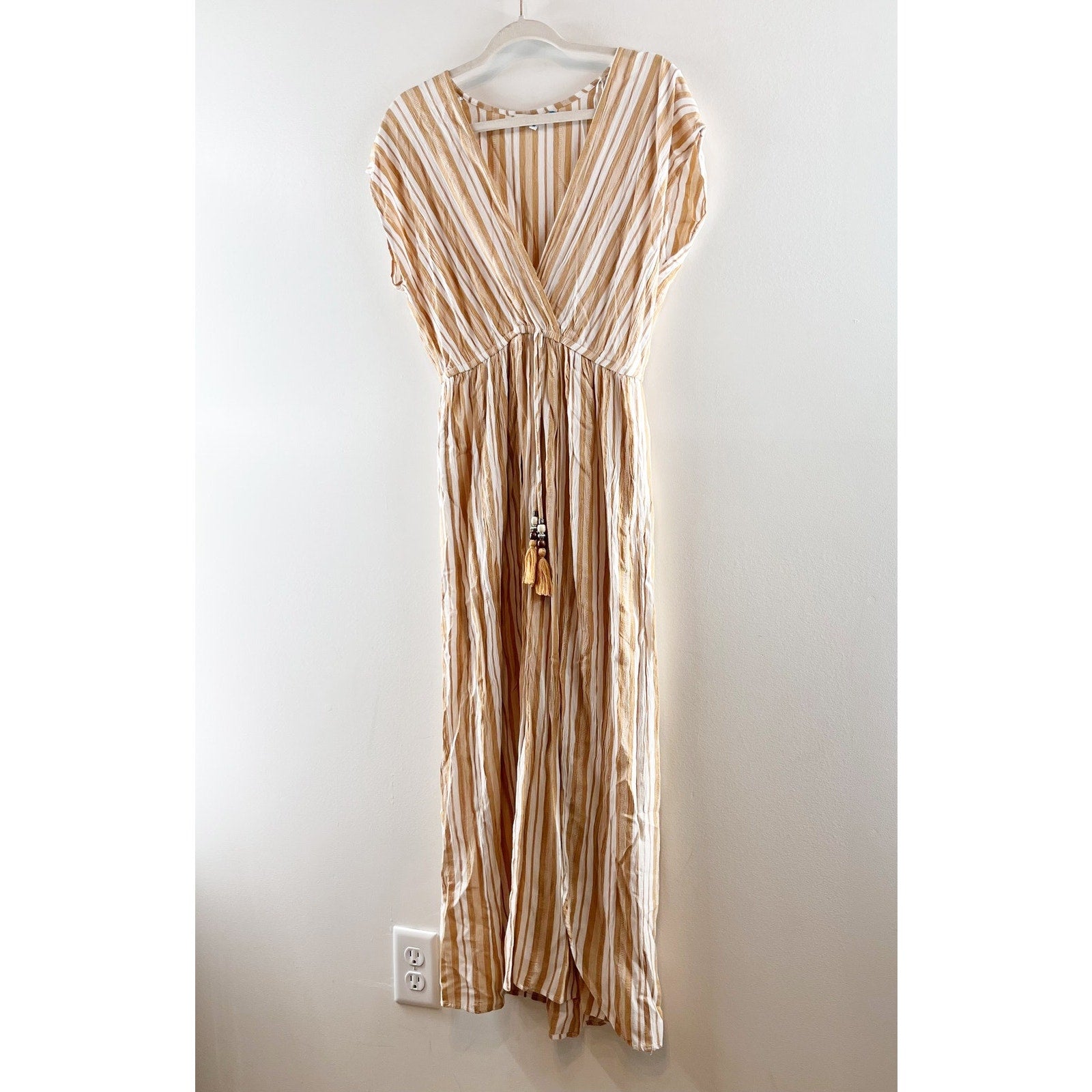 Blue Island Short Sleeve V Neck Striped Slit Cover Up Maxi Dress Tan White M