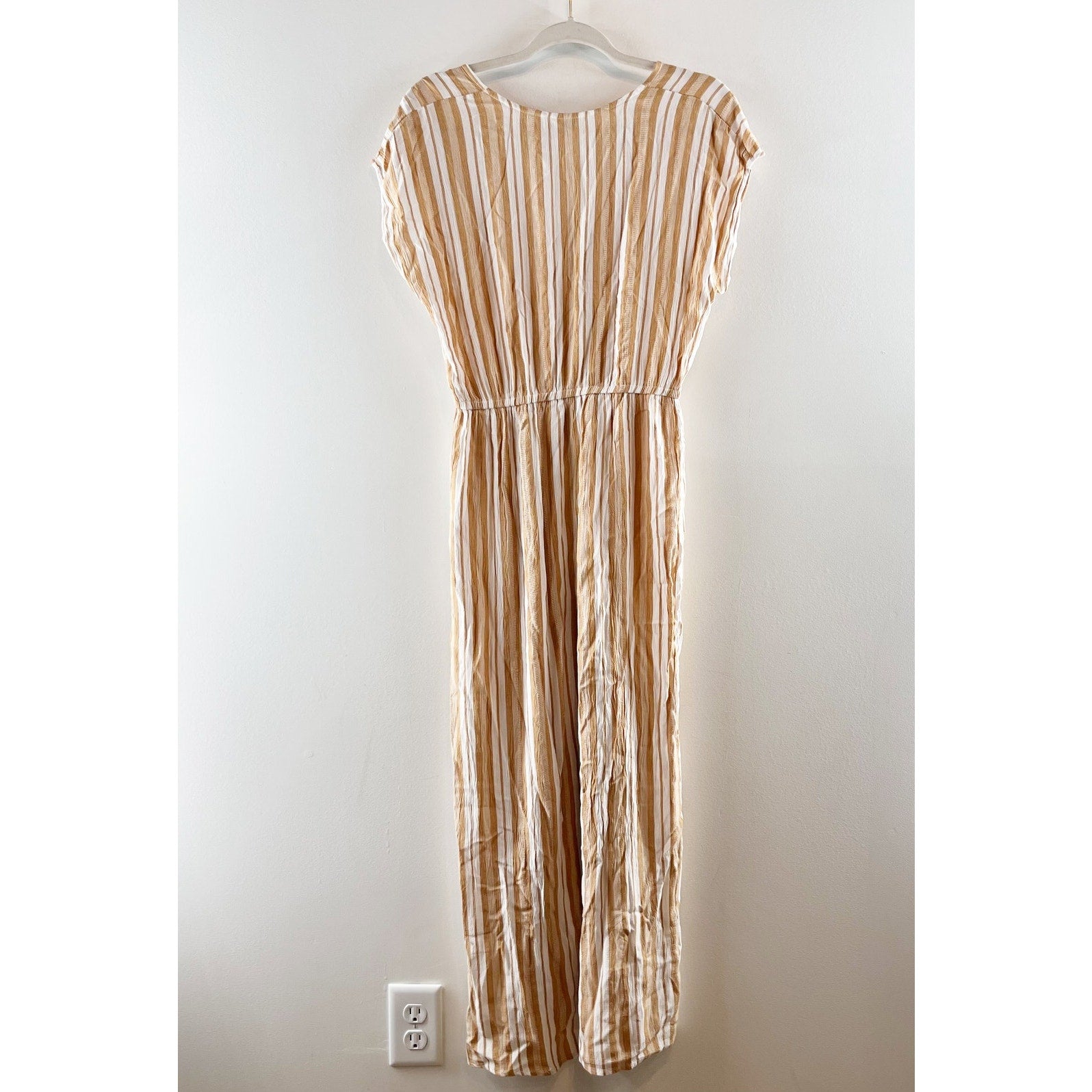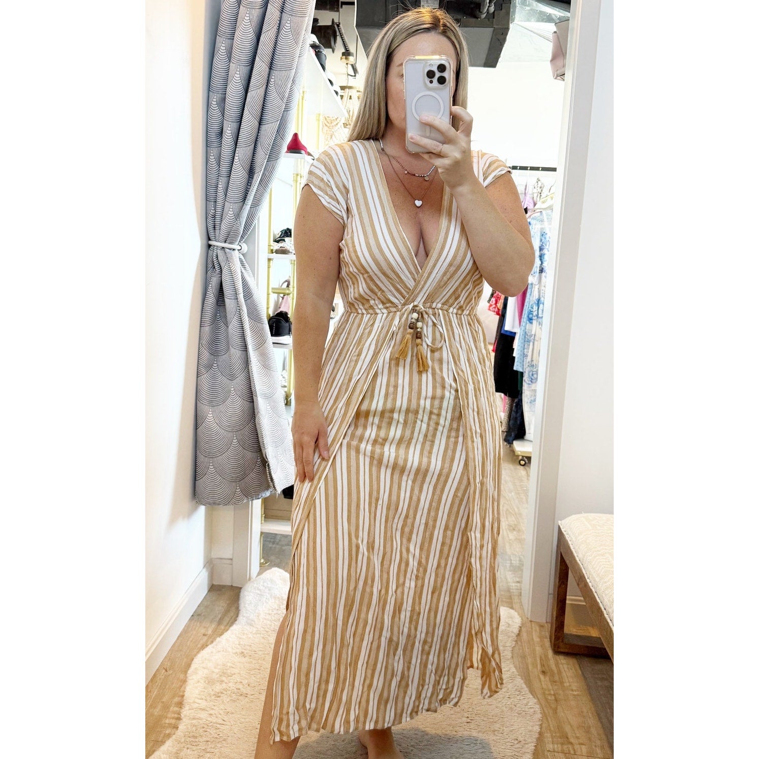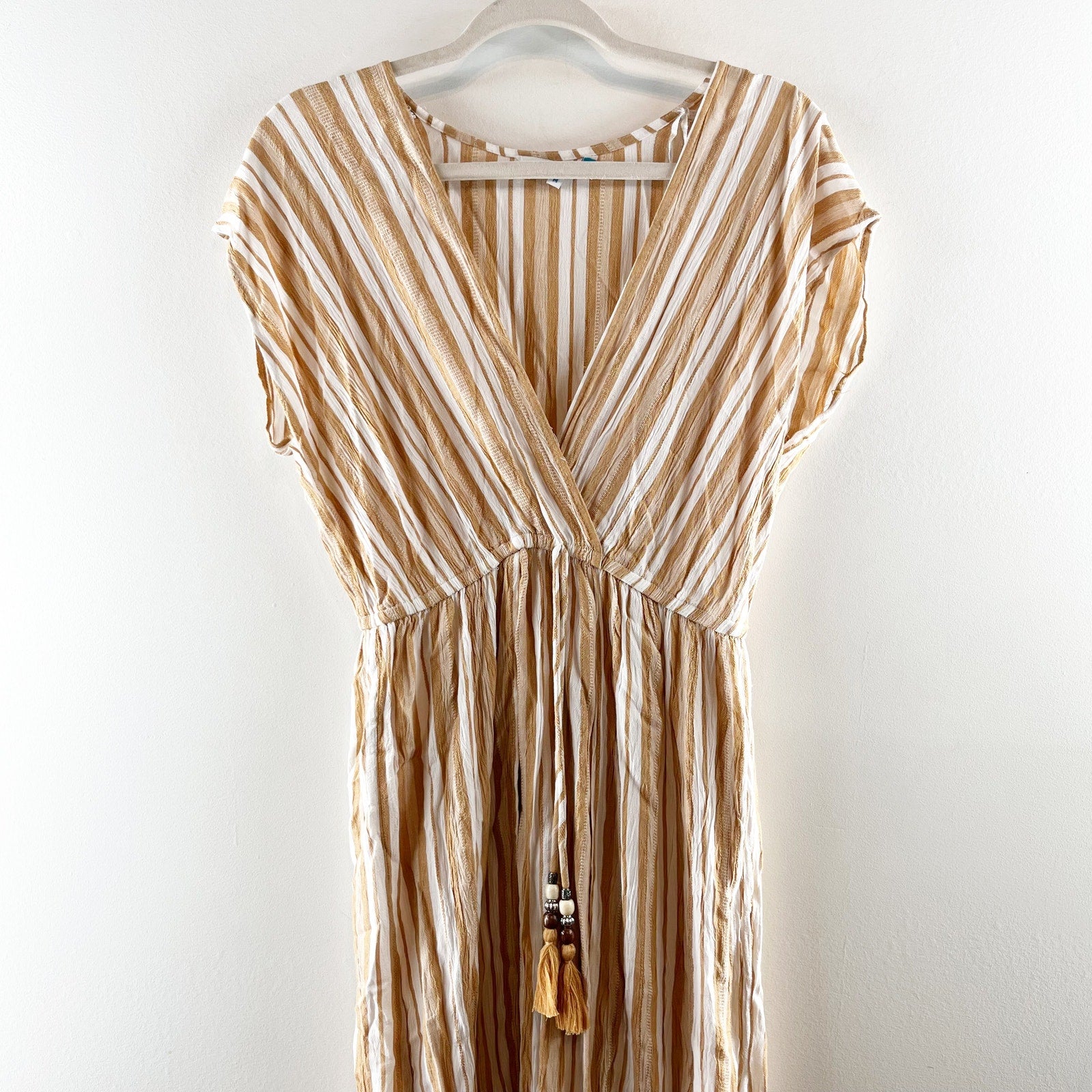 Blue Island Short Sleeve V Neck Striped Slit Cover Up Maxi Dress Tan White M