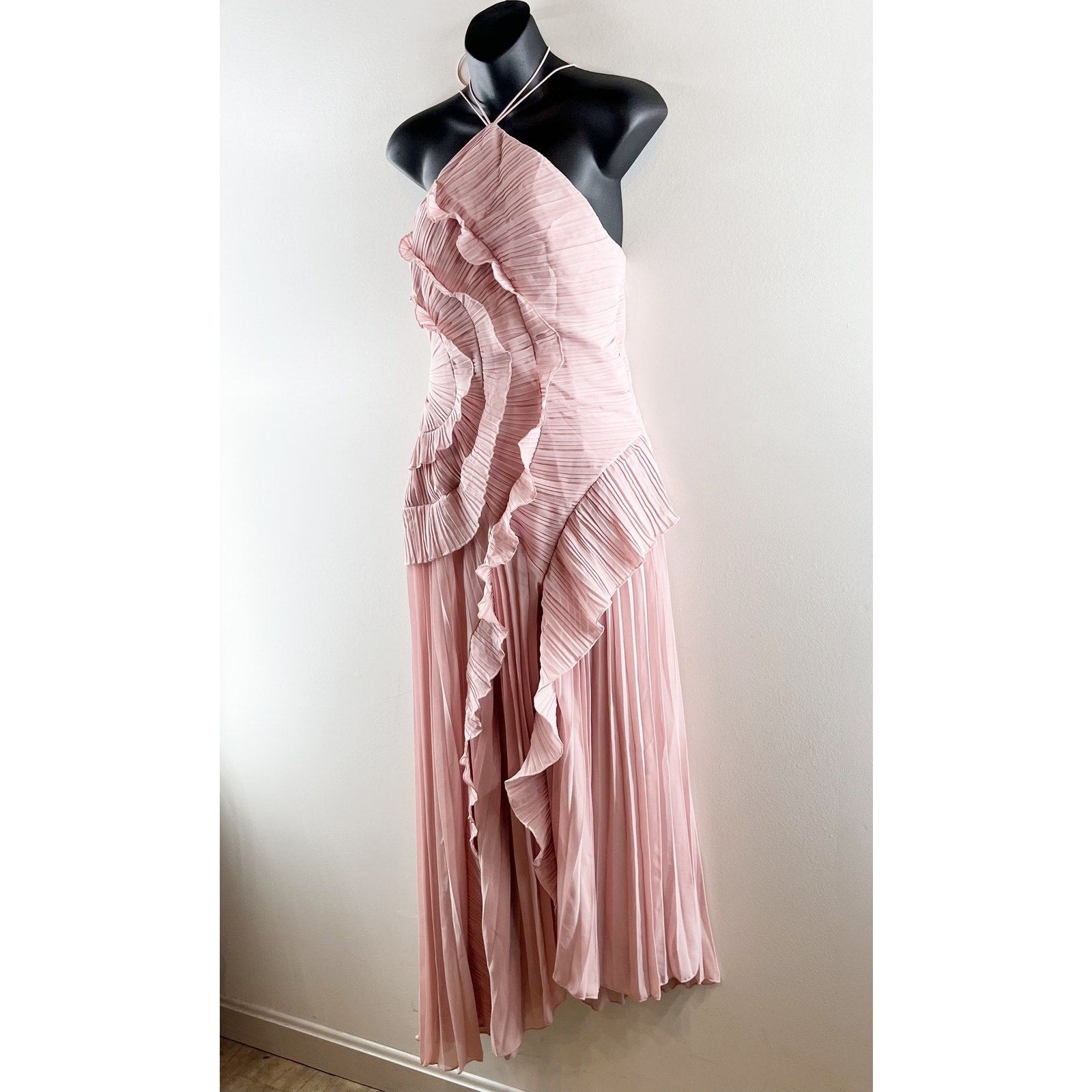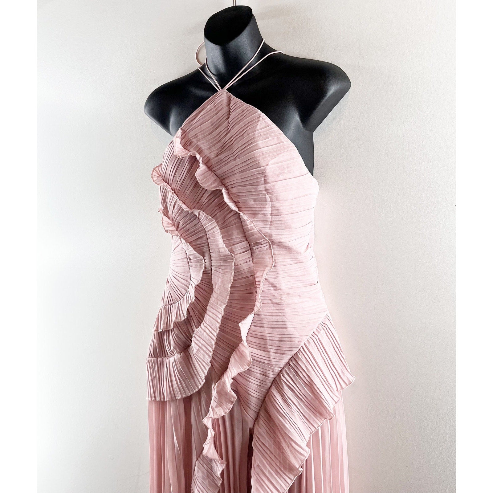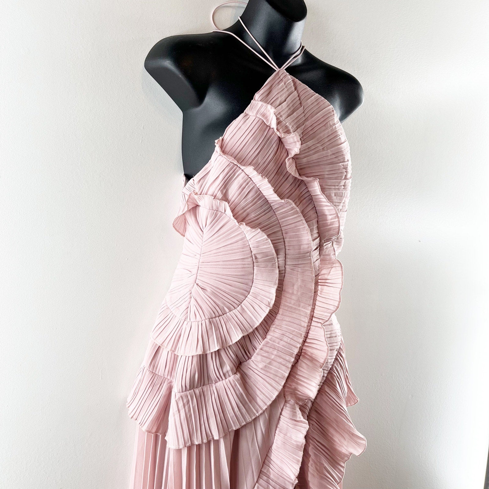 Boutique High Neck Ruffled Pleated Halter Maxi Dress Gown Blush Pink Medium