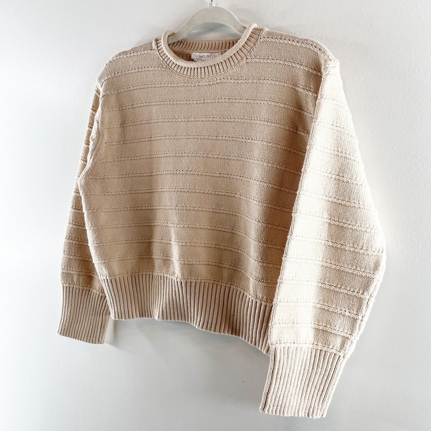 BRIT NY Long Sleeve Pointelle Neck Rib Knit Pullover Sweater Oatmeal Medium