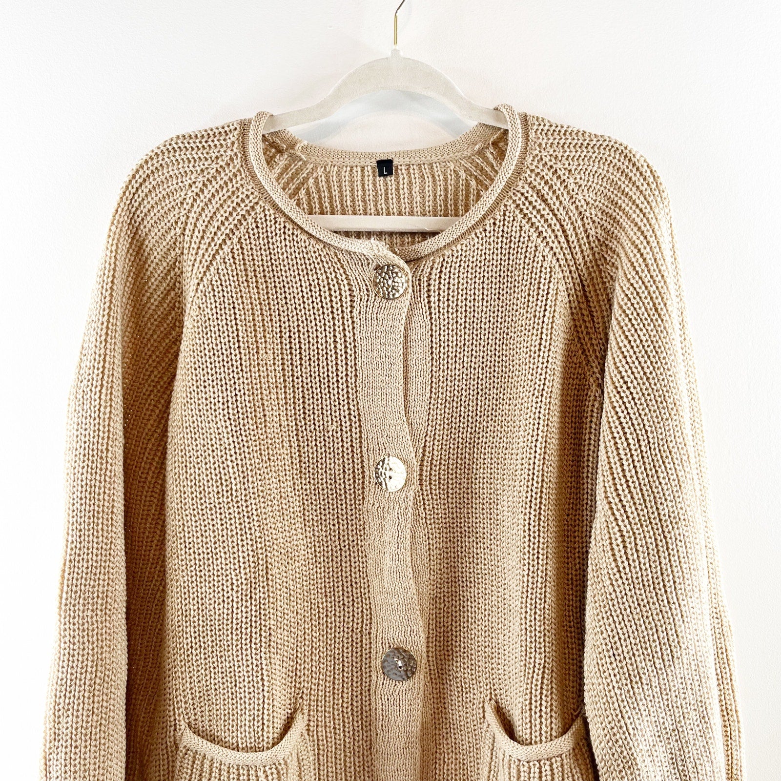 Chunky Long Sleeve Gold Button Cardigan Sweater Tan Beige Large