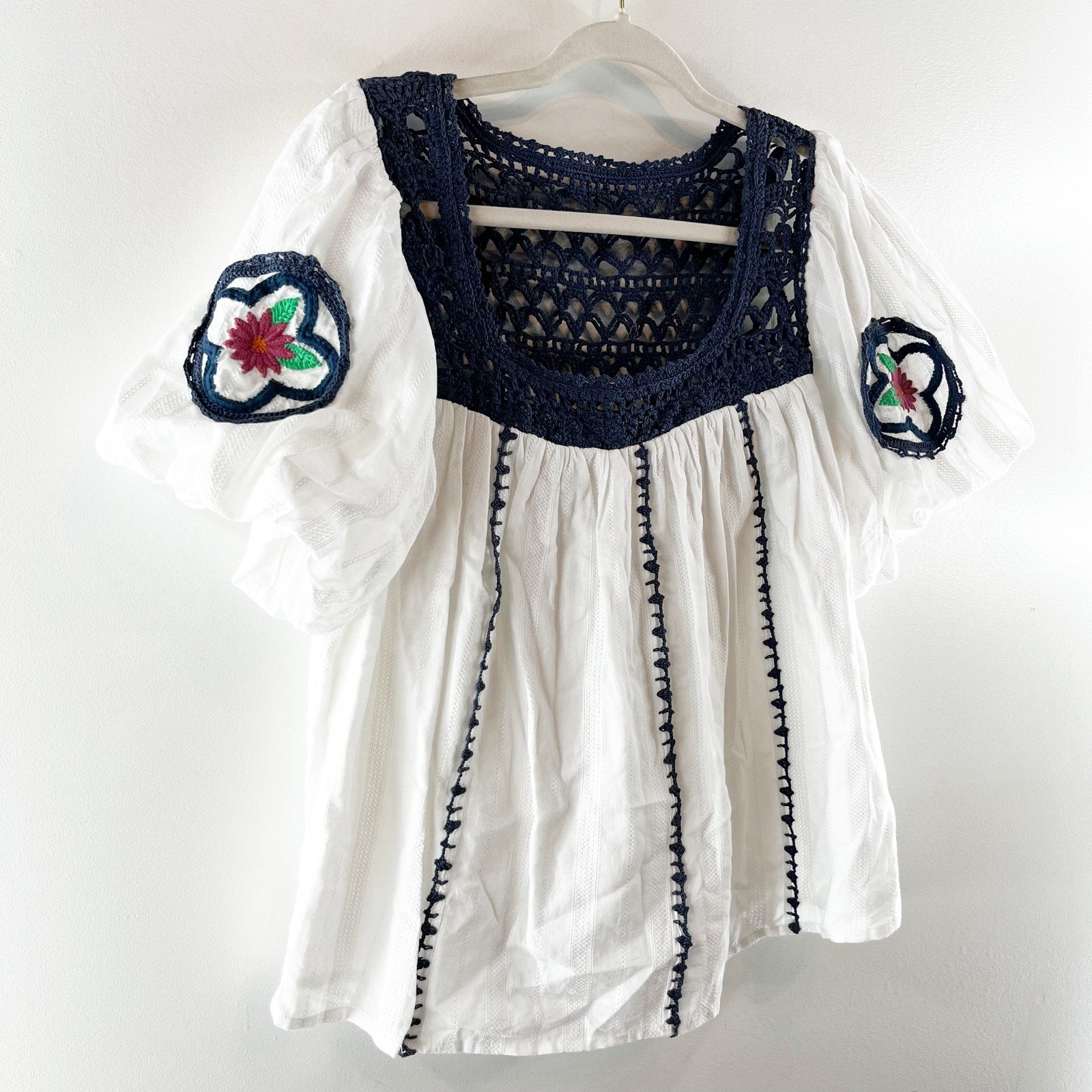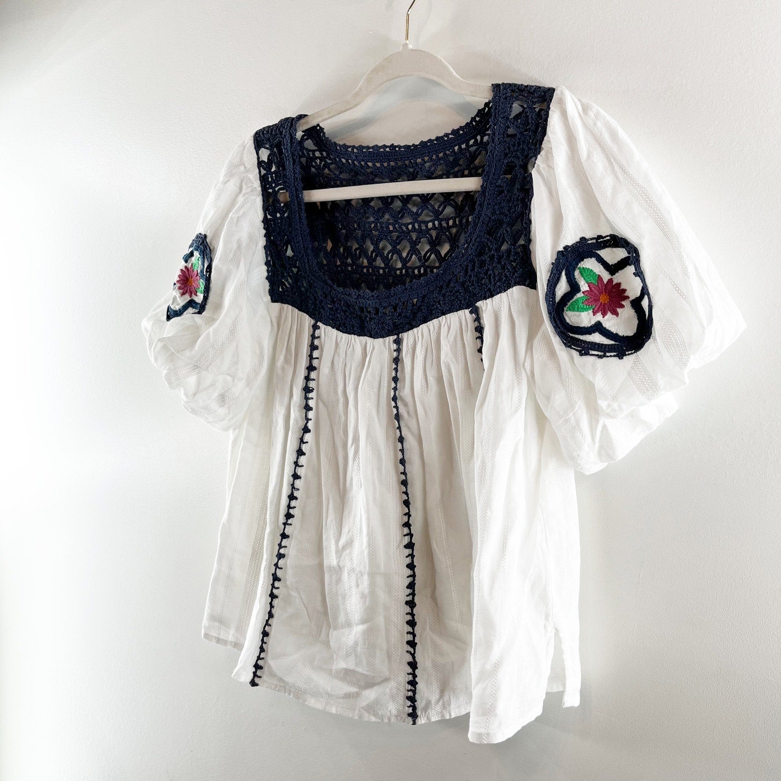 puff sleeve, crochet trim, organic cotton, square neckline, babydoll, blouse, boho-chic, bohemian, summer, top, navy blue, white