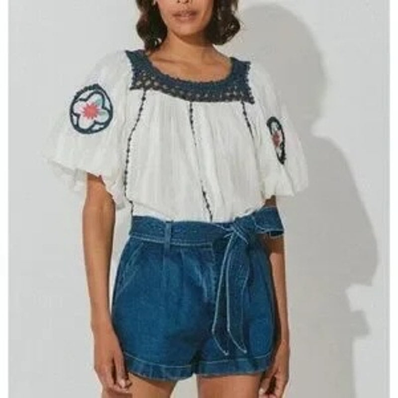 Cleobella Navi Organic Cotton Crochet Trim Puff Sleeve Blouse Top White Navy XS