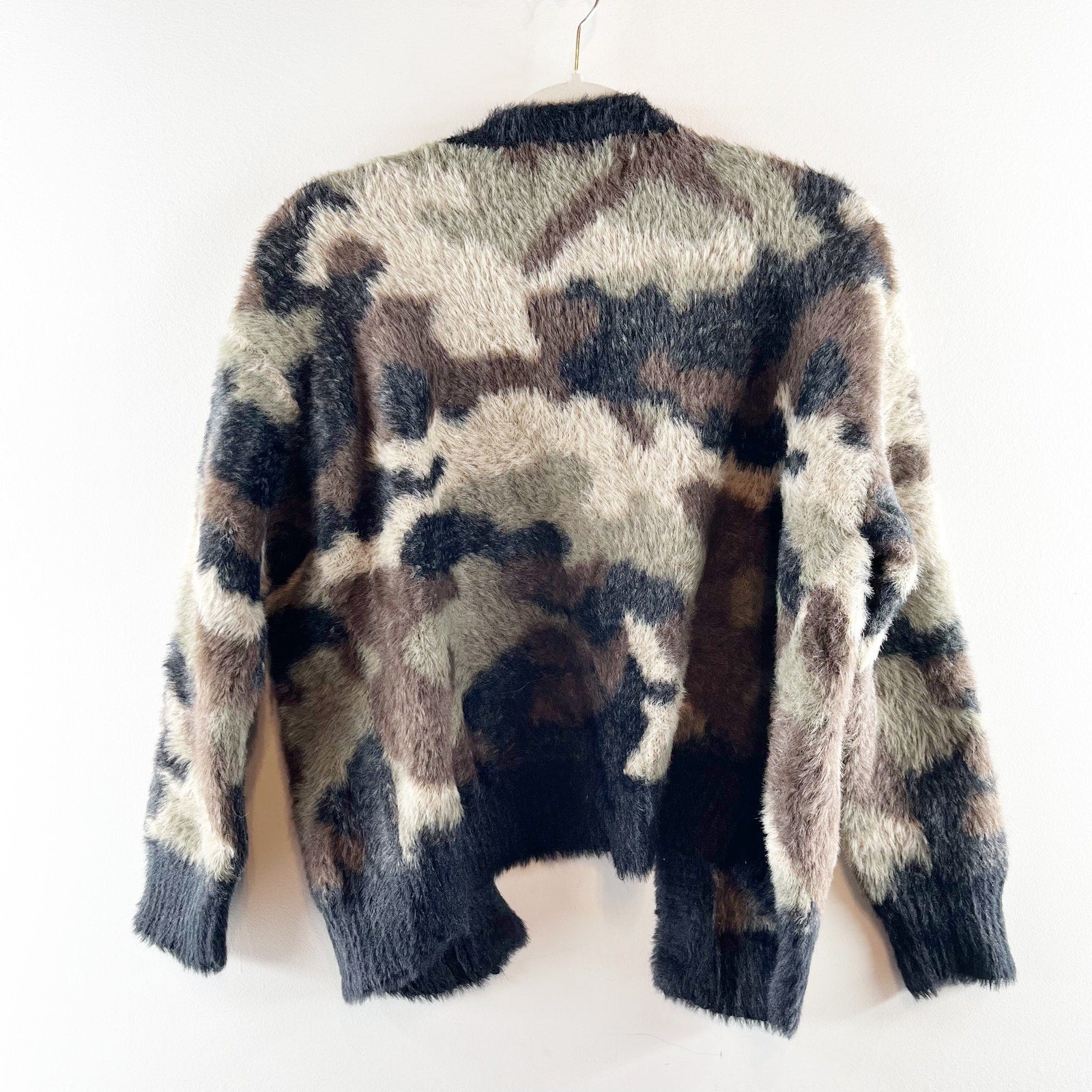 Cloth & Stone Camo Button Up Fuzzy Knit Cardigan Sweater Green Black Small