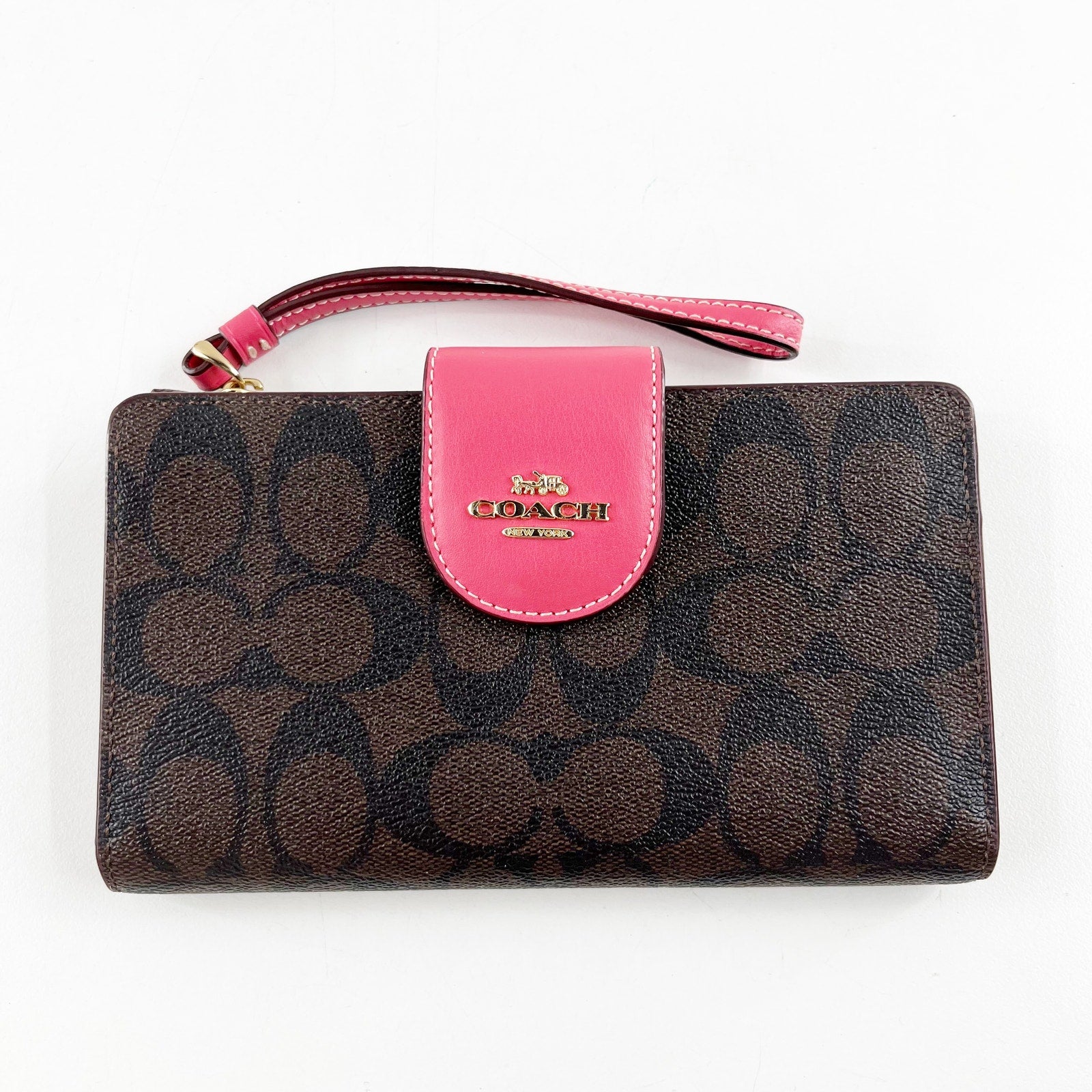 Coach Signature C Logo Canvas Tech Wallet Wristlet Brown Pink
