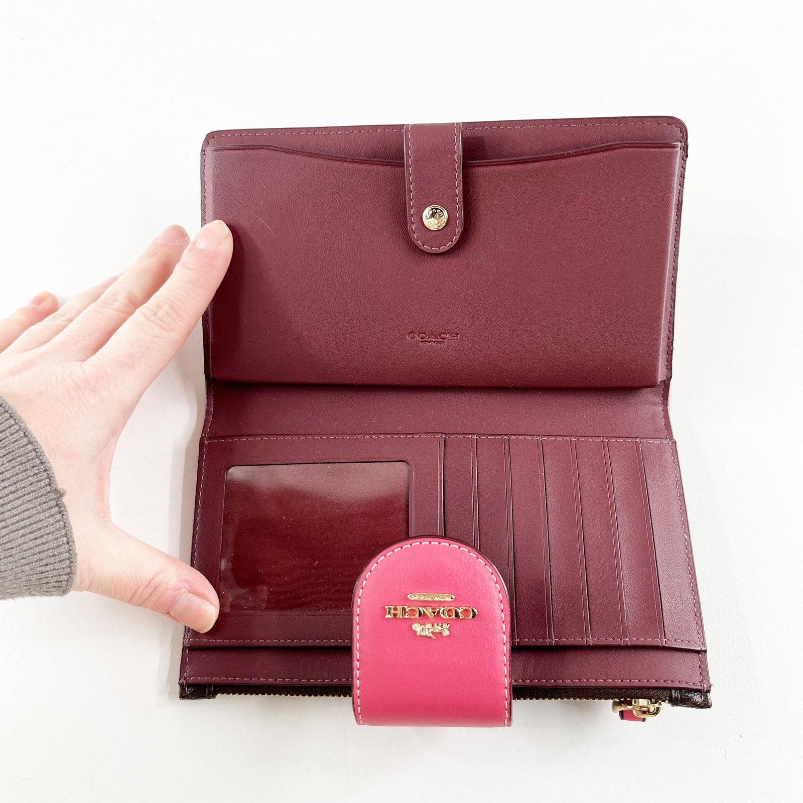 wallet, leather interior, card slots, id slot, cash slot, zip and snap closure, phone case, wristlet, brown, pink