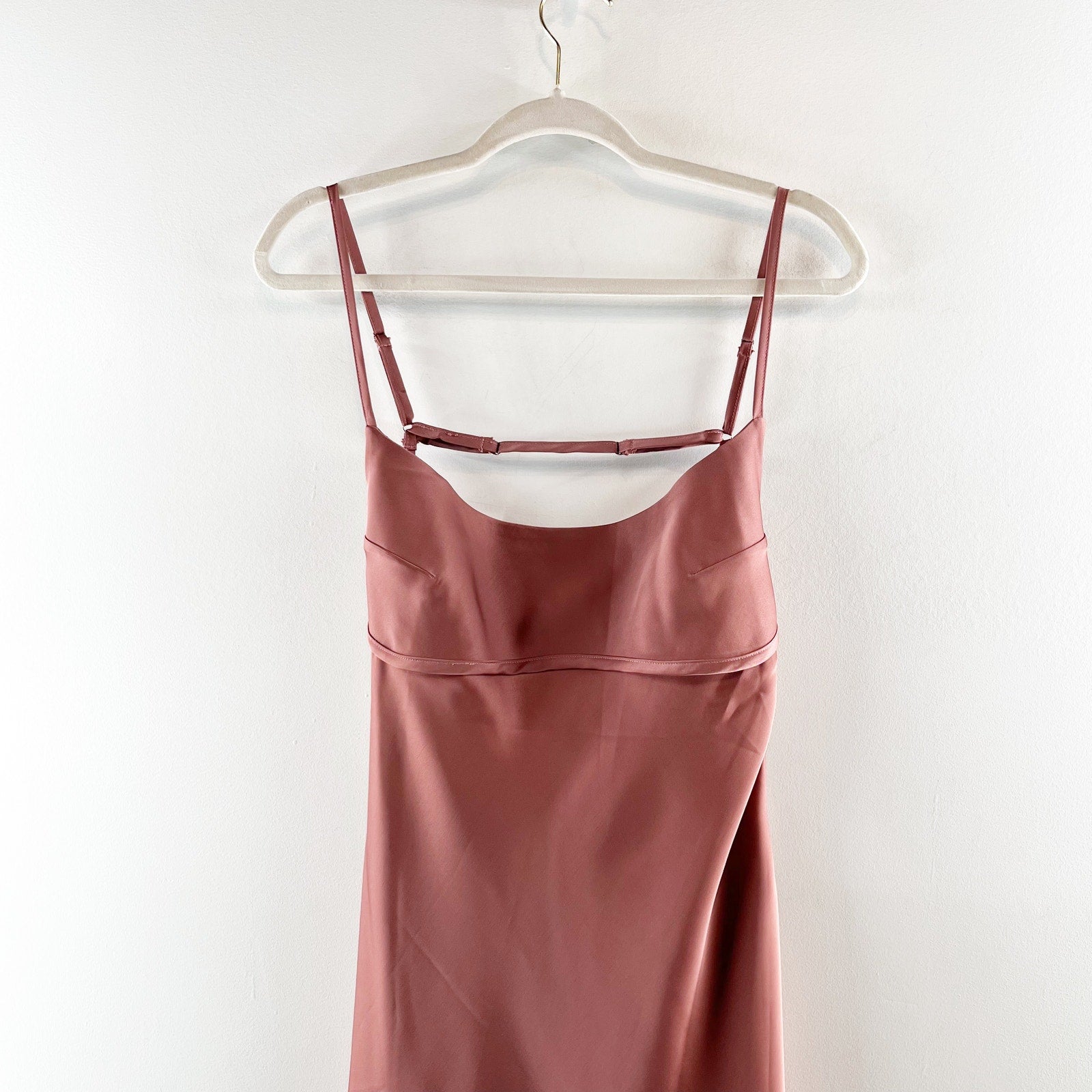 adjustable straps, low scoop back, rose, pink, dusty rose, midi, slip, satin
