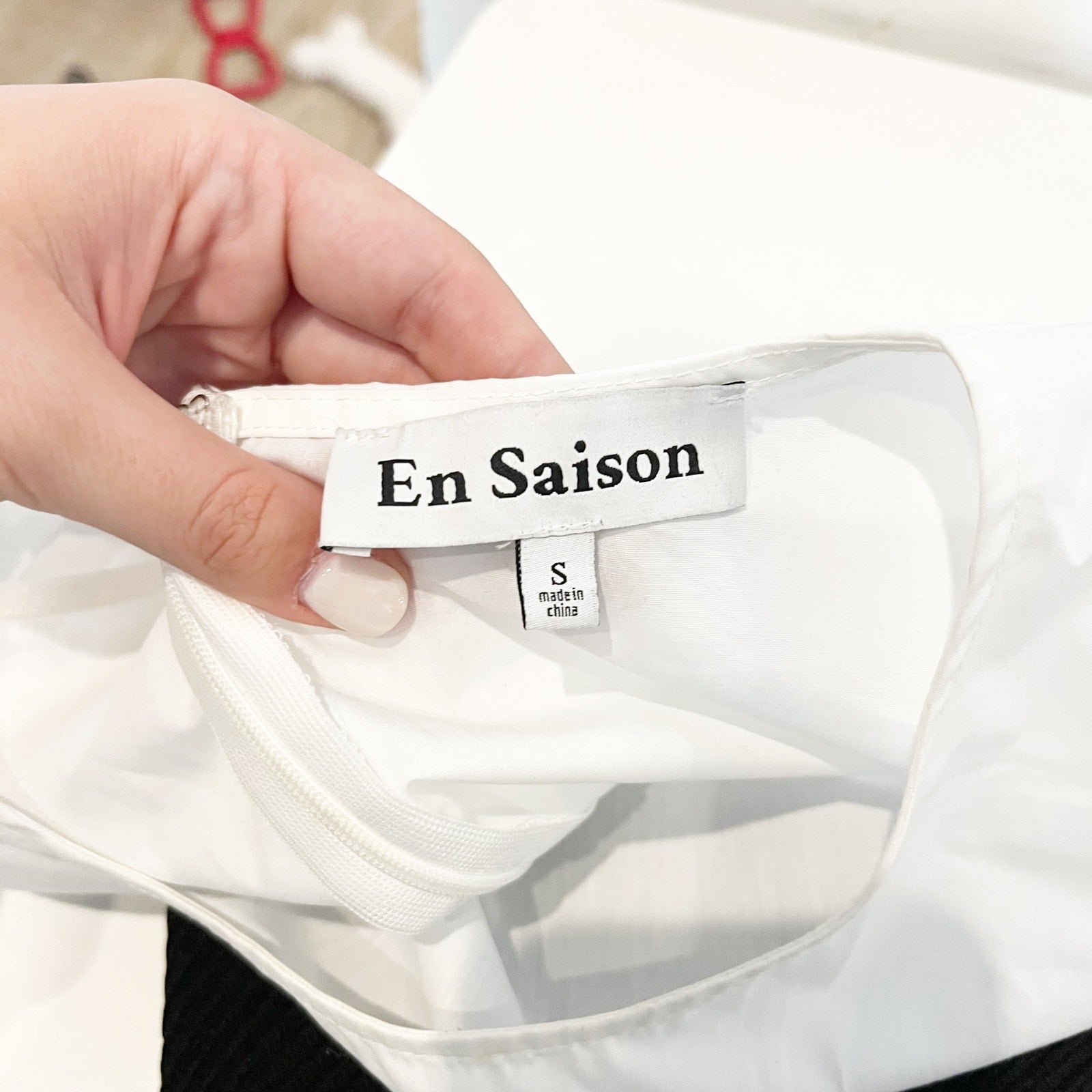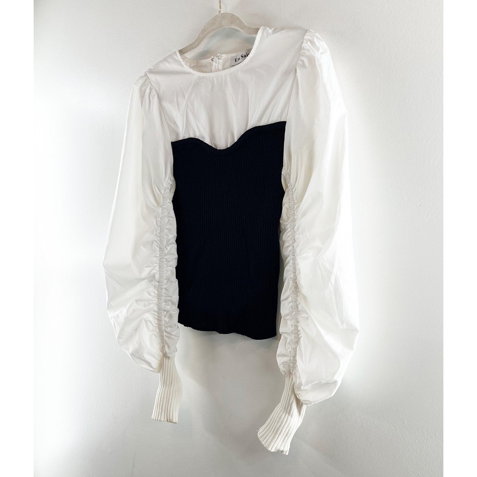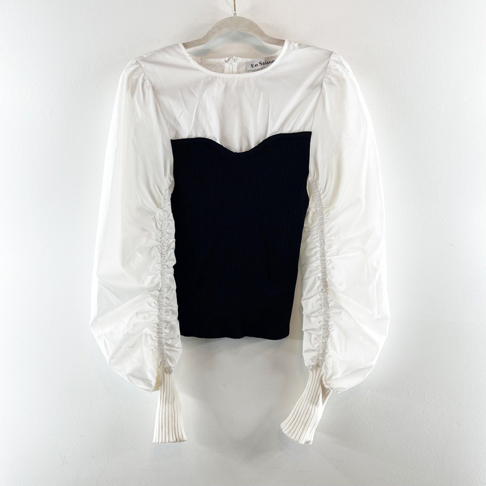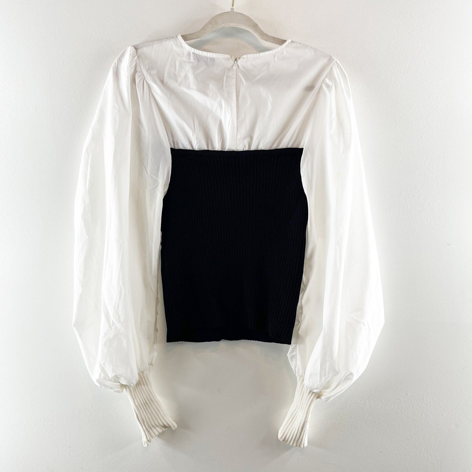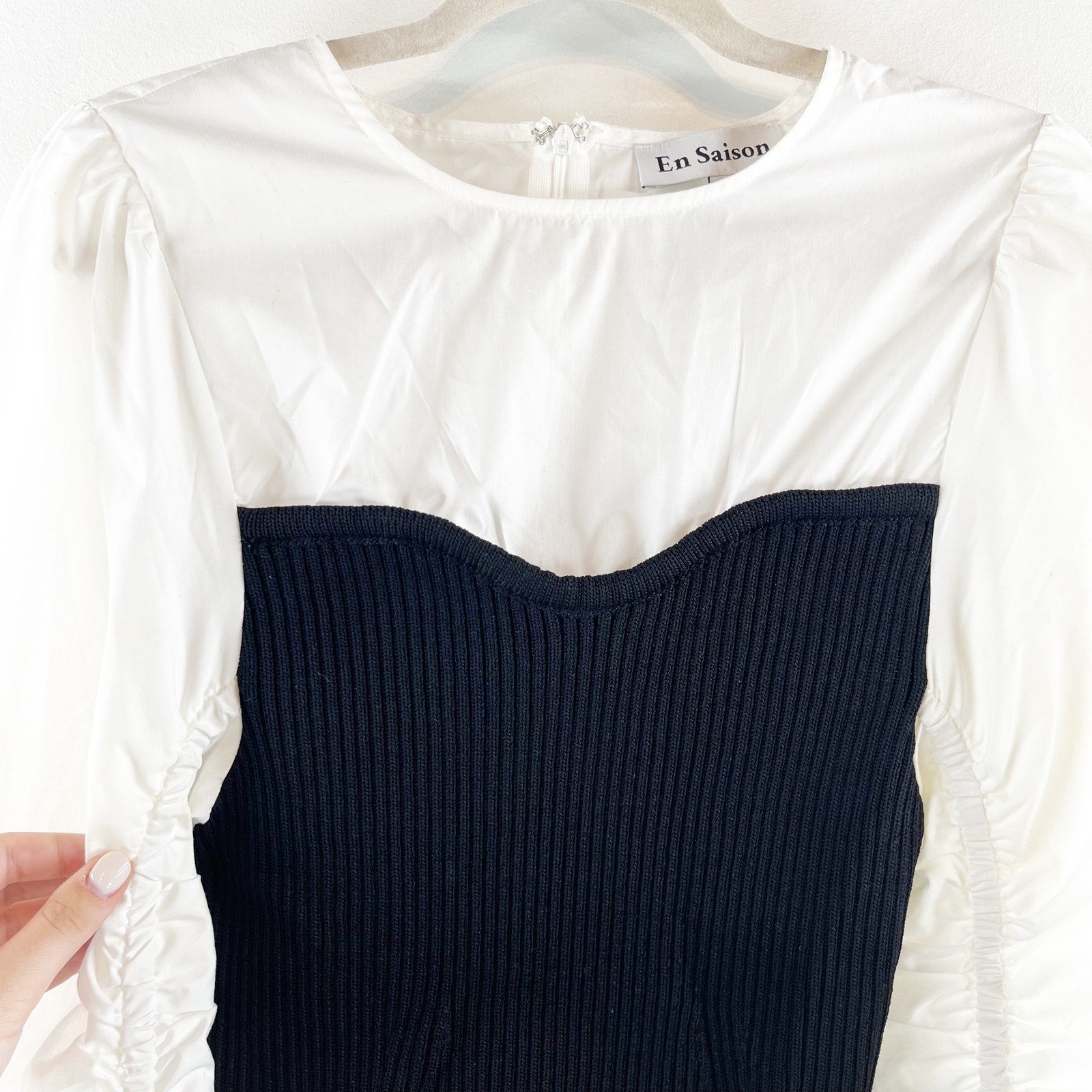 En Saison Mixed Media Long Sleeve Sweetheart Neck Top White Black Small