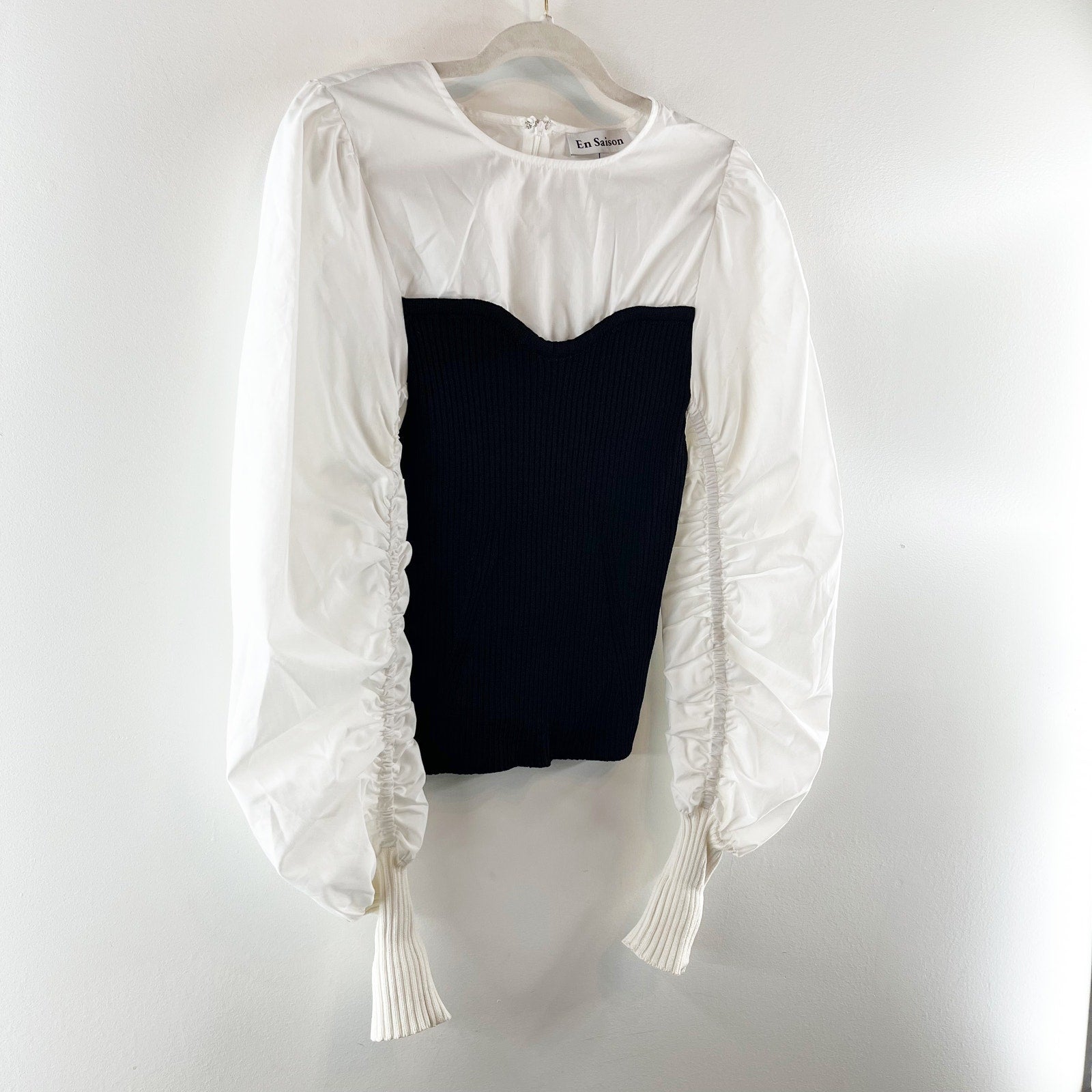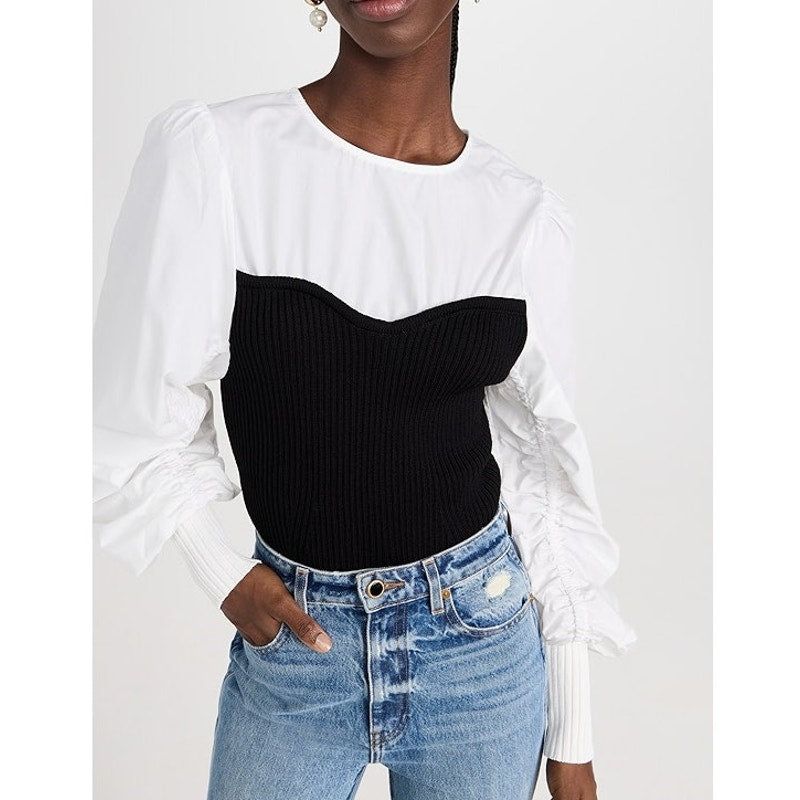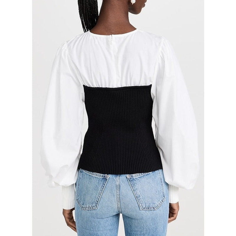 long sleeve, puff sleeve, non-stretch poplin, ribbed knit, mixed-media, shirt, top, casual, brunch, summer, work, minimalist, balloon sleeves, corset
