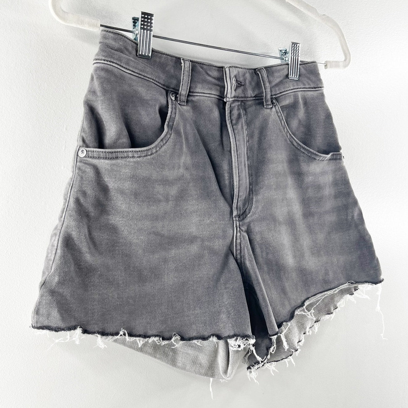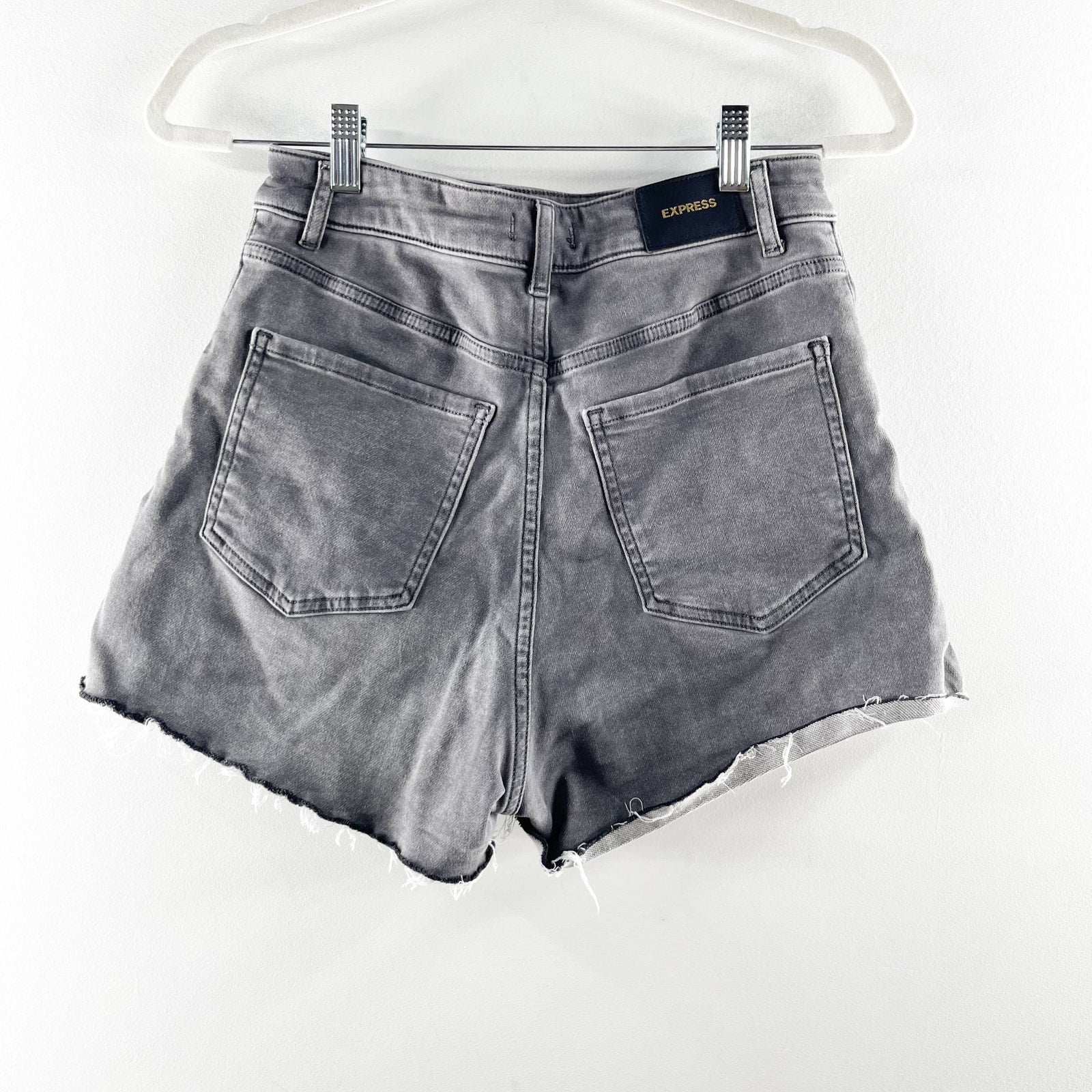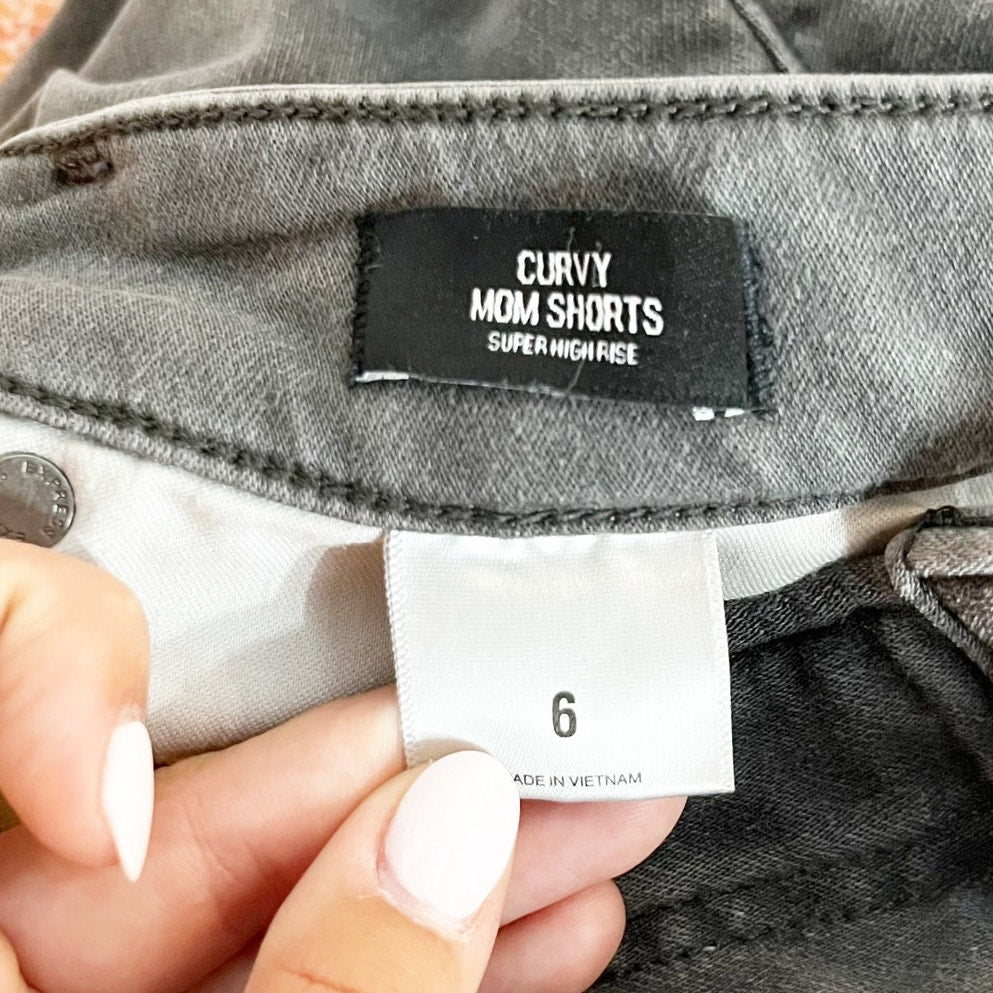 Express Super High Waisted Denim Raw Hem Curvy Jean Mom Shorts Faded Black 6