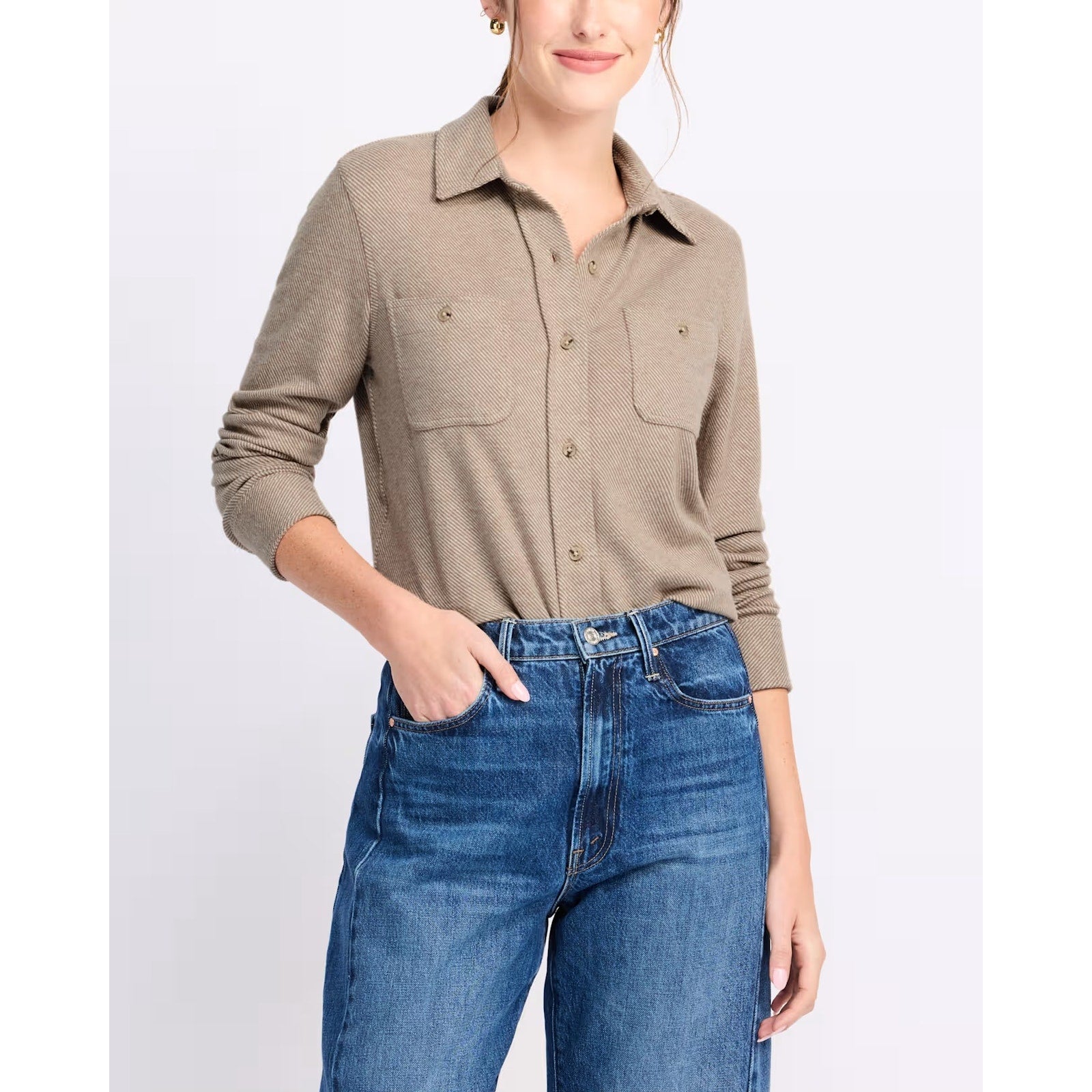 button down, subtle herringbone print, double chest pockets, soft, collar, long sleeve, shacket, shirt, tan, beige, camel, brown