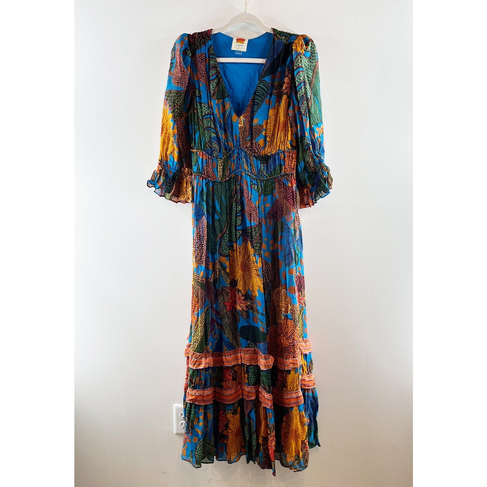 Farm Rio Anthropologie Puff-Sleeve Smocked Tiered Maxi Dress Blue Small