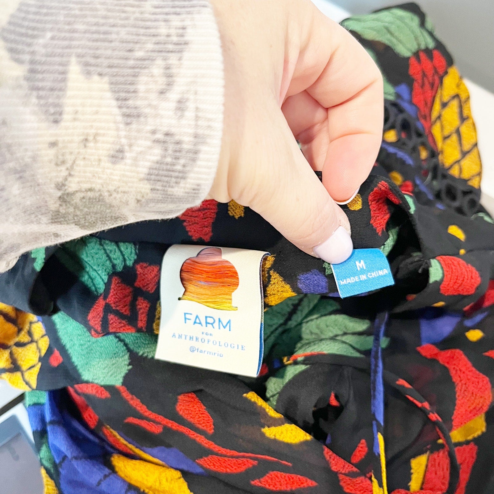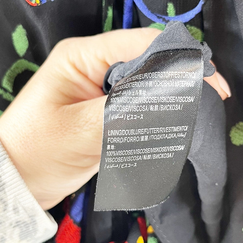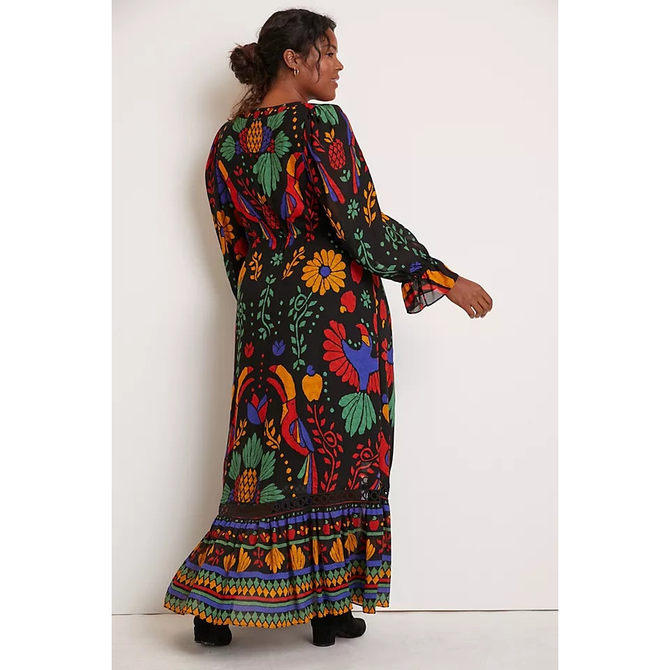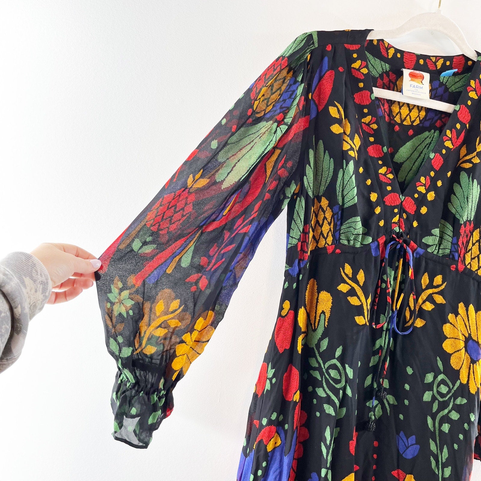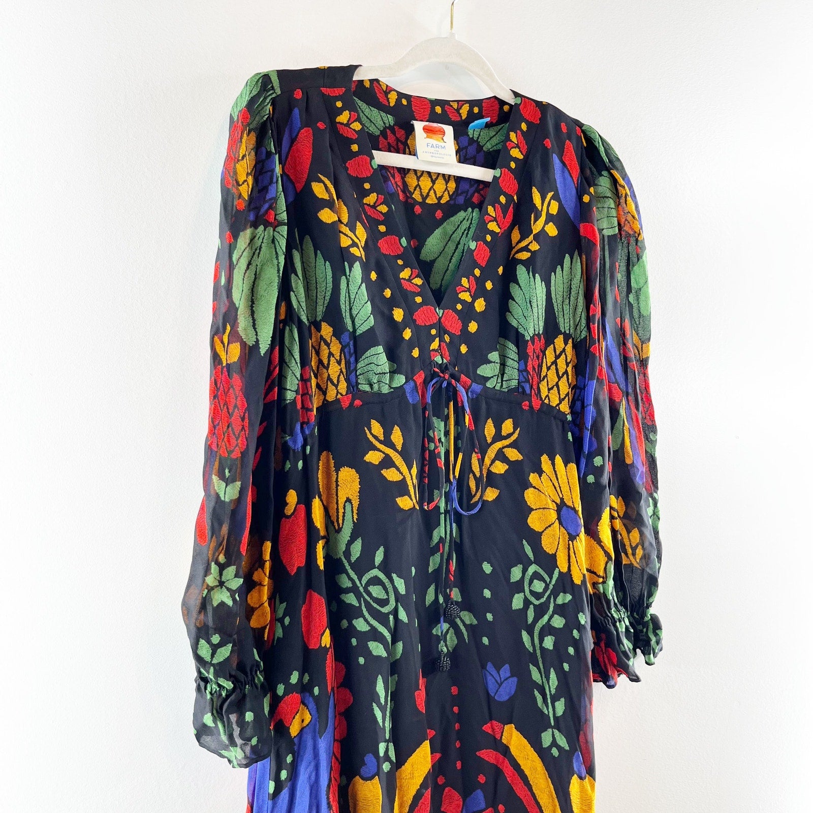 Farm Rio Georgette Tropical Puff Sleeve V-Neck Ruffle Maxi Dress Black Medium
