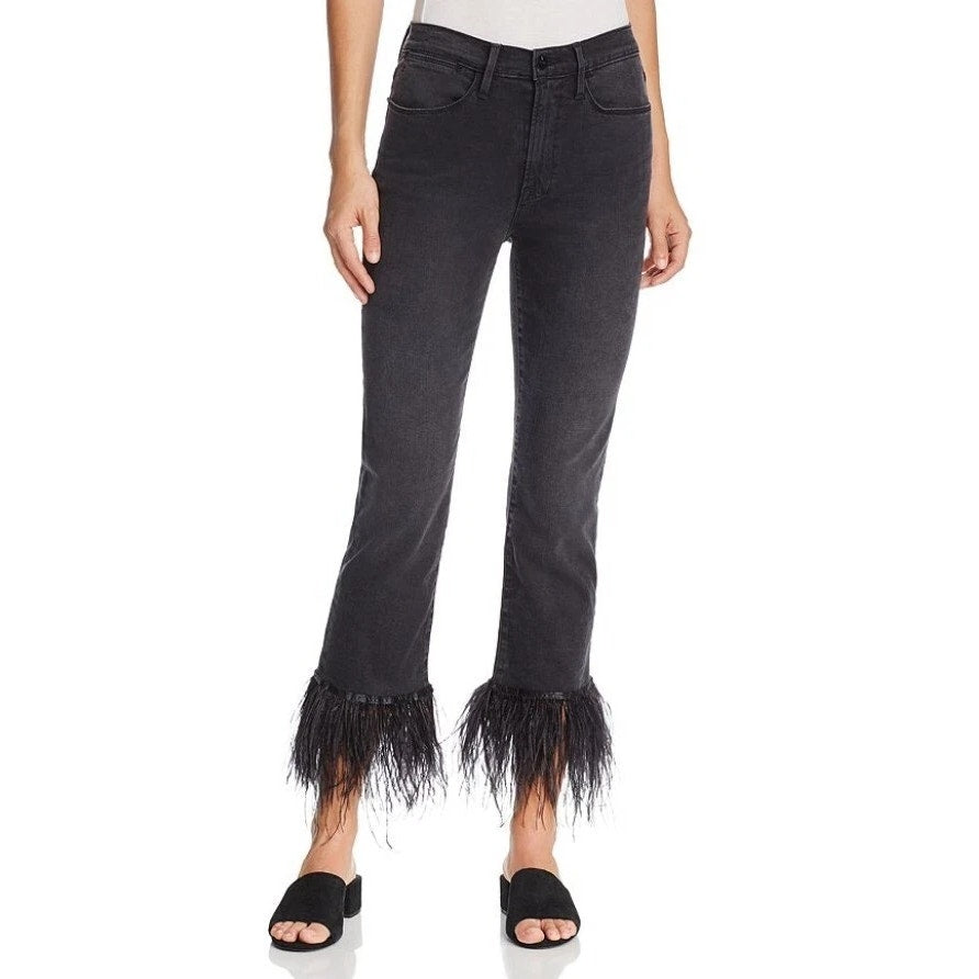 feather hem, cropped, denim, straight leg, jeans, high waisted, casual, streetwear, black, pockets, high rise
