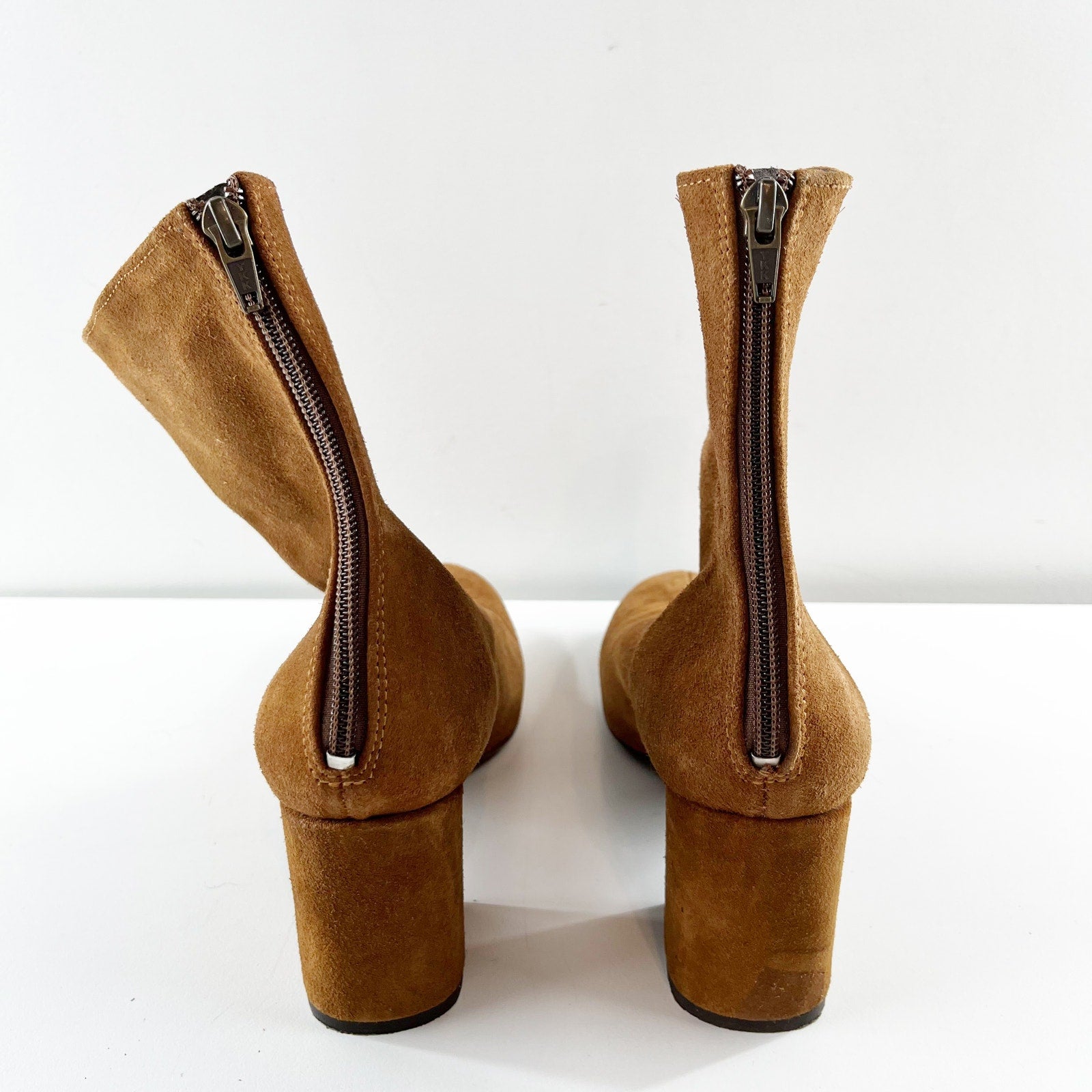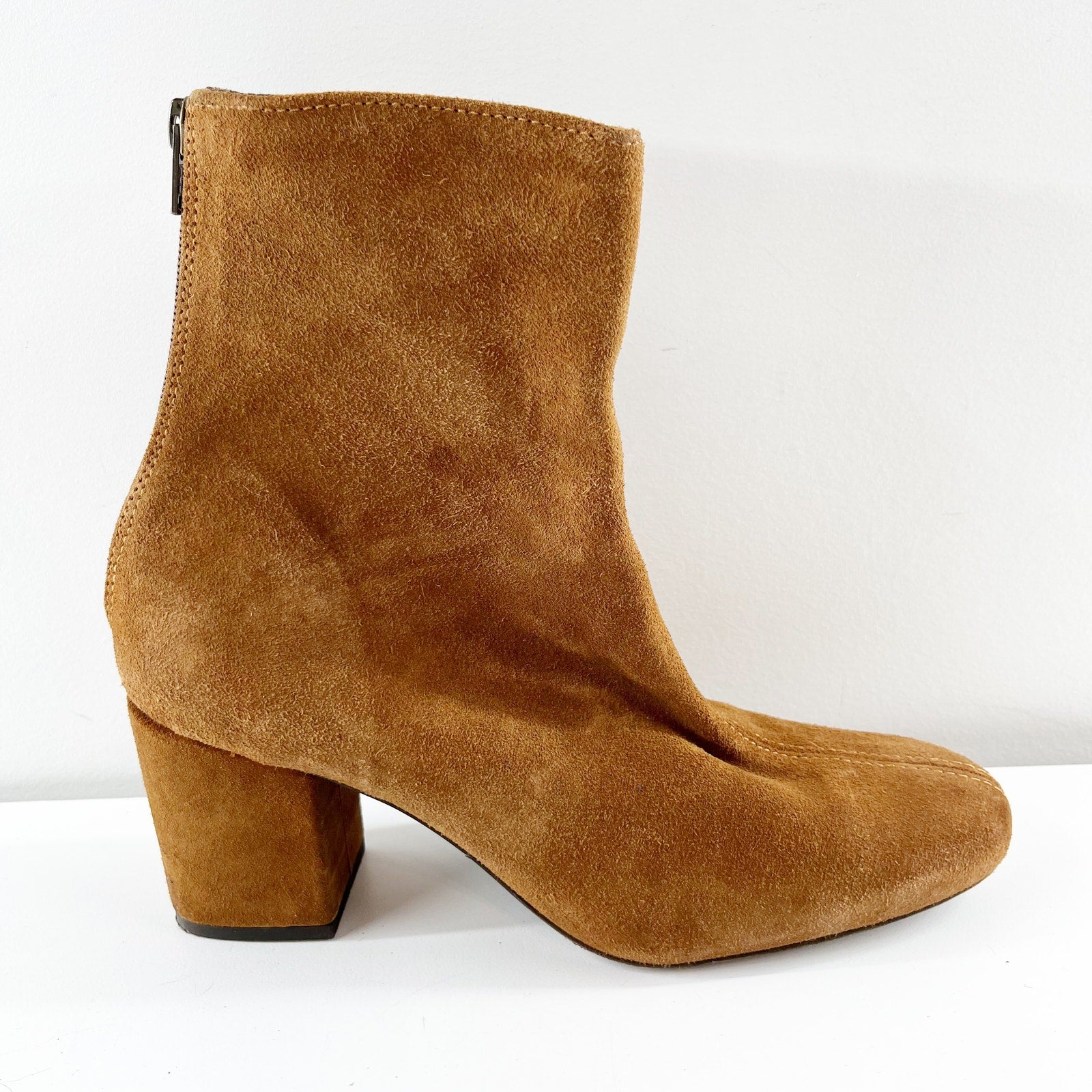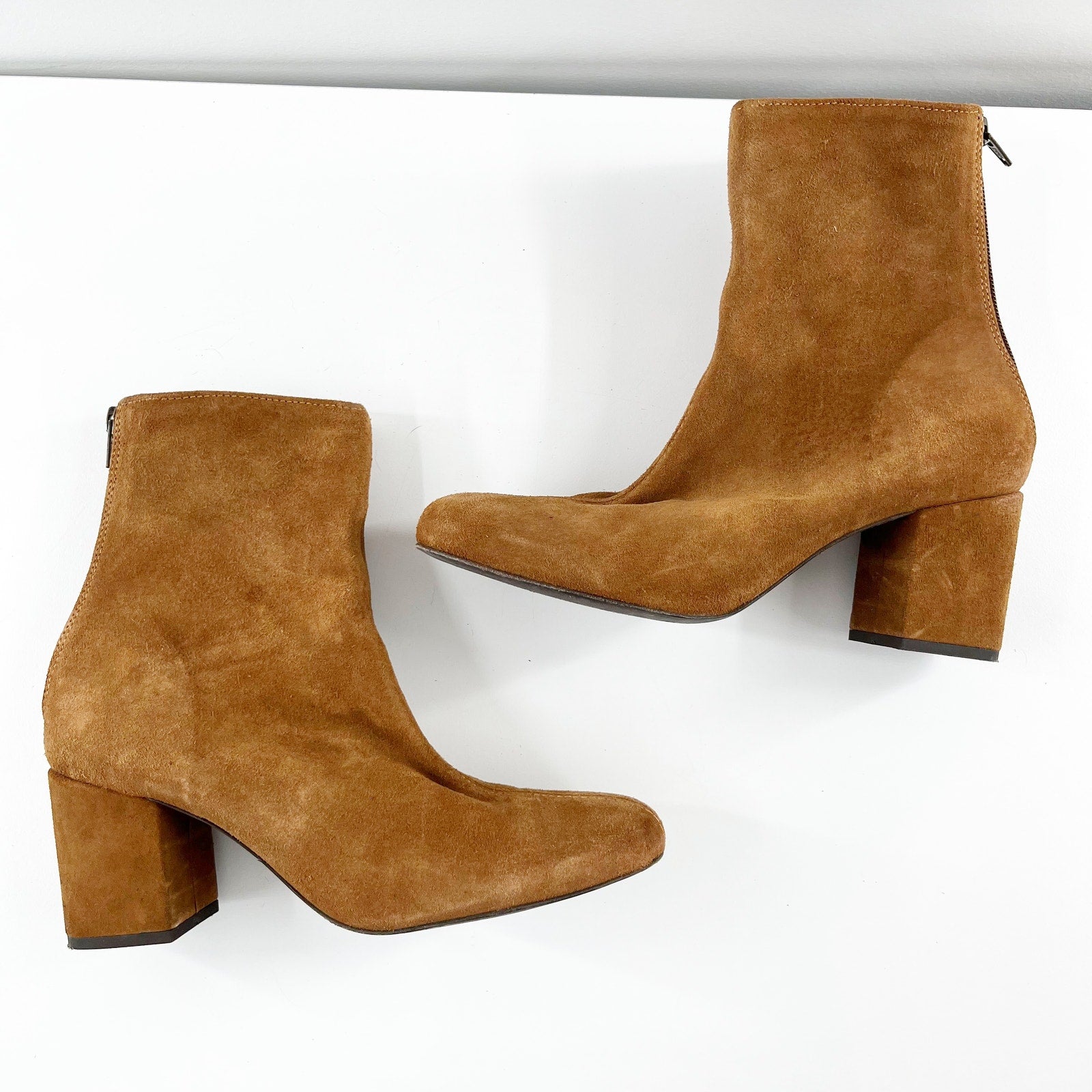 block heel, booties, leather, ankle, zip up, square toe, suede, brown, fall, winter