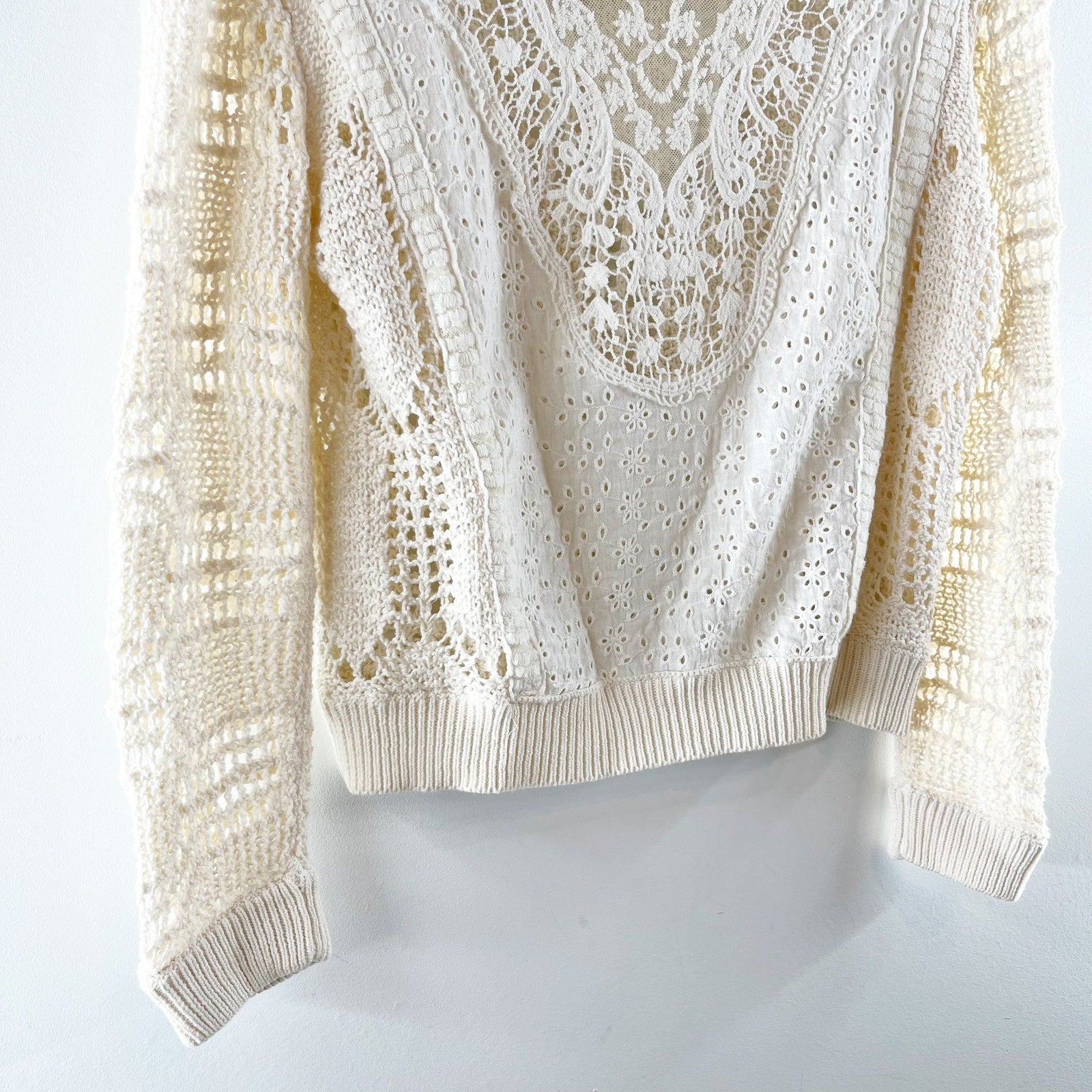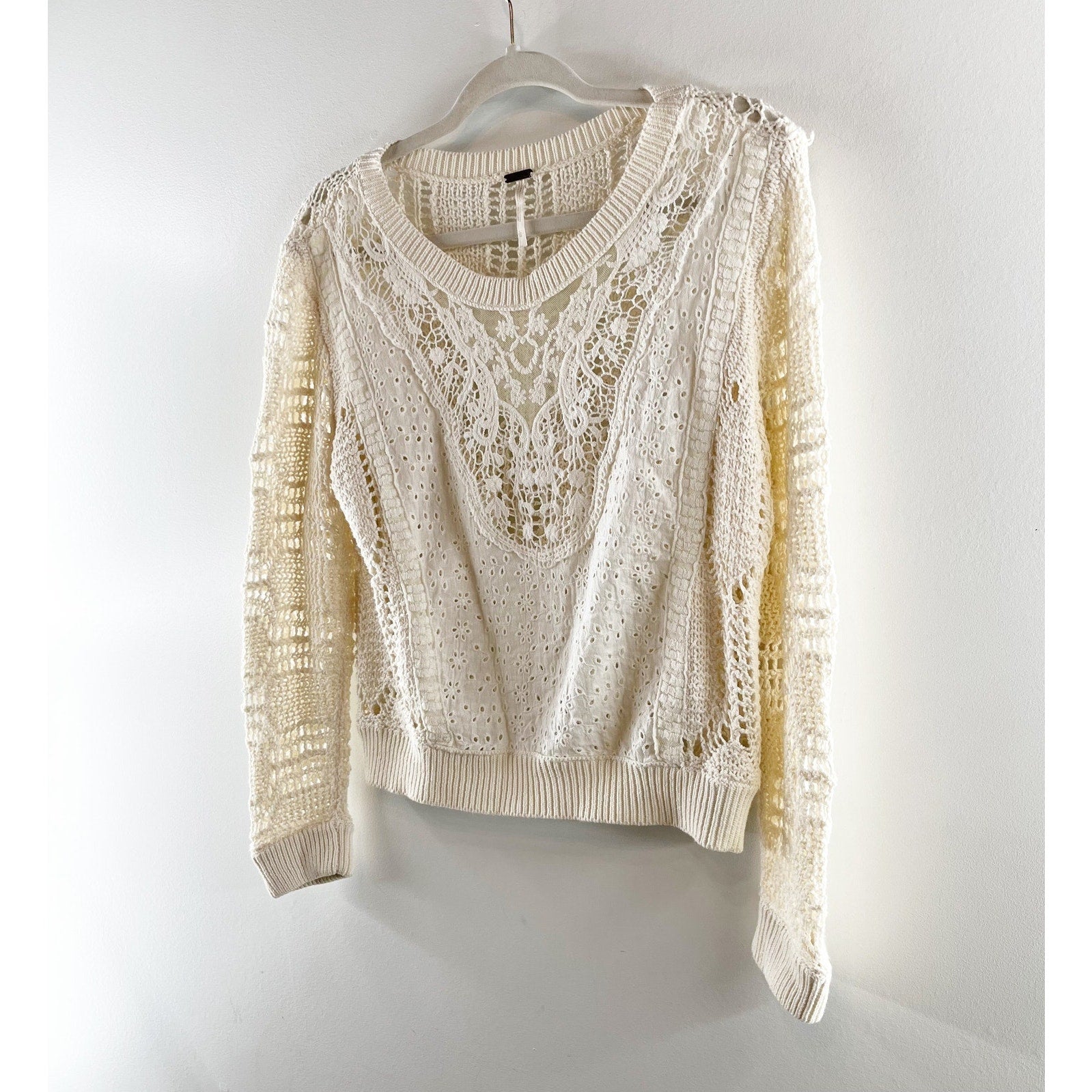 Free People Cotton Crochet Long Sleeve Crewneck Sweater Ivory Large